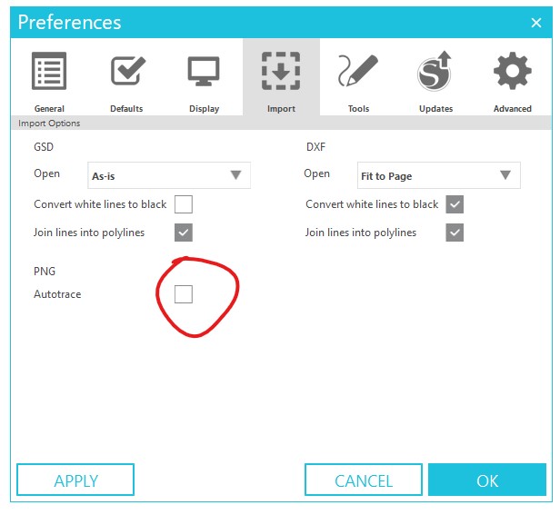 Before loading in the PNG, make sure that you have auto trace turned off. Go to Edit > Preferences. Then click on the “import” tab and uncheck auto trace next to “PNG”