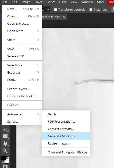 I have been setting up my full wrap mockups to be bulk mockups friendly, so generally, my files will have the smart object as the first layer. Select the “click icon to add art” layer. Then go to File > Automate > Generate Mockups…
