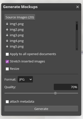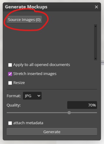 Clicking on the “source images” button will open a window and allow you to select as many images as you want. These are the images that will be inserted into the mockup’s smart object.