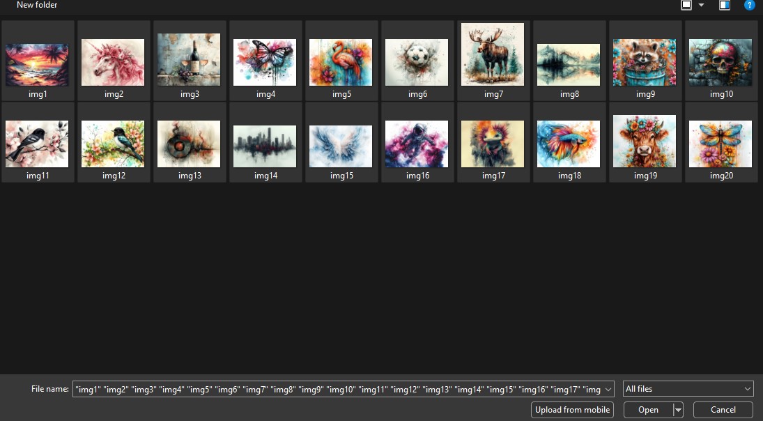Here I have selected 20 images that are totally not the right size for the 20oz tumbler, but I’m going to use them anyway and see how they place. So, I select them all and click on “Open”
