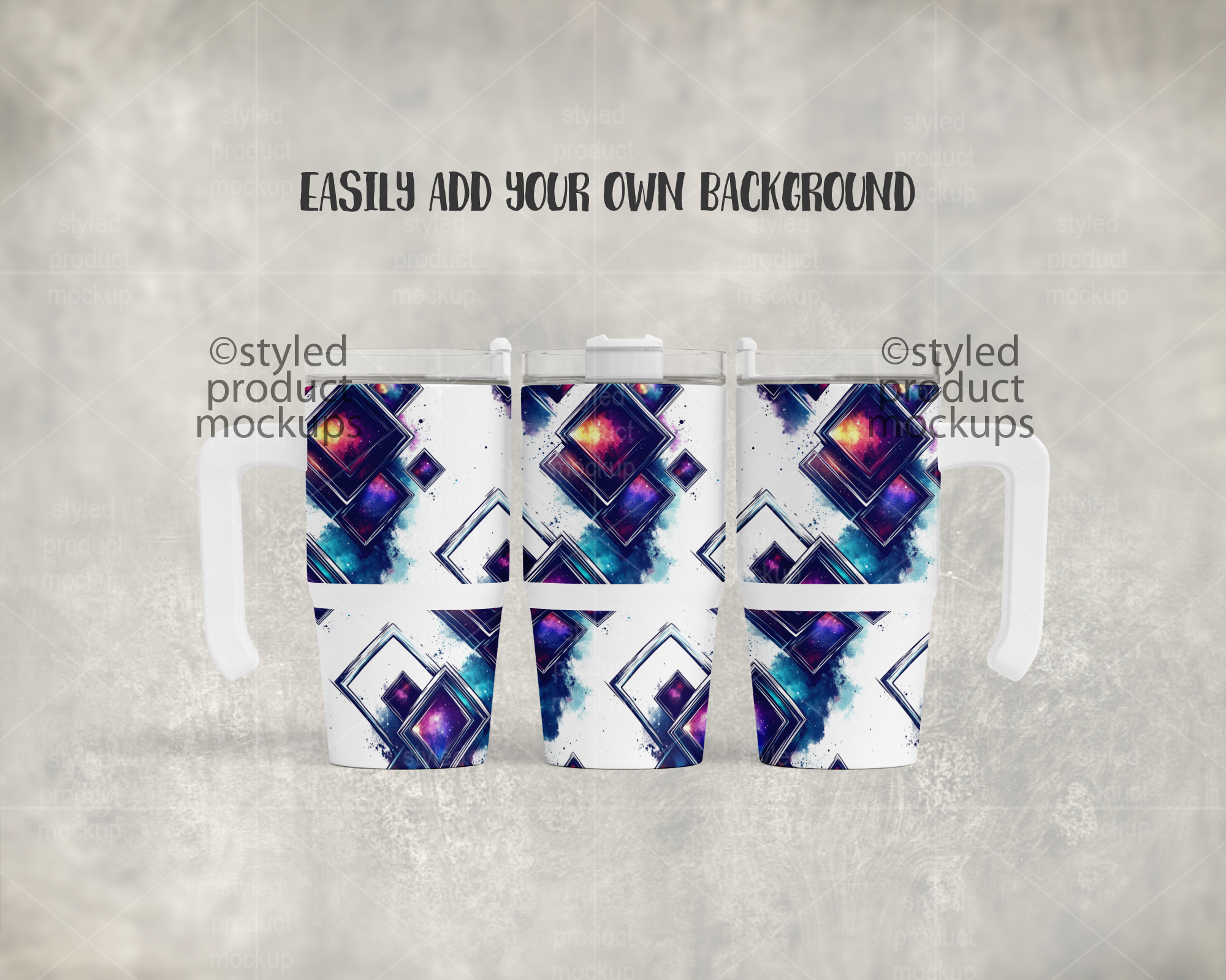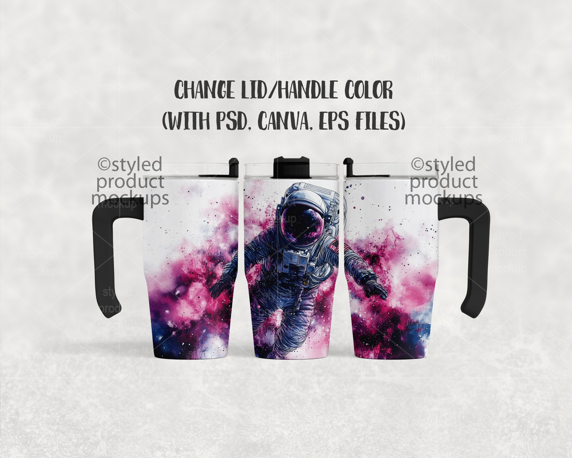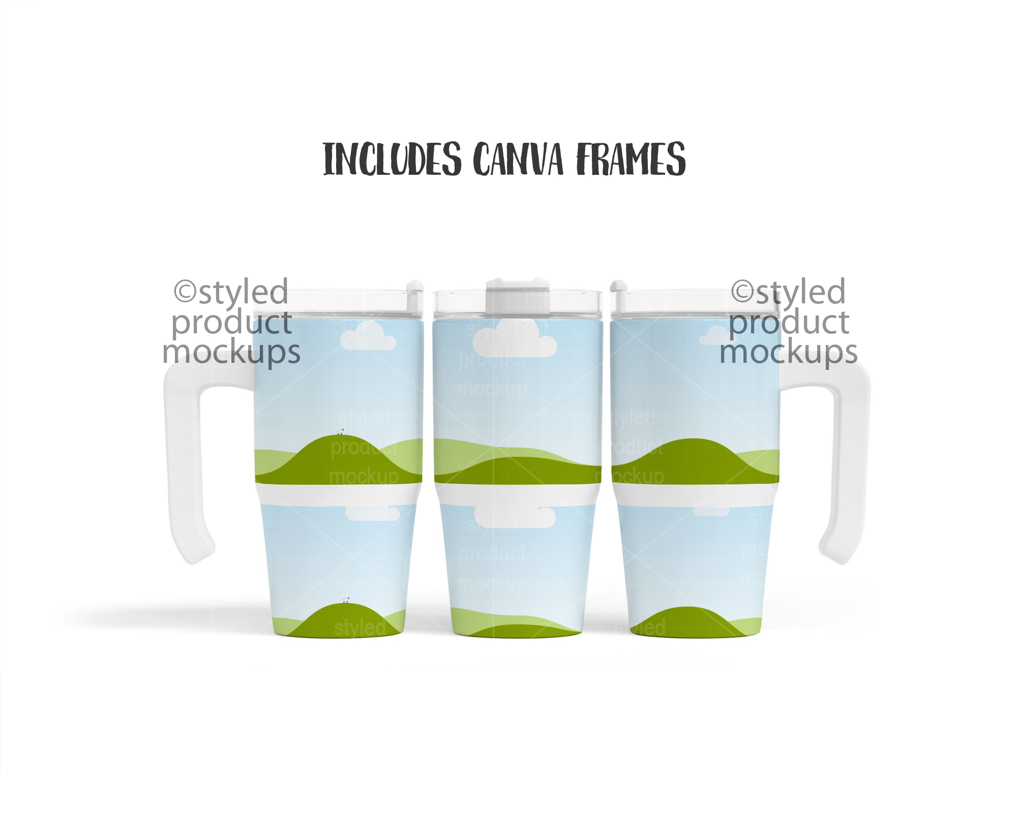 This listing is a mock-up that features a dye sublimation 12oz tumbler with handle. Give a professional touch to your tumbler designs without the hassle of photographing each one. This styled product mockups template is ready to use, simply add in your own art files and background.