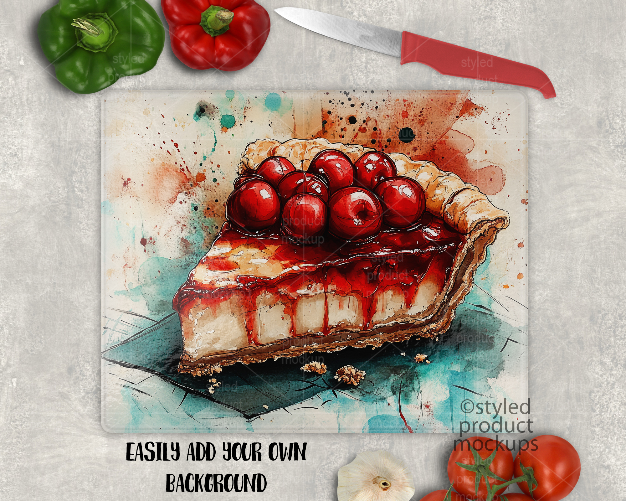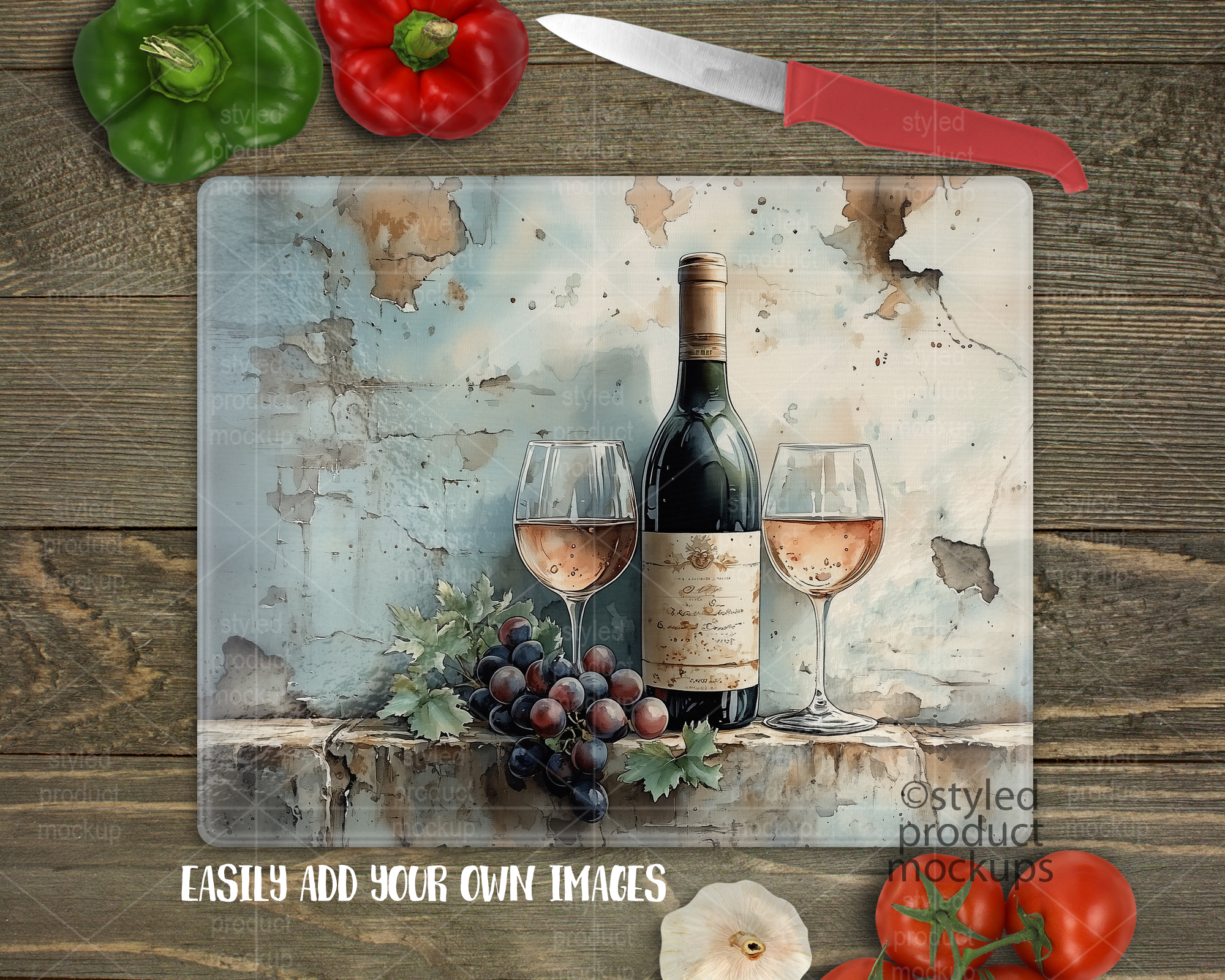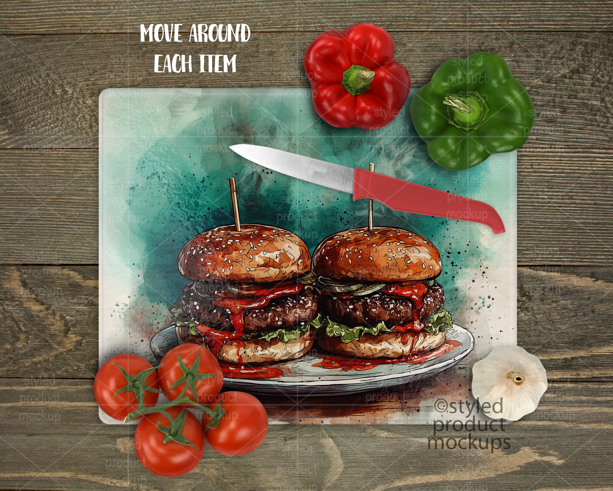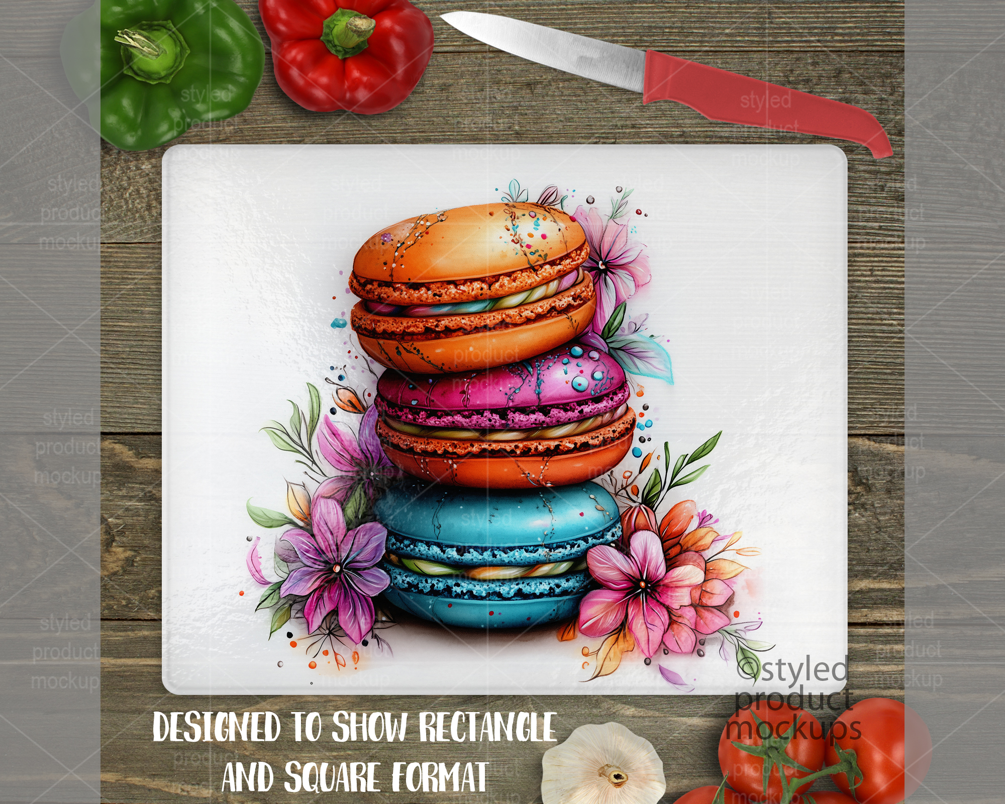 This listing is a mock-up that features a dye sublimation pebble texture cutting board measuring 12×15 inches. Give a professional touch to your cutting board designs without the hassle of photographing each one. This styled product mockups template is ready to use, simply add in your own art files and background.