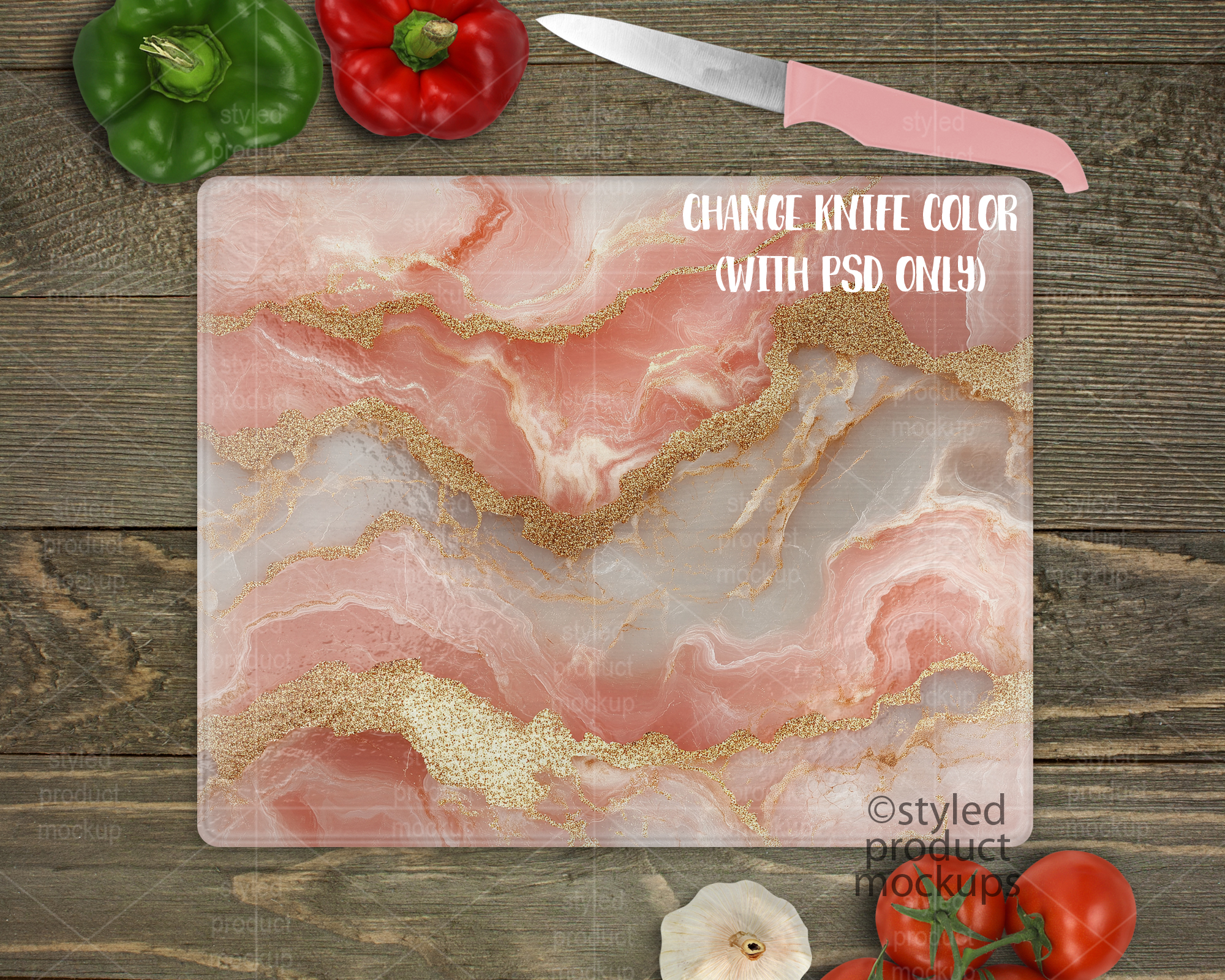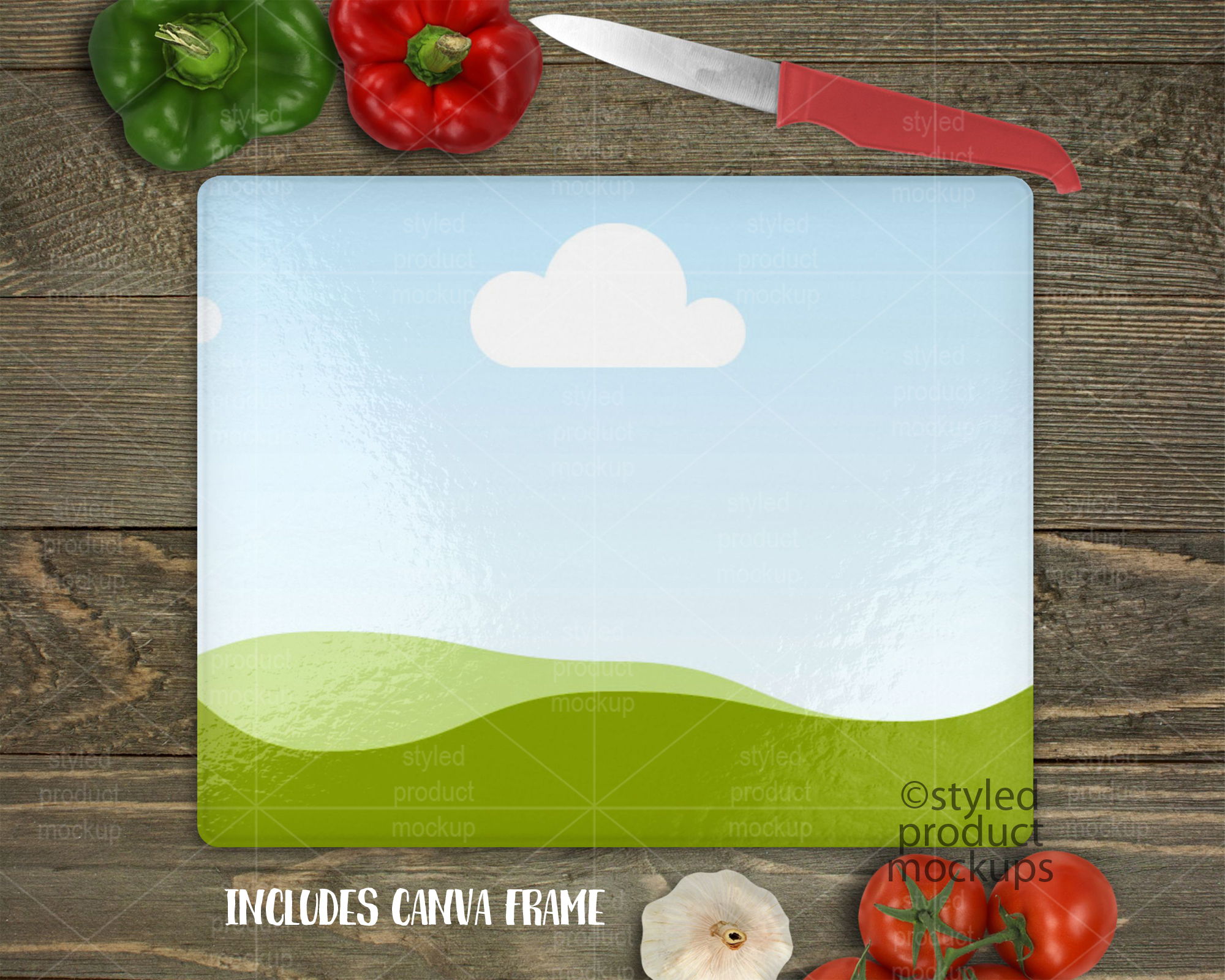 – PNG files for other programs which have a transparent window cut out of the image area on a white or wood background. Resize and adjust to fit the image area. You cannot change the background with the PNG files. Note: The vegetables and knife are in separate files so you can choose where to place them. You can’t change the knife color with the PNG files. Download includes red and black.