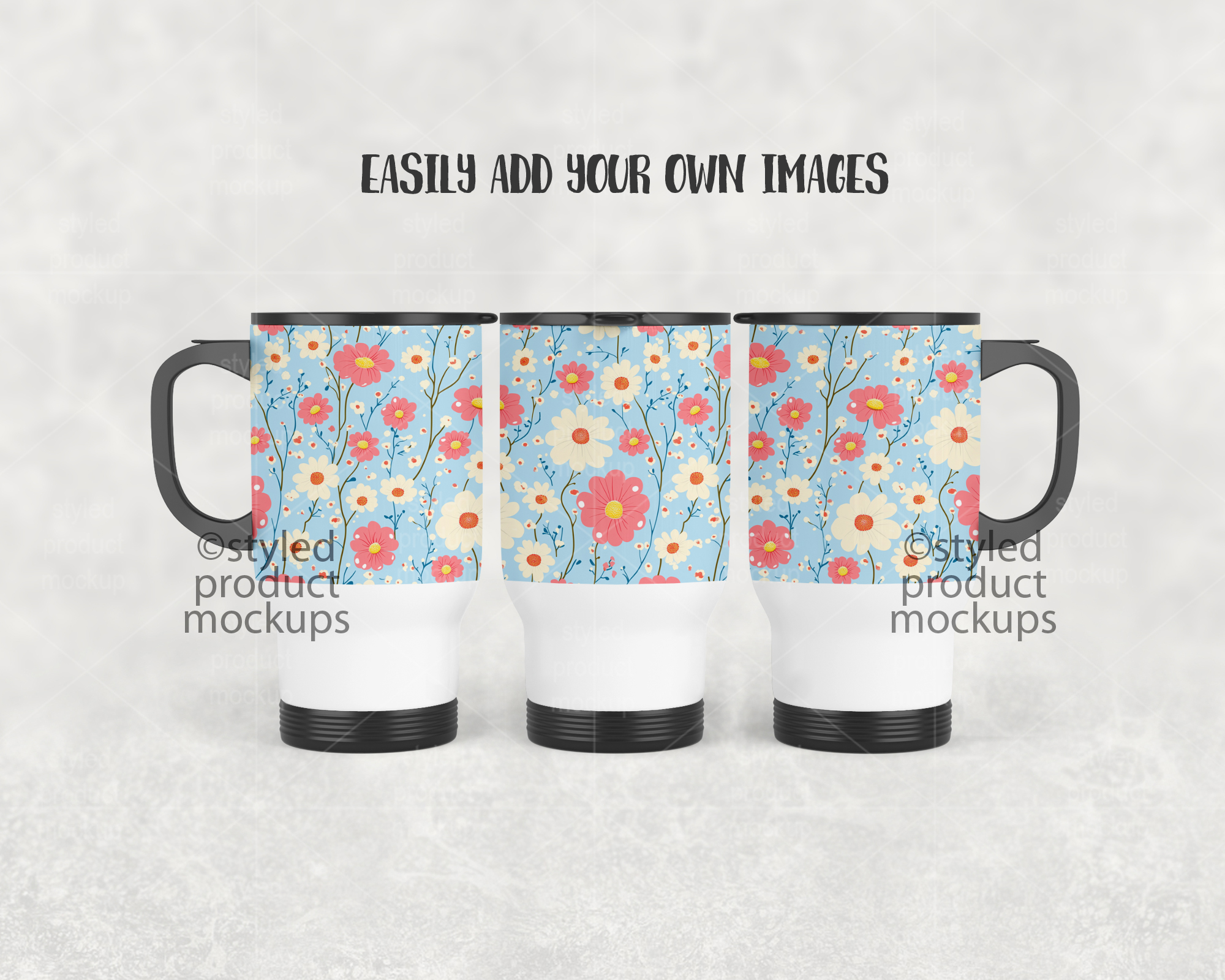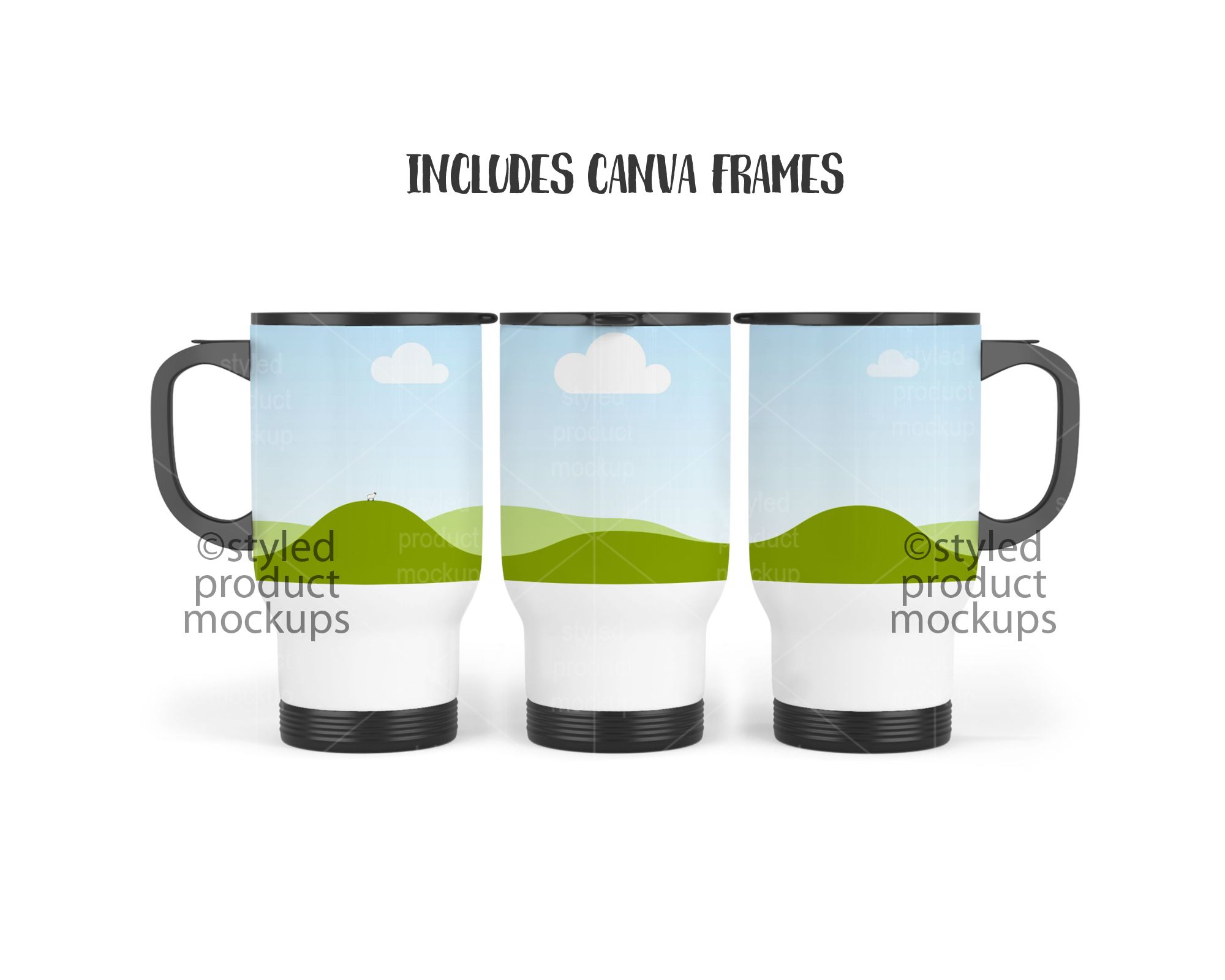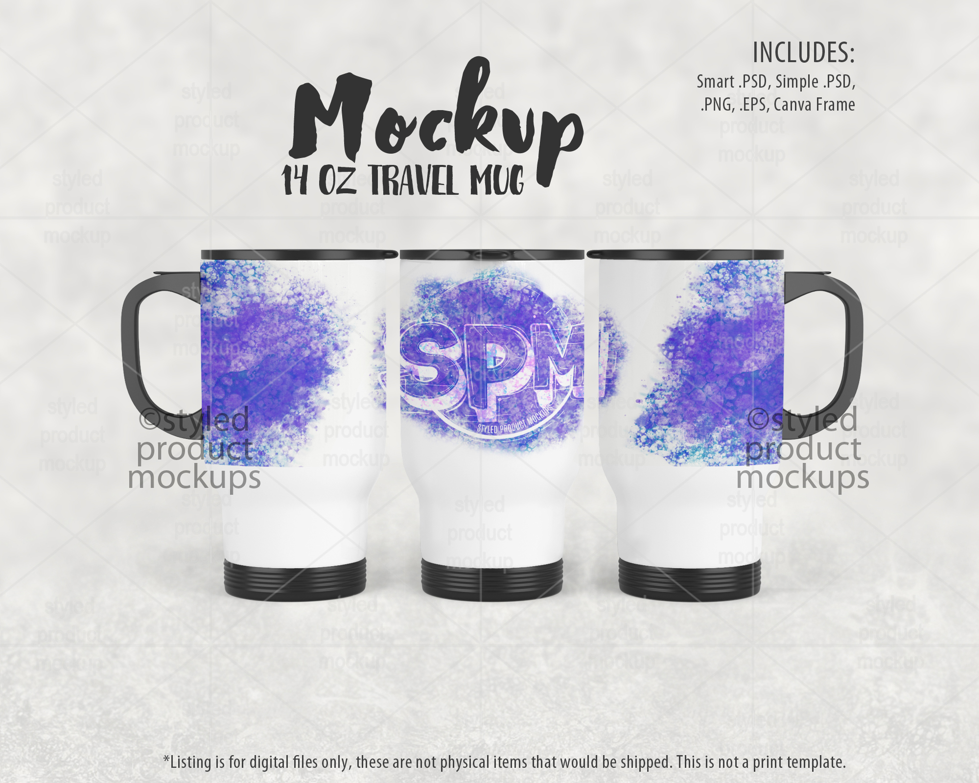 This listing is a mock-up that features a dye sublimation 14oz travel mug shown in a full wrap view. Give a professional touch to your tumbler designs without the hassle of photographing each one. This styled product mockups template is ready to use, simply add in your own art files and background.