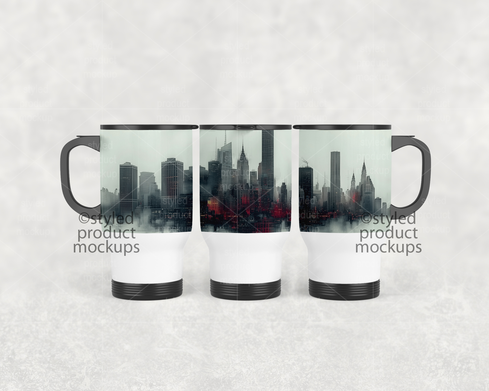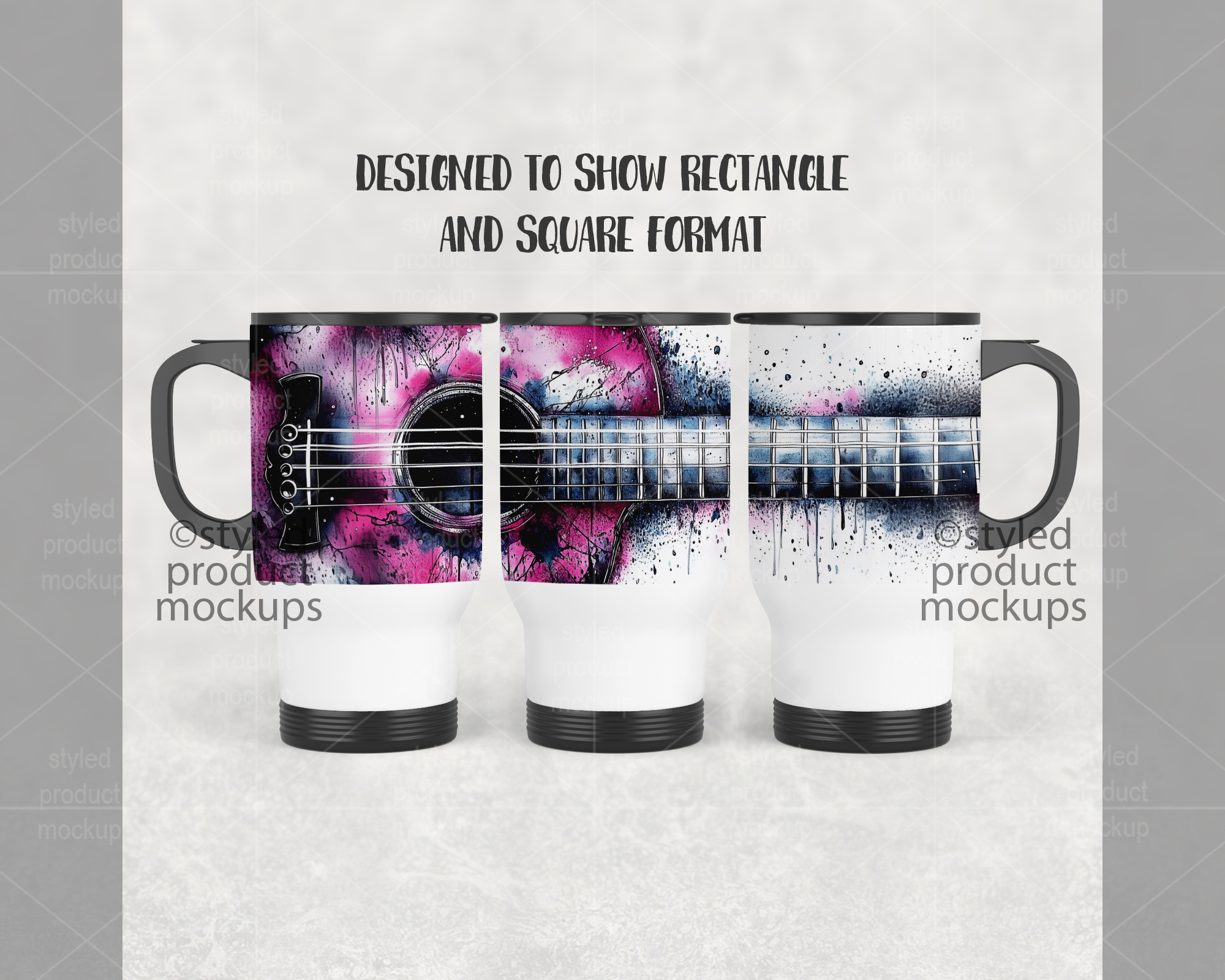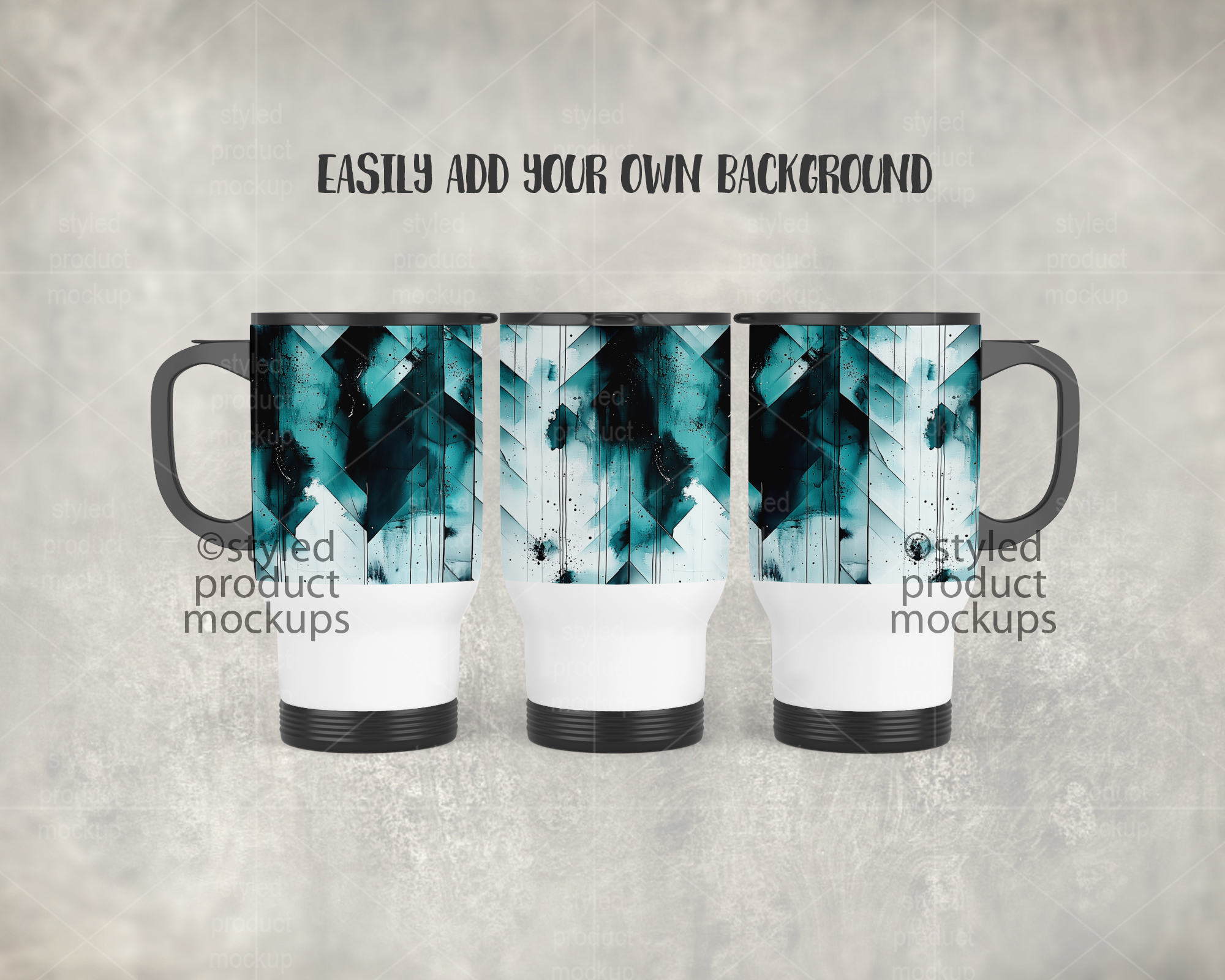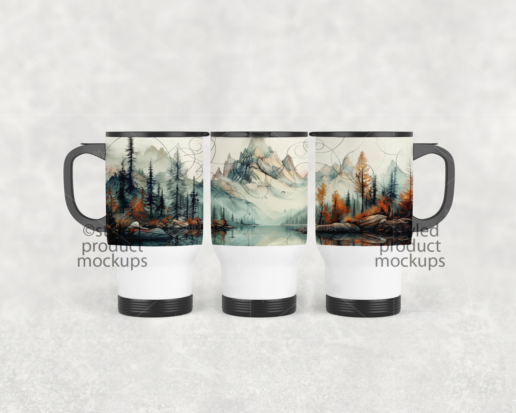 This listing is a mock-up that features a dye sublimation 14oz travel mug shown in a full wrap view. Give a professional touch to your tumbler designs without the hassle of photographing each one. This styled product mockups template is ready to use, simply add in your own art files and background.