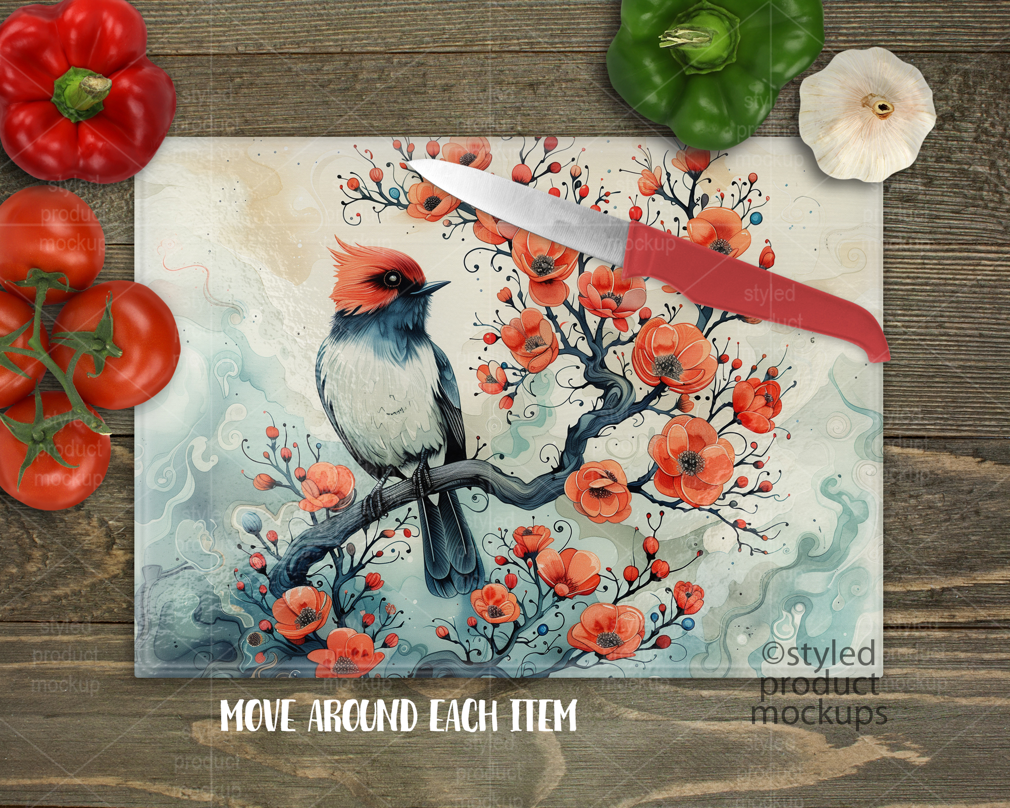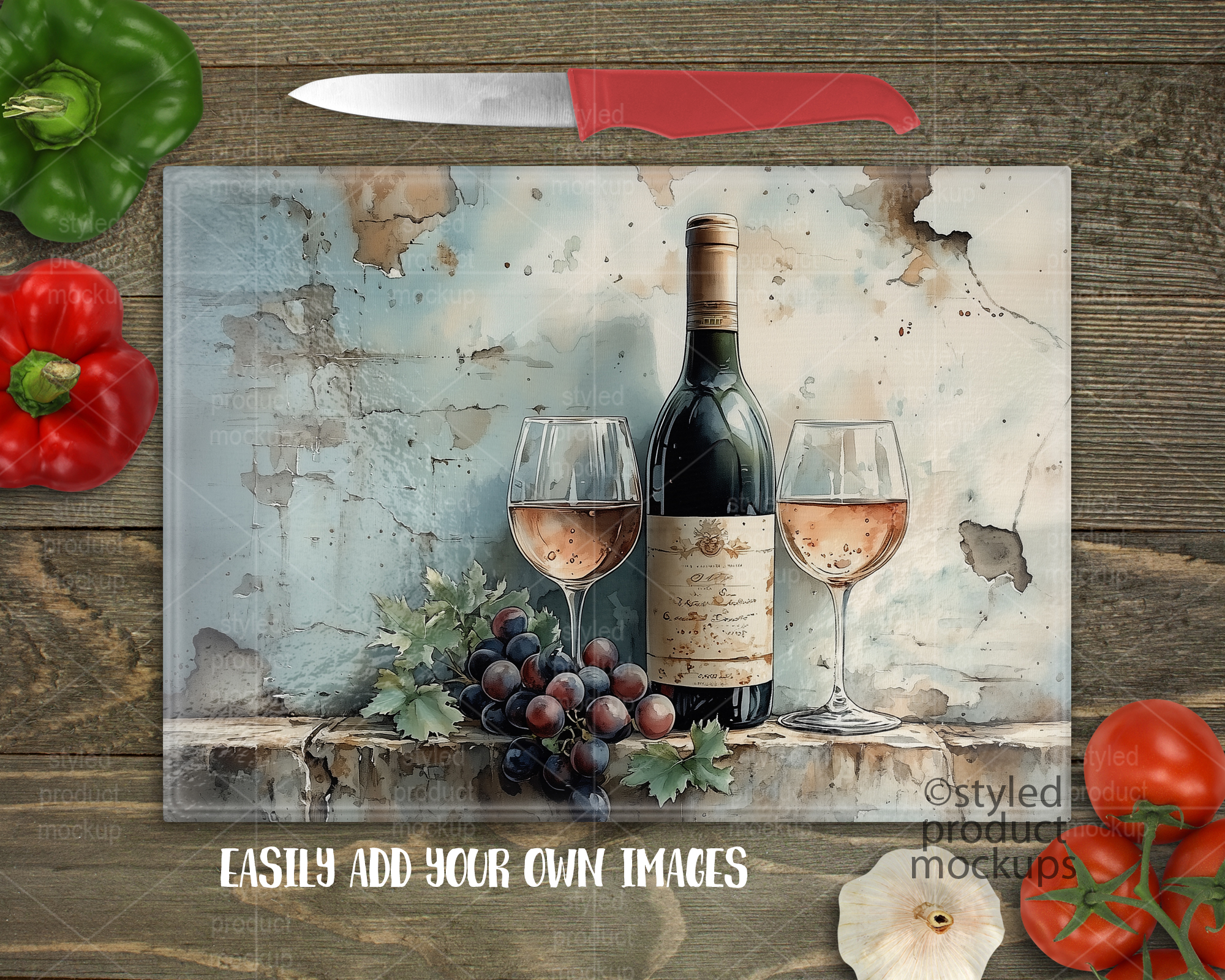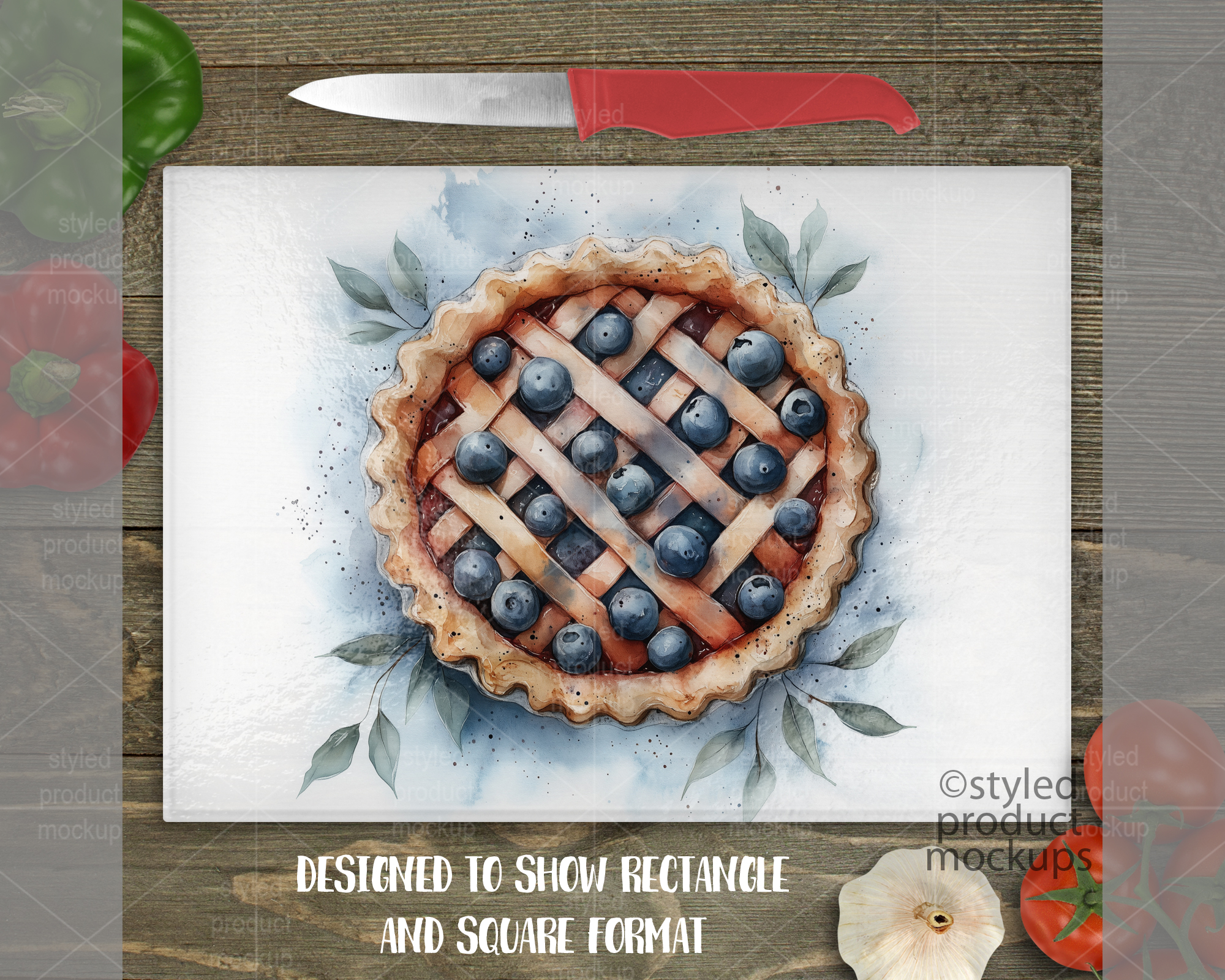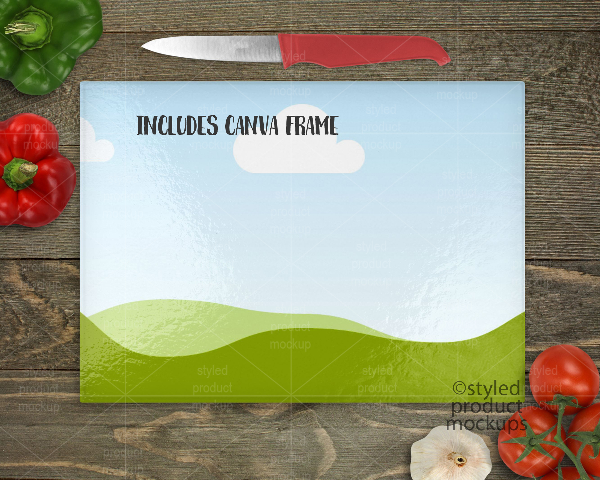 Key Words: Cutting board, mockup, mock-up, template, rectangle, glass, display, sublimation, dye sublimation, stock photography, vegetables, knife, pebble