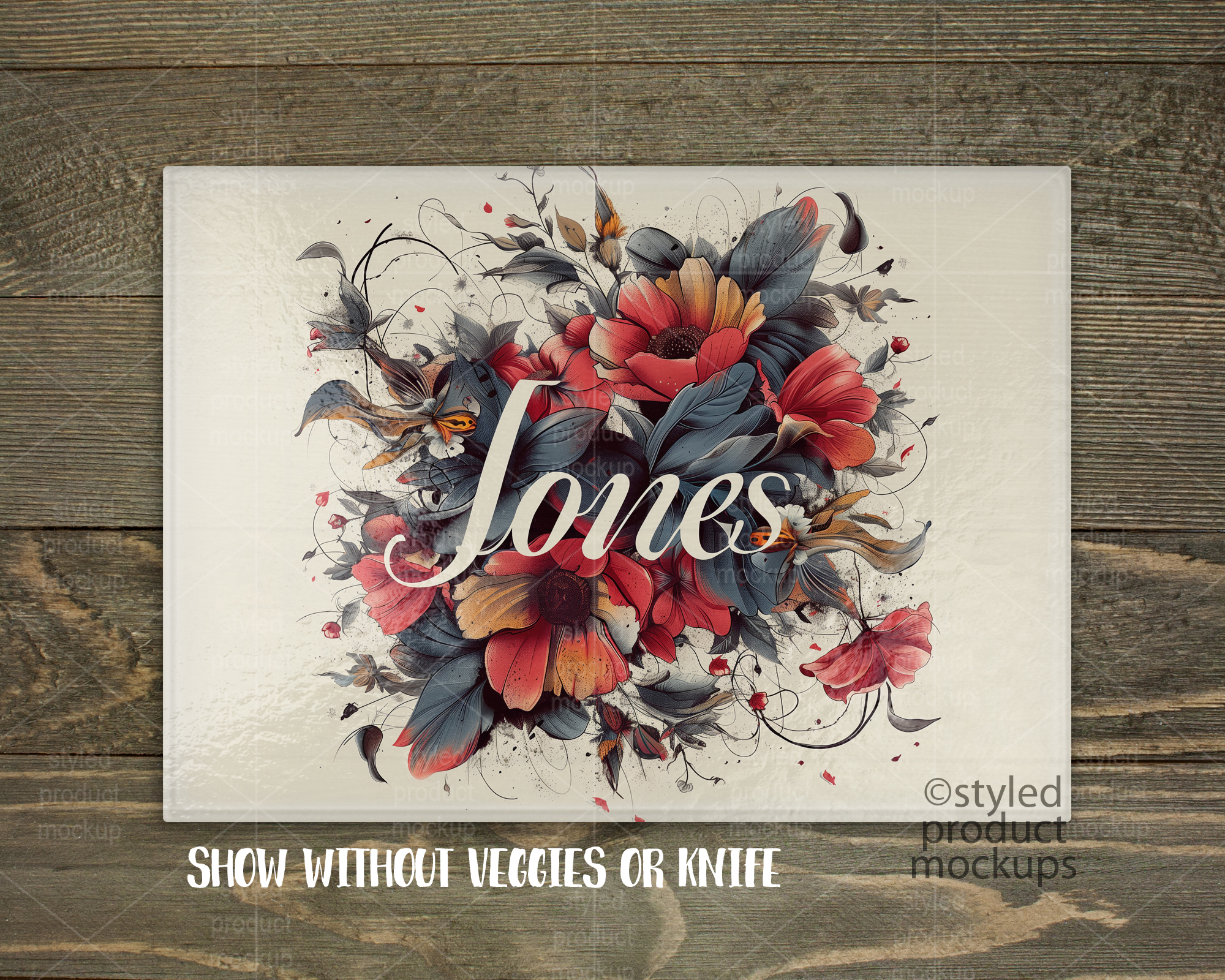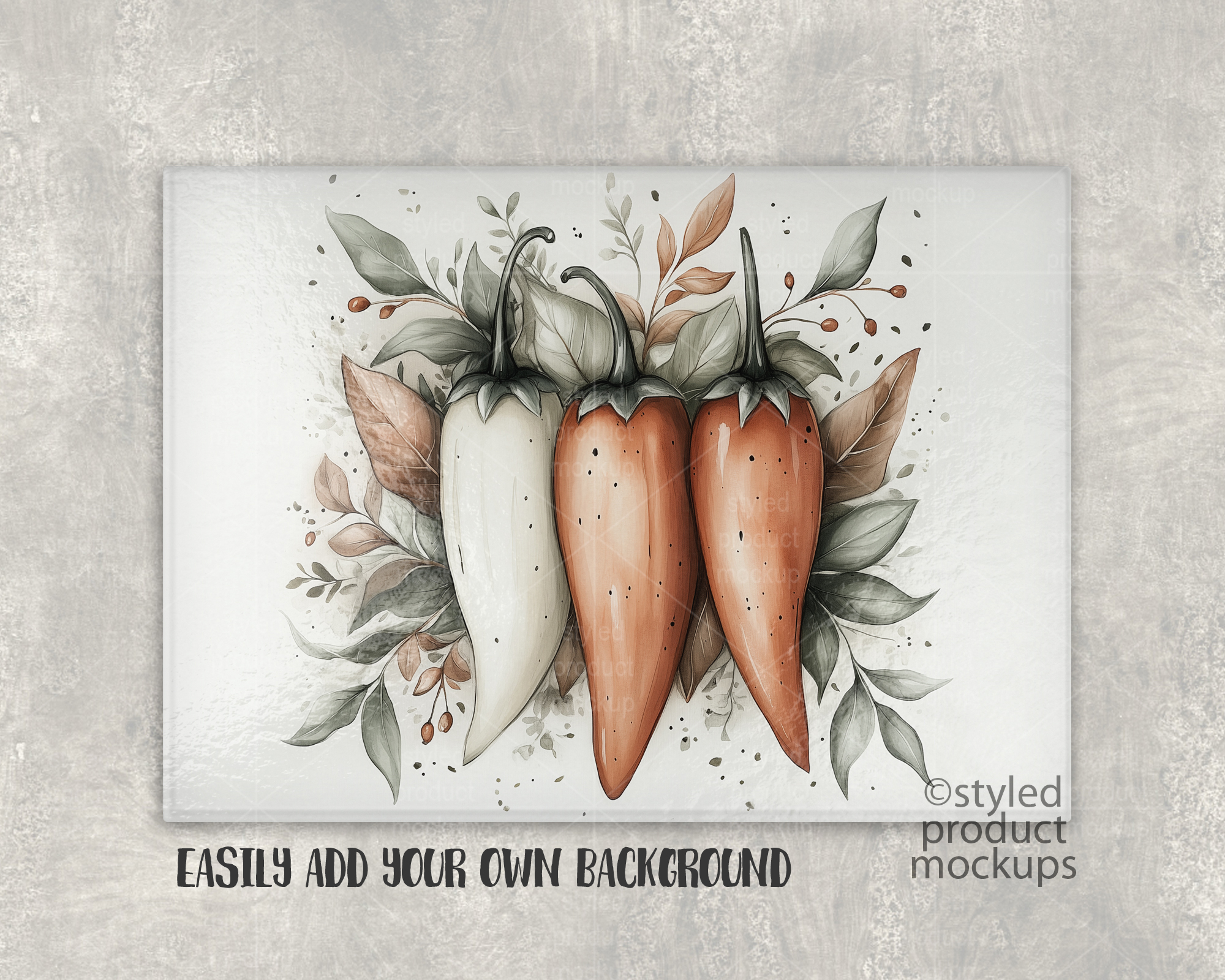 This listing is a mock-up that features a 15.5 x 11 inch (28.5 x 39 cm) rectangle glass cutting board with pebble texture. Give a professional touch to your cutting board without the hassle of photographing each one. Our glass cutting board template is ready to use, simply add in your own art files and background. Includes layers for each vegetable and knife so you can move around. Includes wood background.