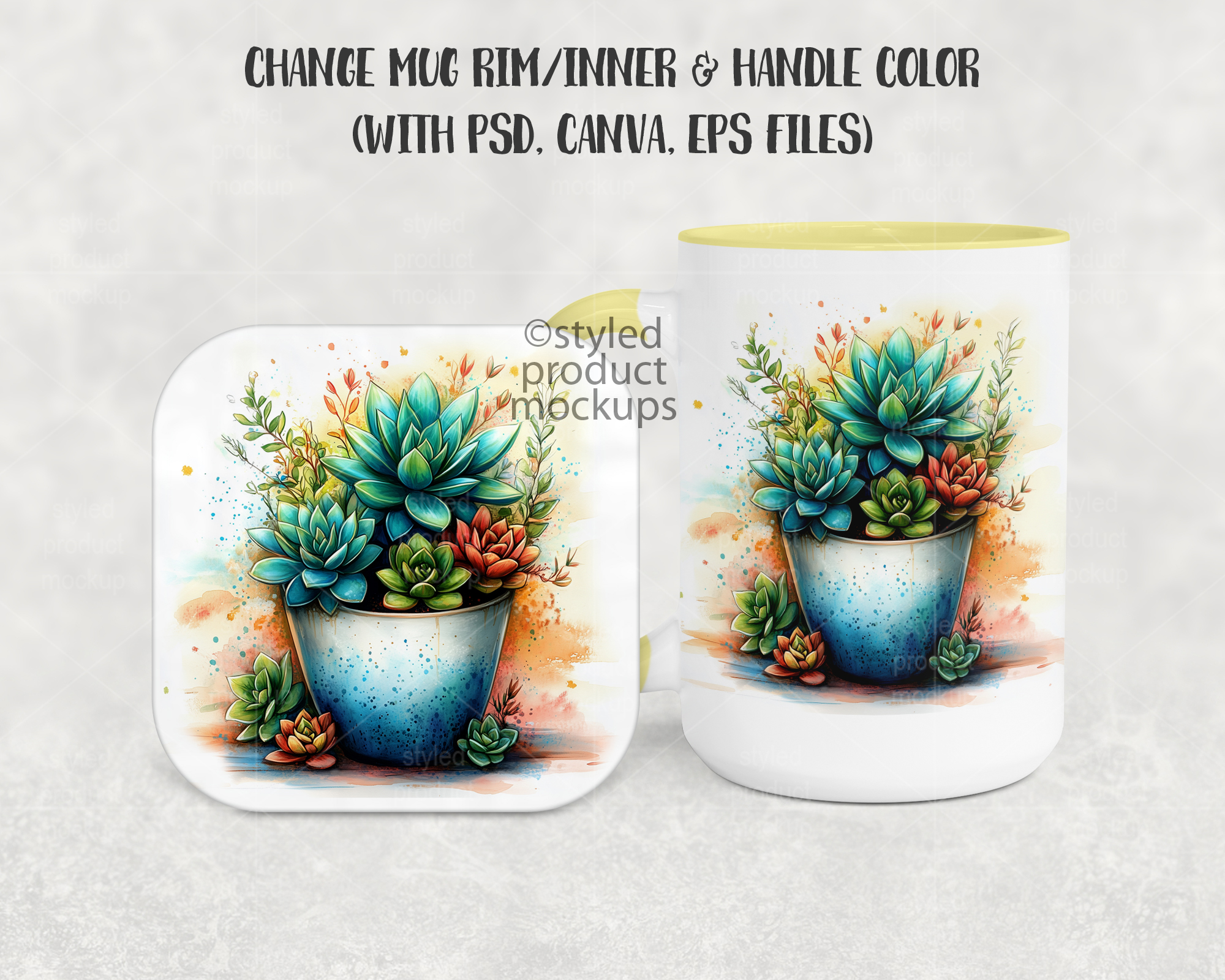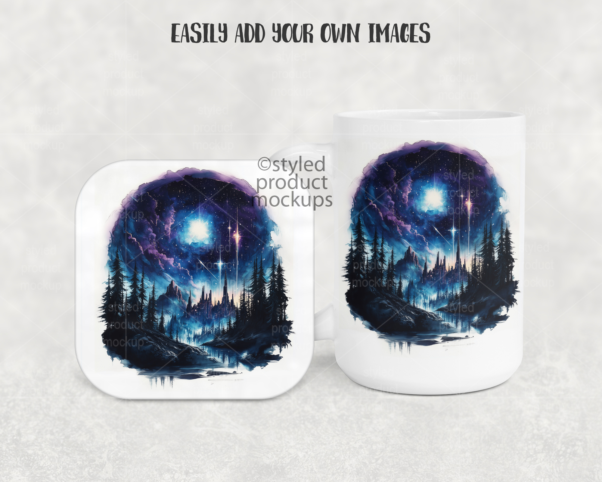 This listing is a mock-up that features a dye sublimation 15oz mug and 4” square hardboard coaster gift set. Give a professional touch to your mug and coaster set designs without the hassle of photographing each one. This styled product mockups template is ready to use, simply add in your own art files and background.