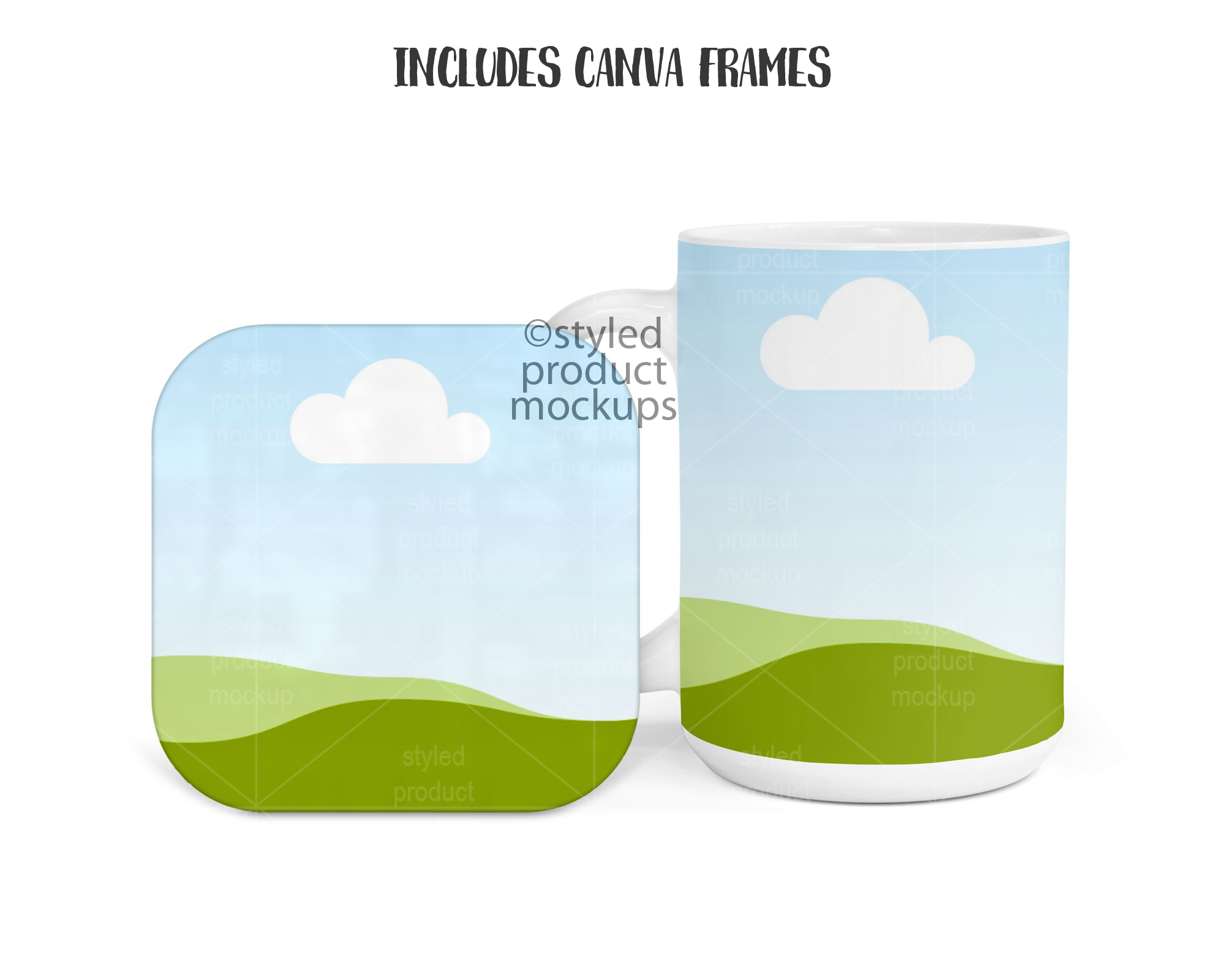 Key Words: mug, coaster, set, 15oz, square, sublimation, mockup, template, display, PSD, PNG, digital, stock photography