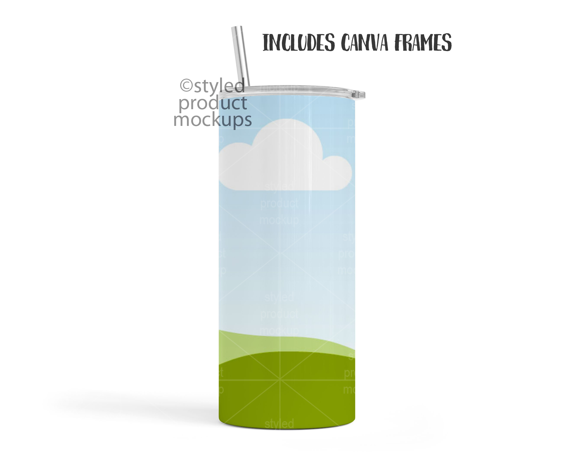 – CANVA template with frame with PNG shading overlays. Click the link in the CANVATemplate PDF and start working. You can also import the Canva frame file and drag and drop your images in. Then place in the shading and highlight PNGs above your images. You can also place your own background in. Includes all lid and straw options in separate files so you can mix and match. NOTE: Canva does not allow you to curve your image, so the frame will not automatically curve your image around the cup when you place your image in.