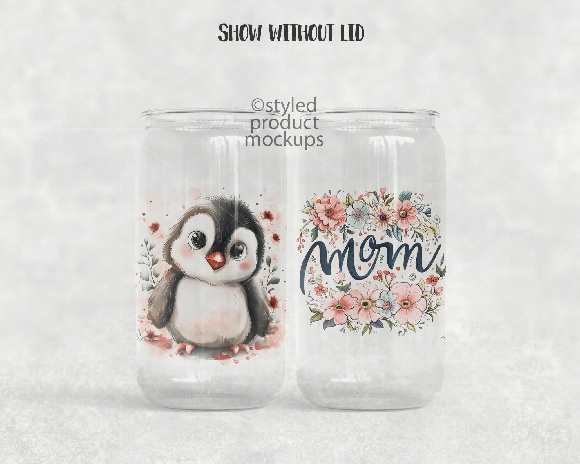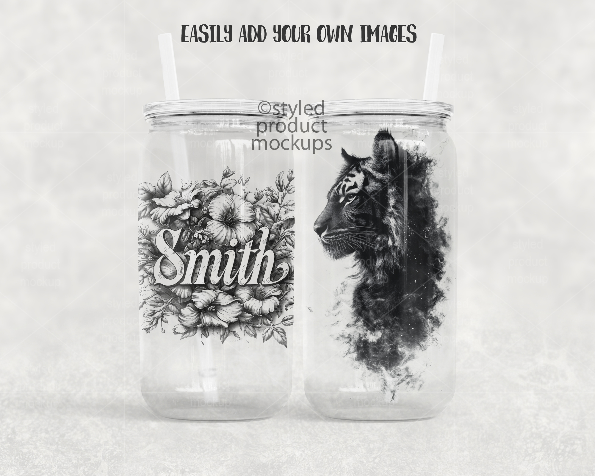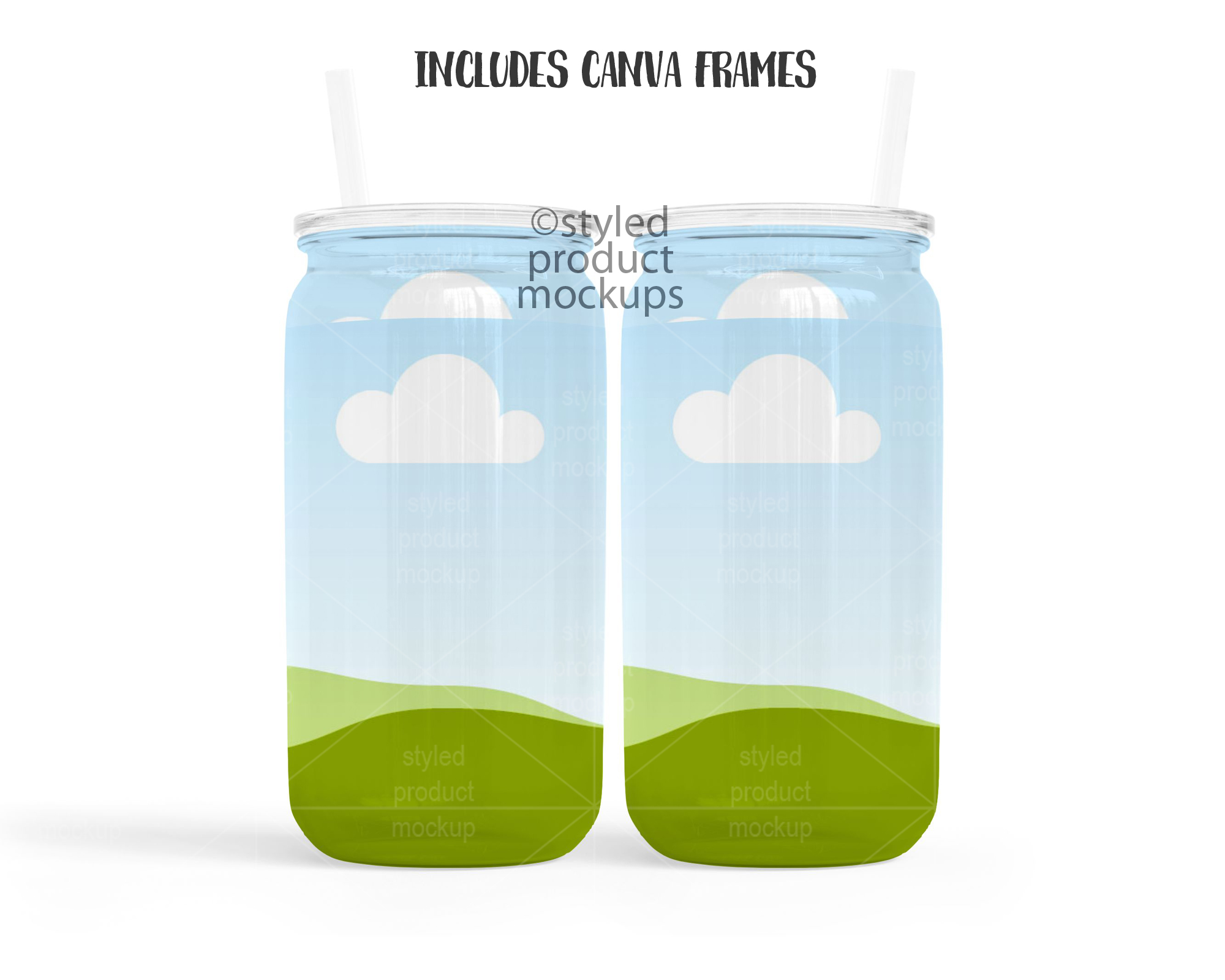 This listing is a mock-up that features dye sublimation 16oz clear glass can with a clear plastic lid. Give a professional touch to your tumbler designs without the hassle of photographing each one. This styled product mockups template is ready to use, simply add in your own art files and background.