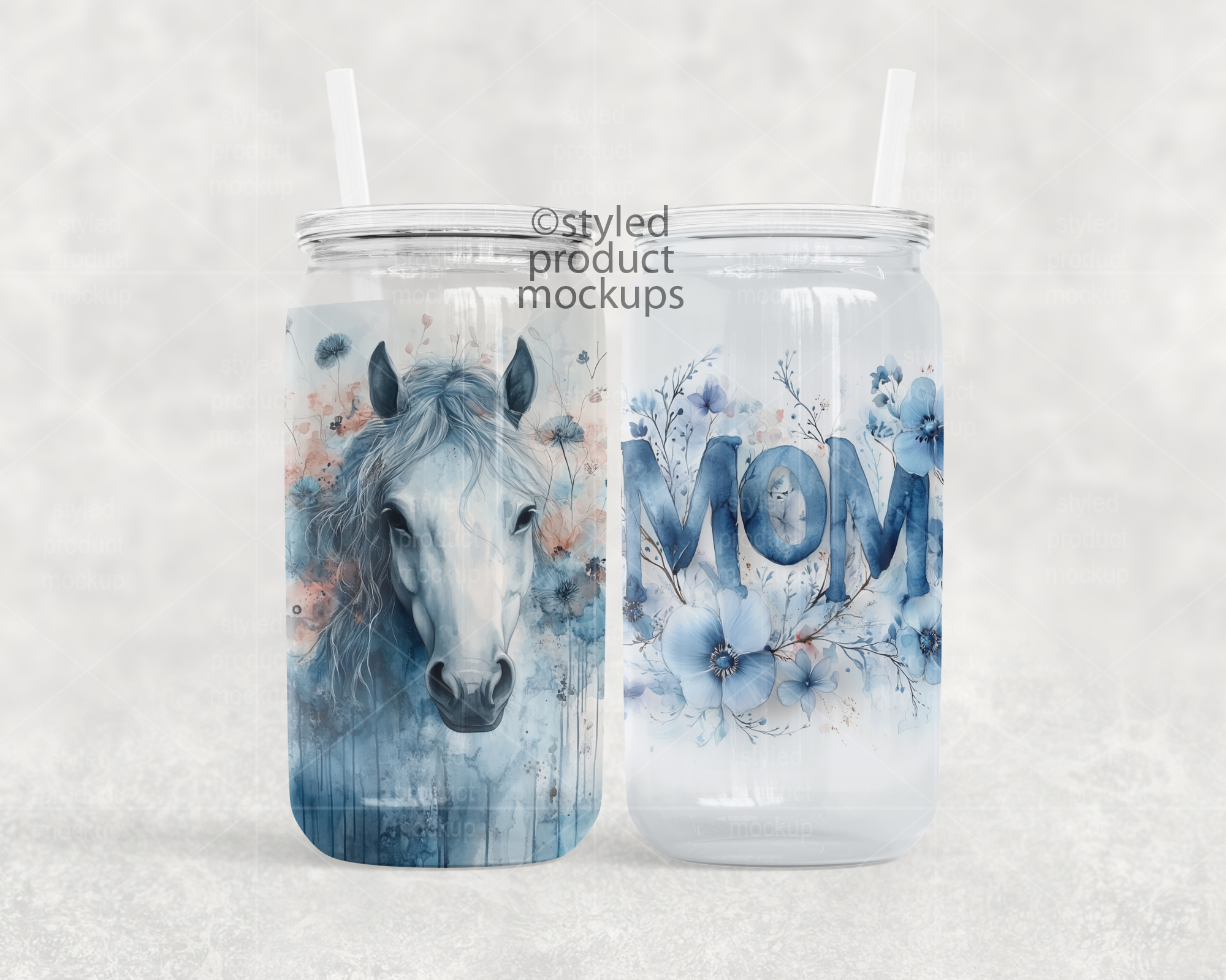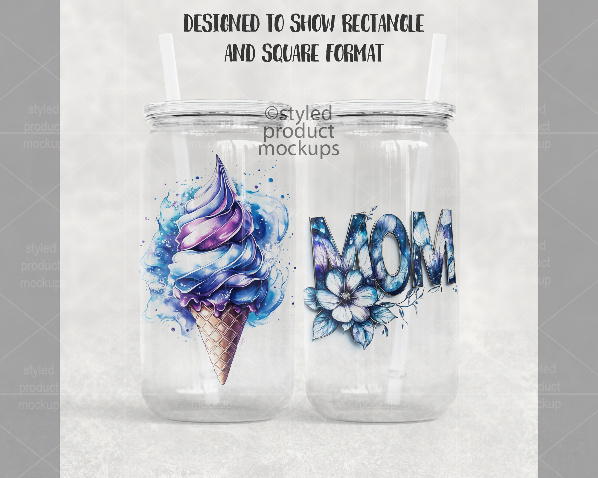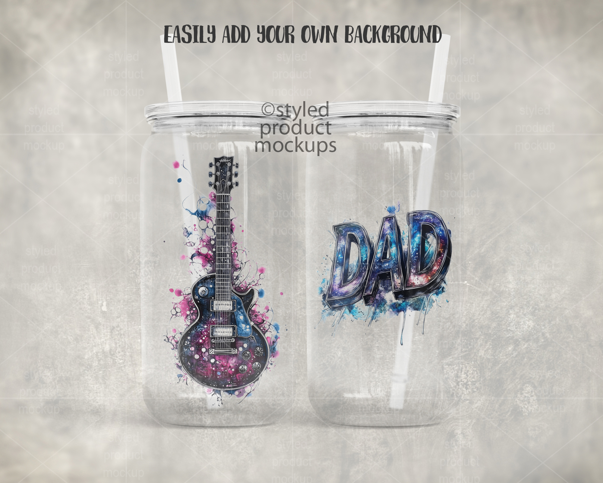 This listing is a mock-up that features dye sublimation 16oz clear glass can with a clear plastic lid. Give a professional touch to your tumbler designs without the hassle of photographing each one. This styled product mockups template is ready to use, simply add in your own art files and background.