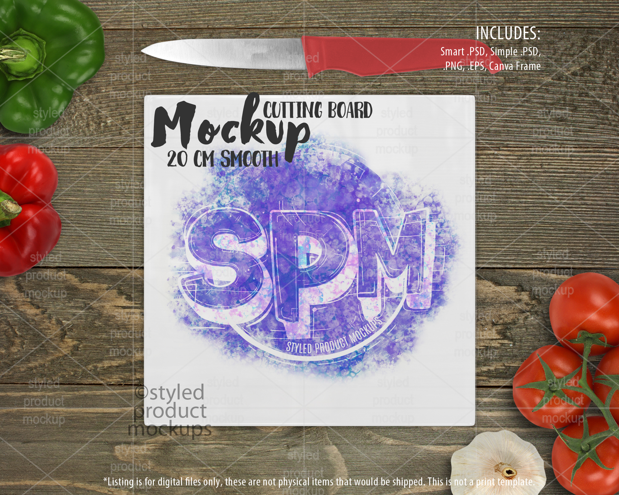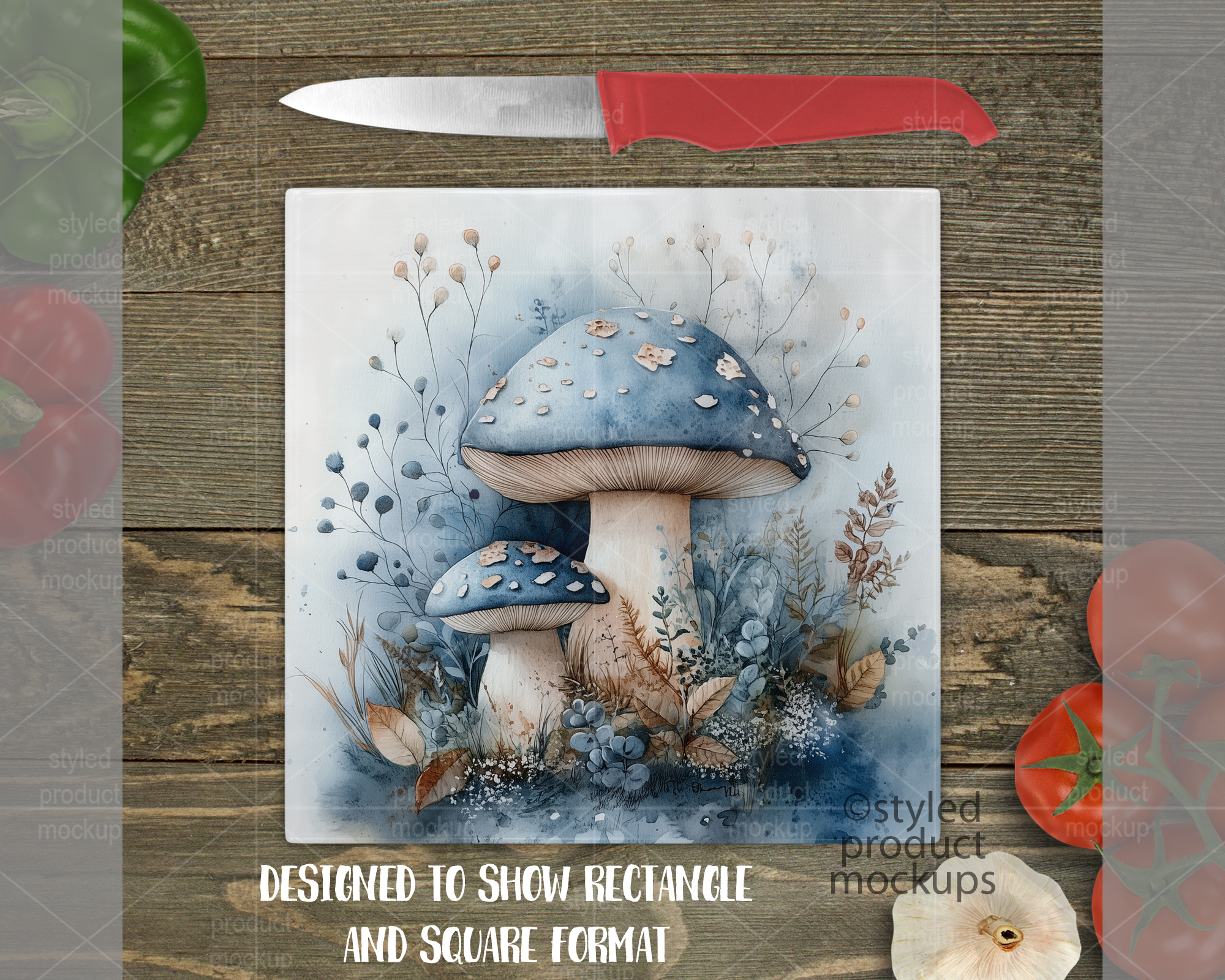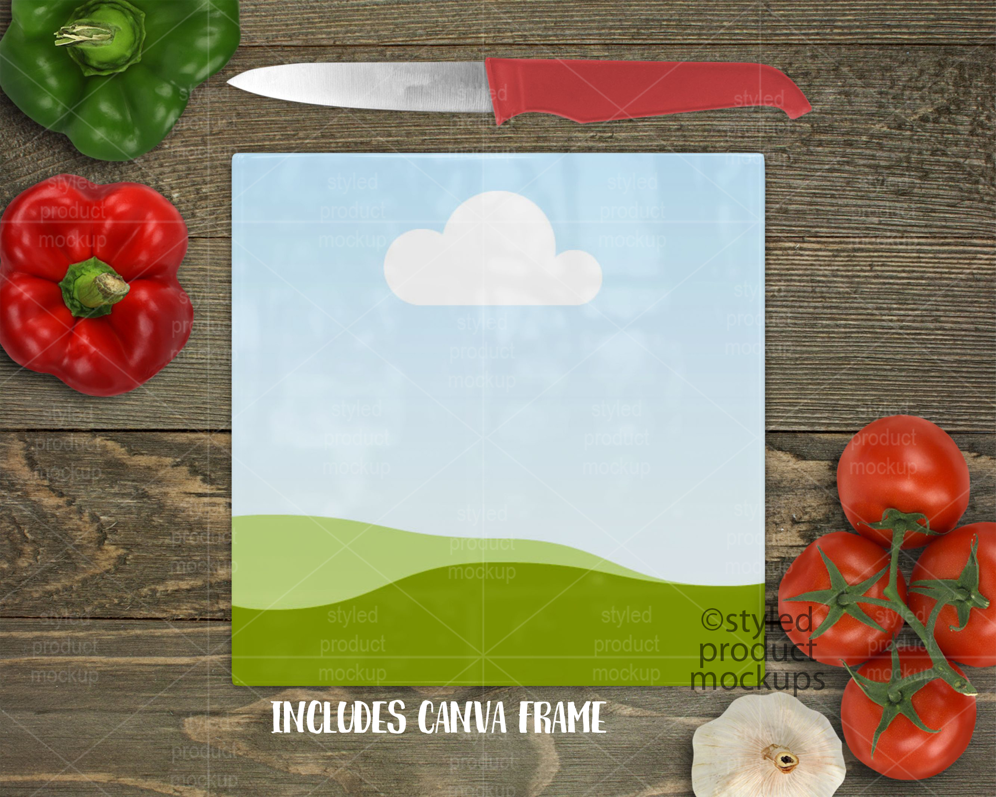 This listing is a mock-up that features a 20 cm (7.87”) square smooth glass cutting board. Give a professional touch to your chopping board designs without the hassle of photographing each one. This styled product mockups template is ready to use, simply add in your own art files and background.