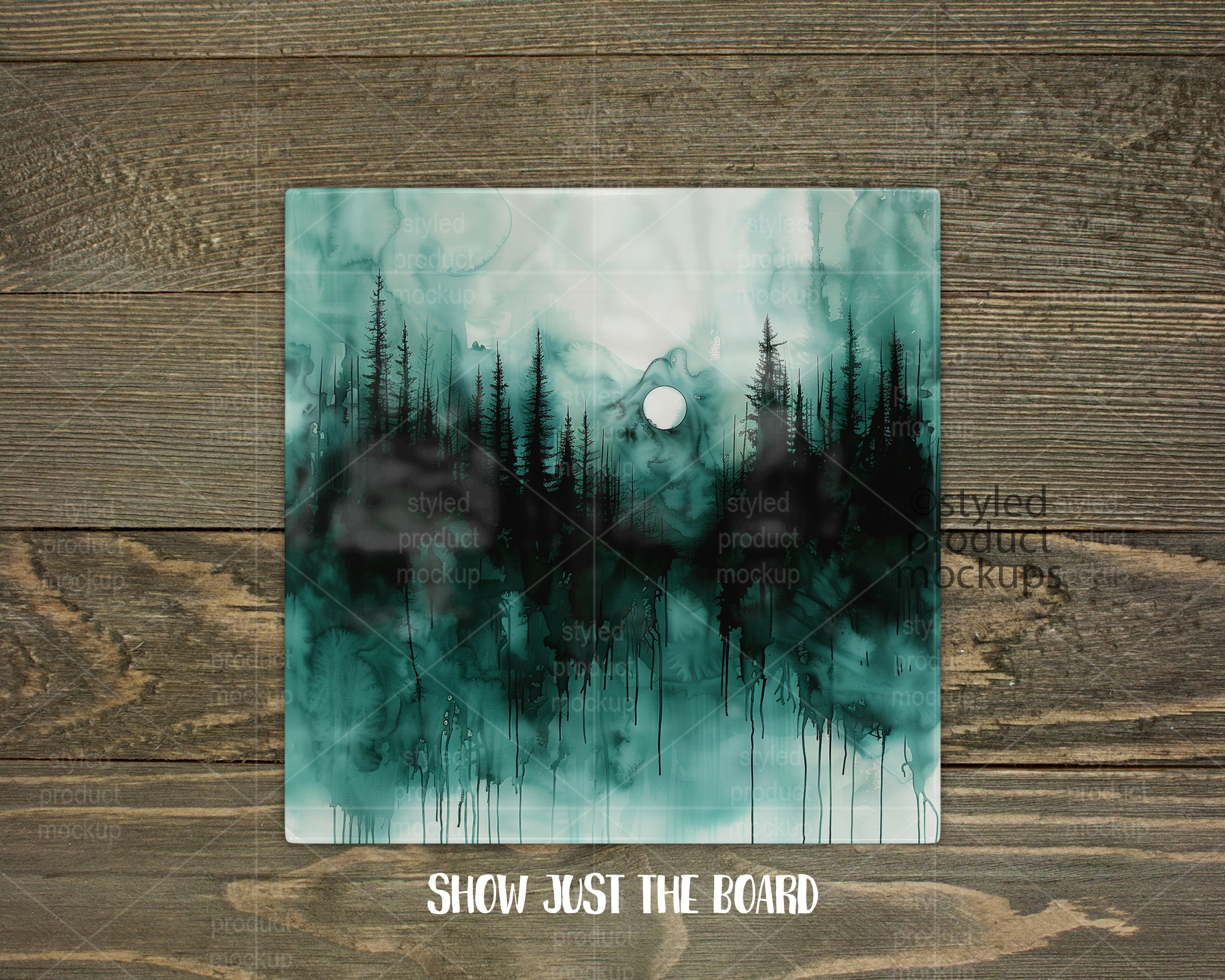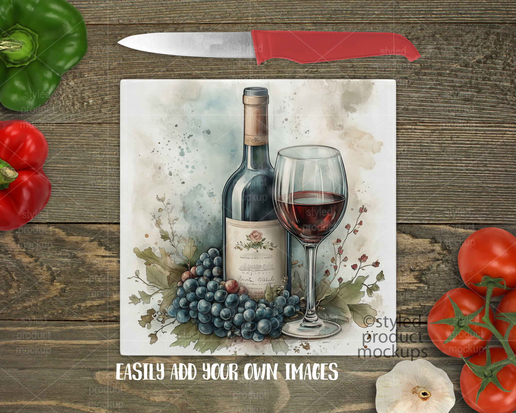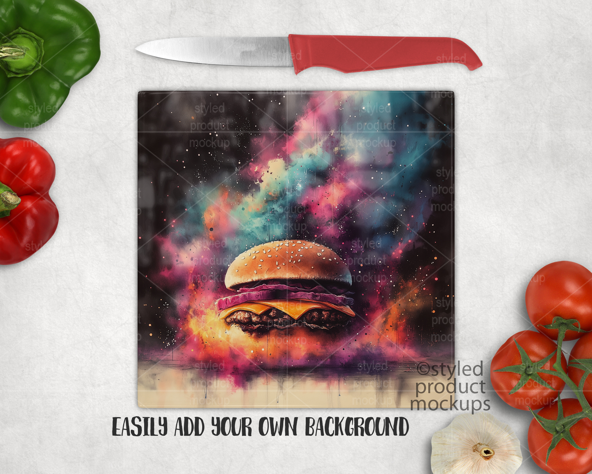 This listing is a mock-up that features a 20 cm (7.87”) square smooth glass cutting board. Give a professional touch to your chopping board designs without the hassle of photographing each one. This styled product mockups template is ready to use, simply add in your own art files and background.