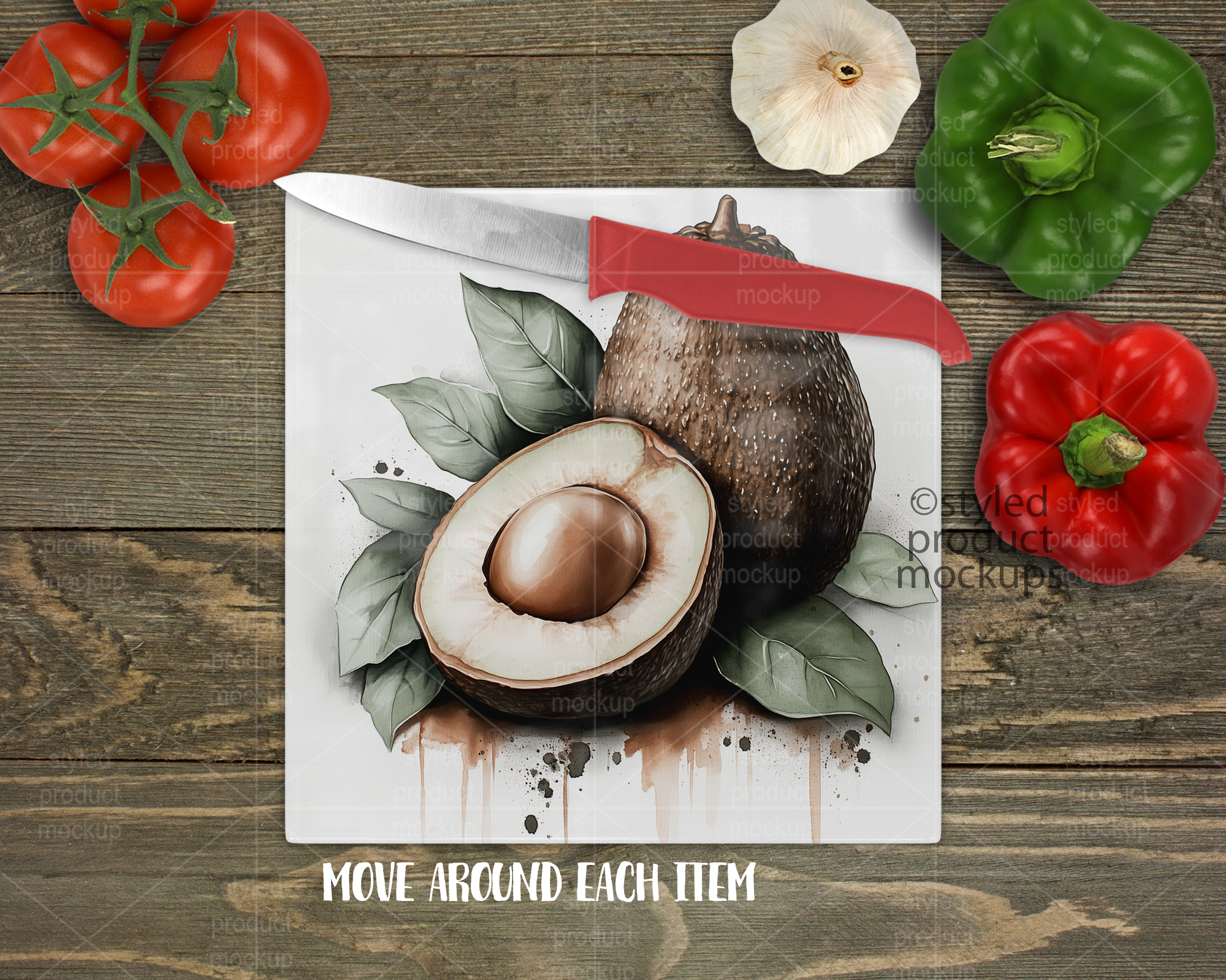 – Photoshop CS5+/CC .PSD file. File is set up with Smart Objects. Simply double click the layers marked in Red to paste your image in and you are done! Add your own background. Vegetables and knife are each on separate layers so you can move them around.