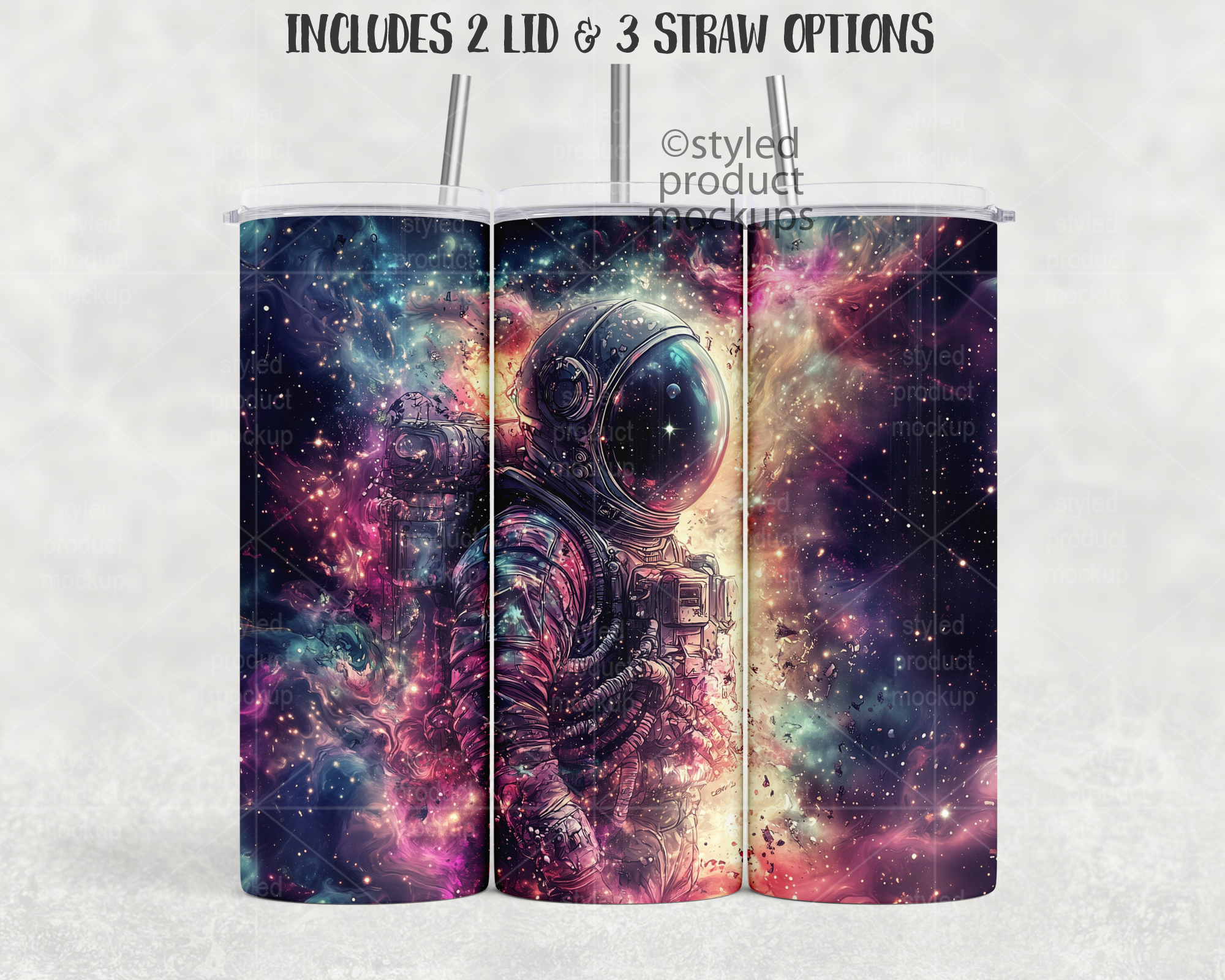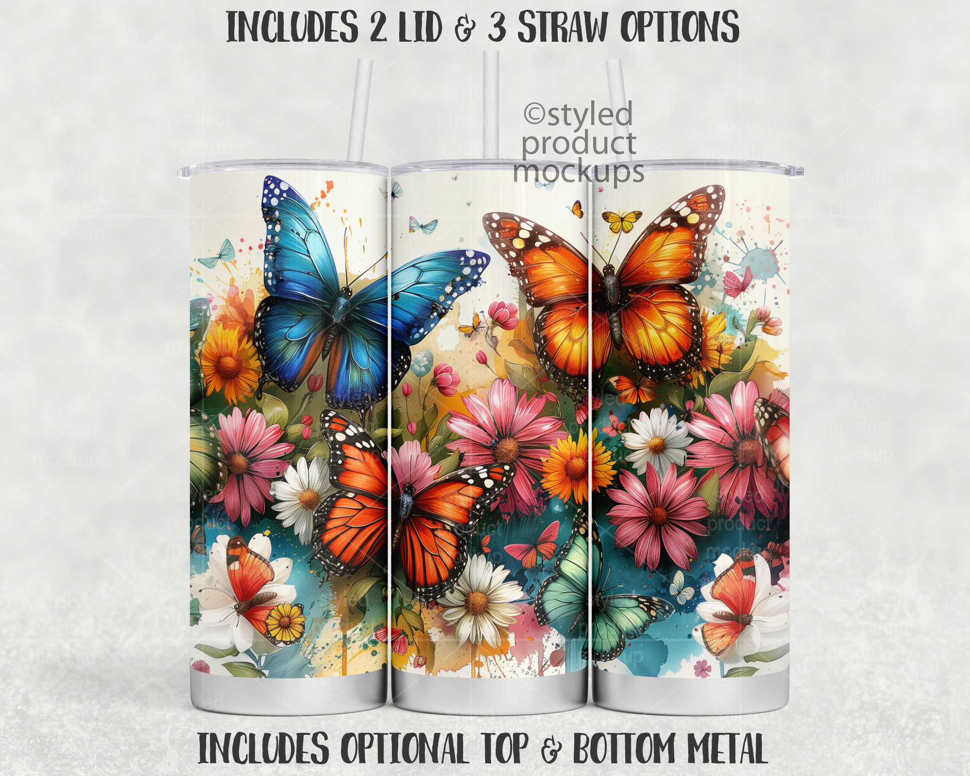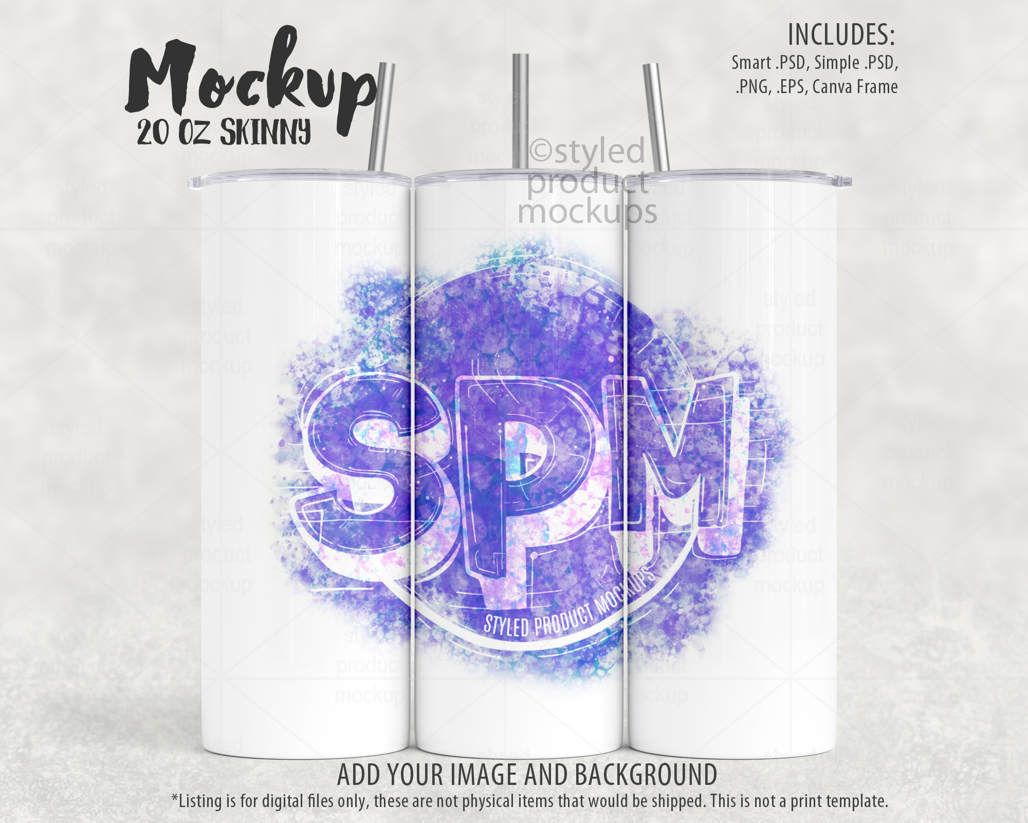 This listing is a mock-up that features a dye sublimation 20oz skinny tumbler full wrap view – Super Close Edition. Includes two lid and 3 straw options with optional top and/or bottom metal rims. Give a professional touch to your tumbler designs without the hassle of photographing each one. This styled product mockups template is ready to use, simply add in your own art files and background.