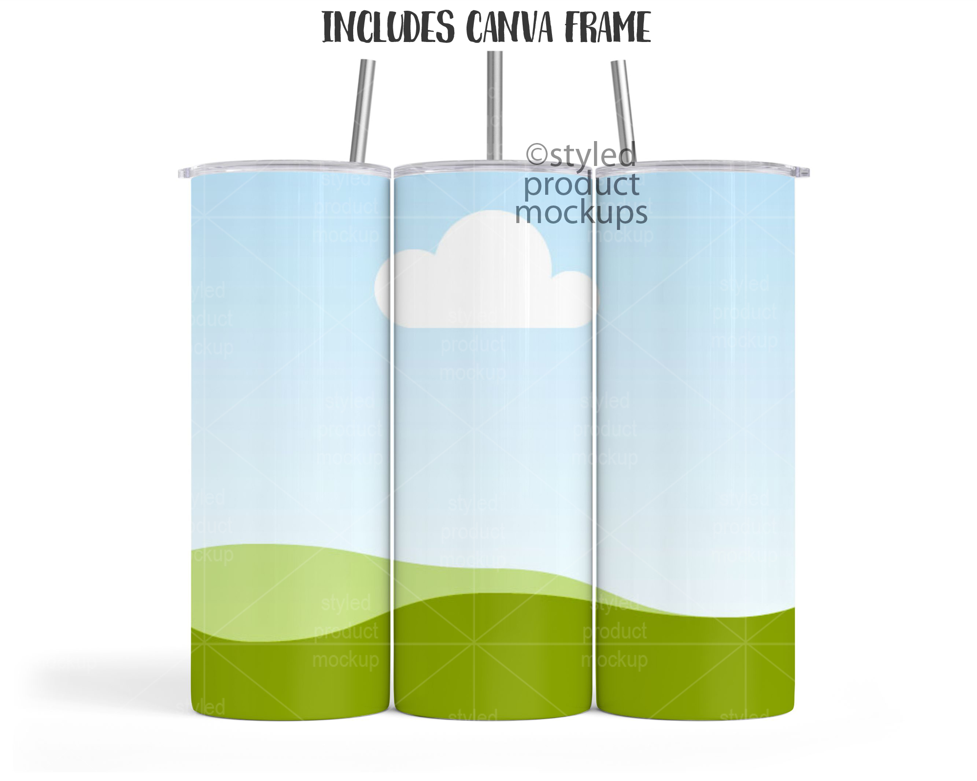 – CANVA link with frame with PNG shading overlays. Click the link in the CANVATemplate PDF and start working. You can also import the Canva frame file and drag and drop your images in. Then place in the shading and highlight PNGs above your images. You can also place your own background in.  Includes lid, straw and metal rim options in separate files so you can choose which ones you want to show. NOTE: Canva does not allow you to curve your image, so the frame will not automatically curve your image around the cup when you place your image in.