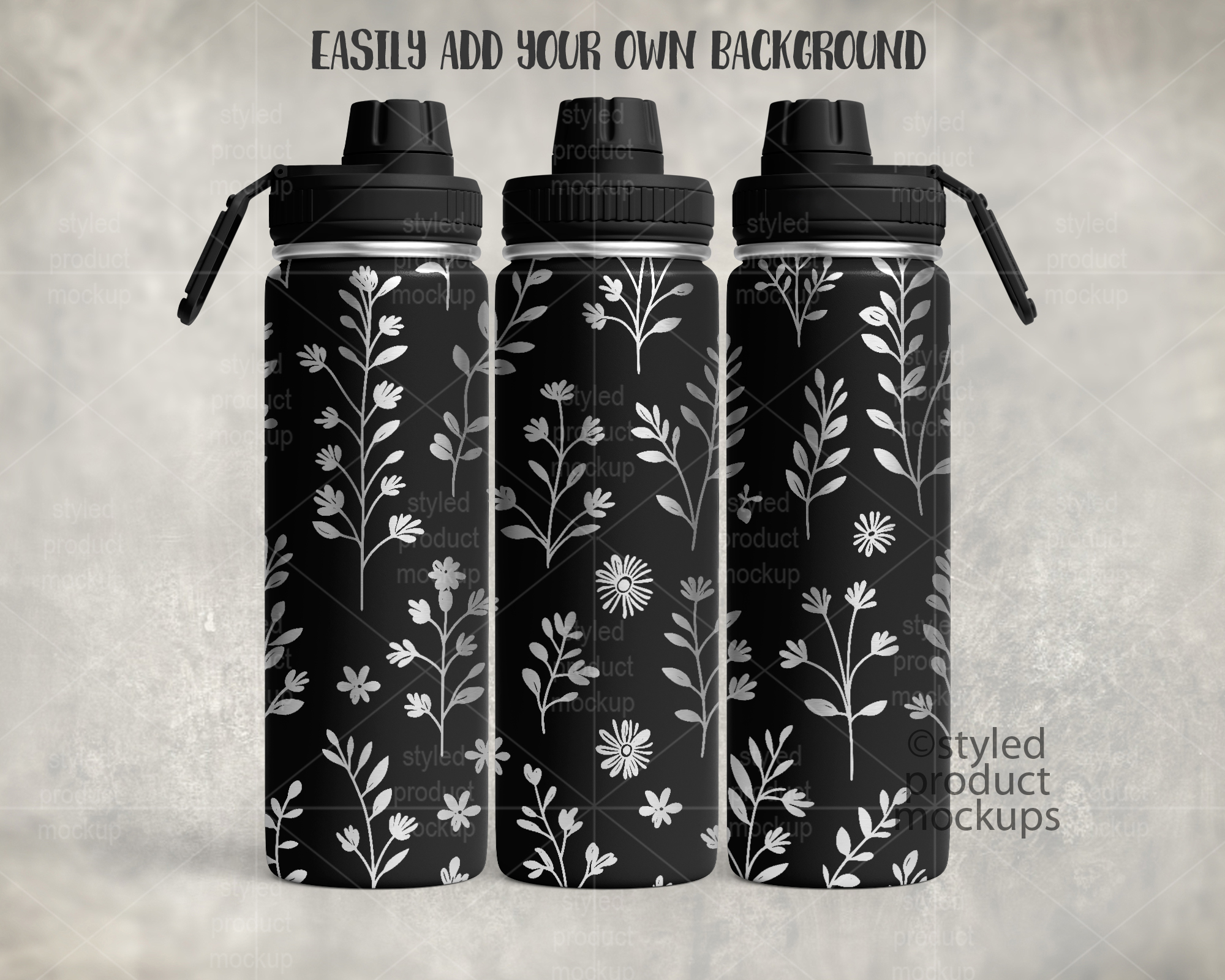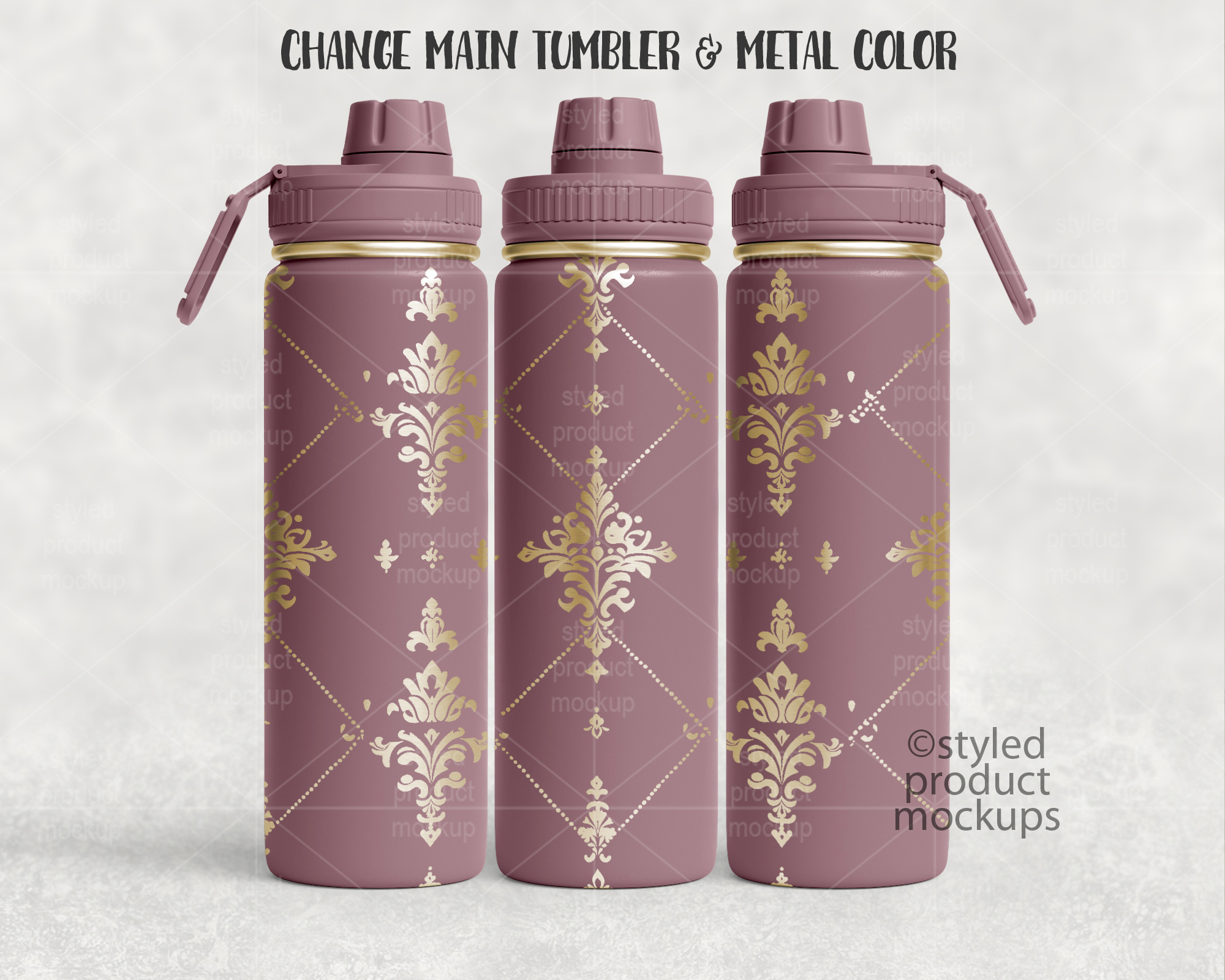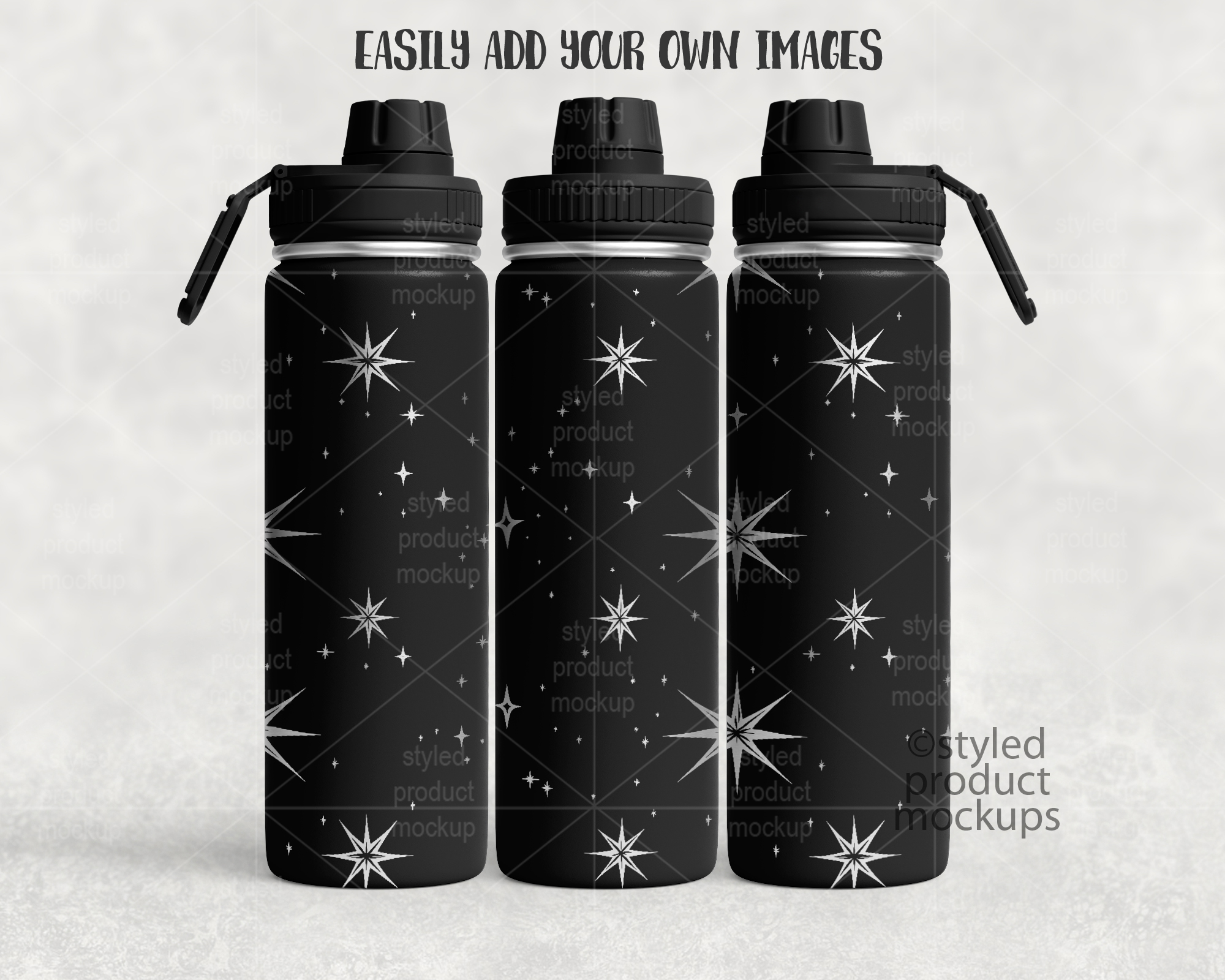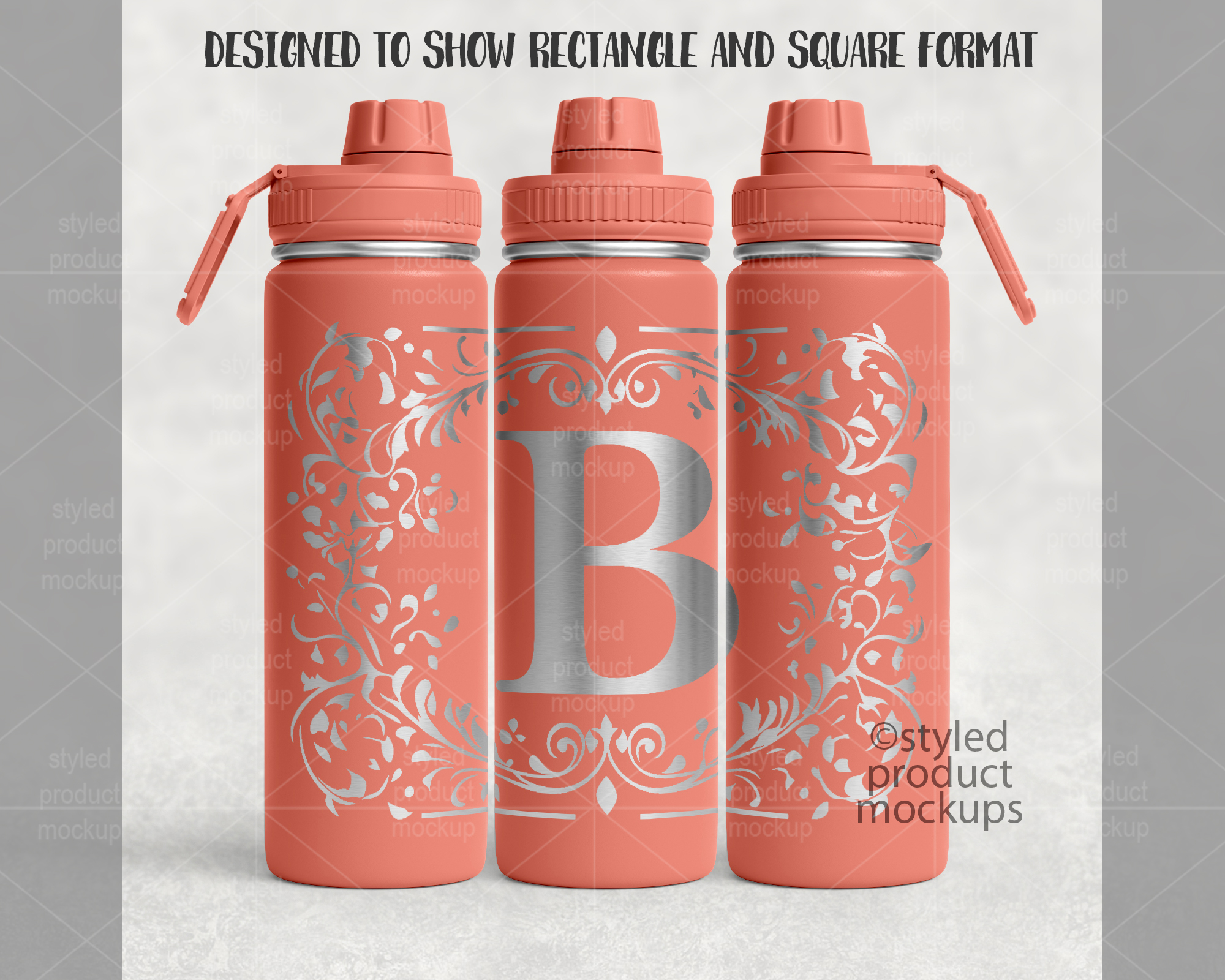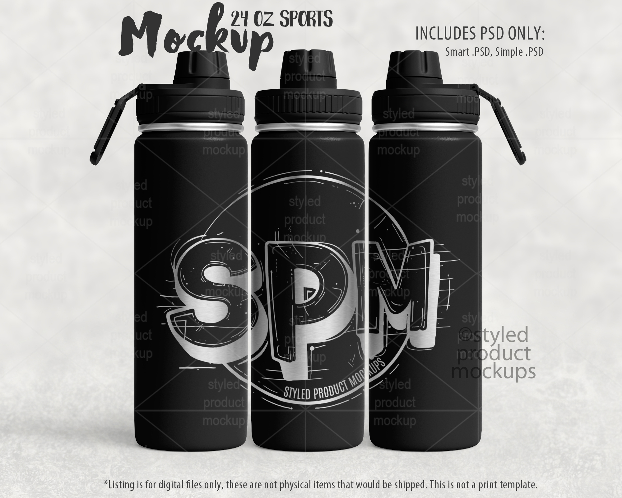 This listing is a mock-up that features a laser etched 24oz sports bottle with screw top lid. Give a professional touch to your tumbler designs without the hassle of photographing each one. This styled product mockups template is ready to use, simply add in your own art files and background.