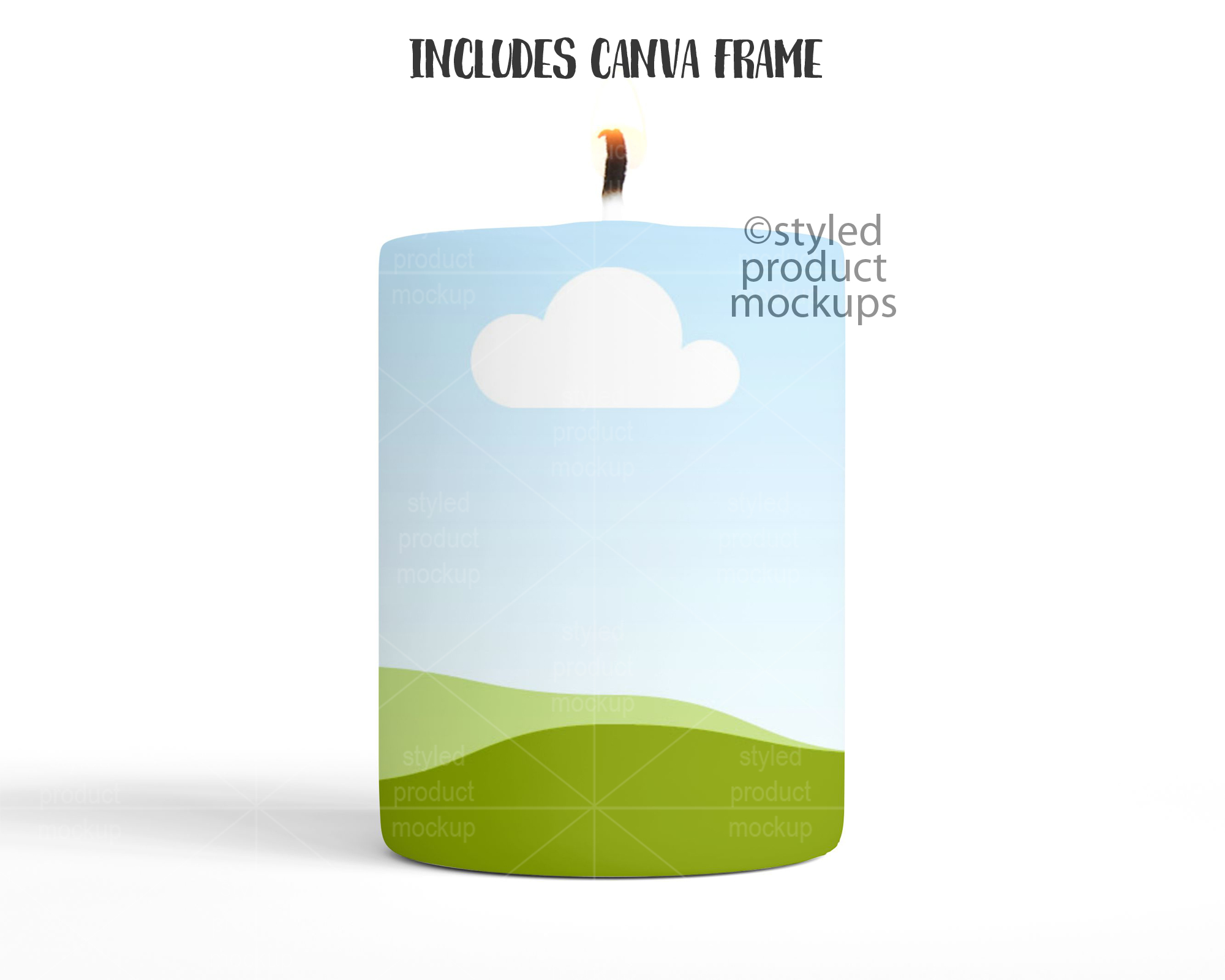 – CANVA link with frame with PNG shading overlays. Click the link in the CANVATemplate PDF. The Canva link has everything put together for you. All you need to do is drag the frame to the top of the layer list, drag and drop your image into it and then move back behind the shading layers. NOTE: Canva does not allow you to curve your image, so the frame will not automatically curve your image around the candle when you place your image in.