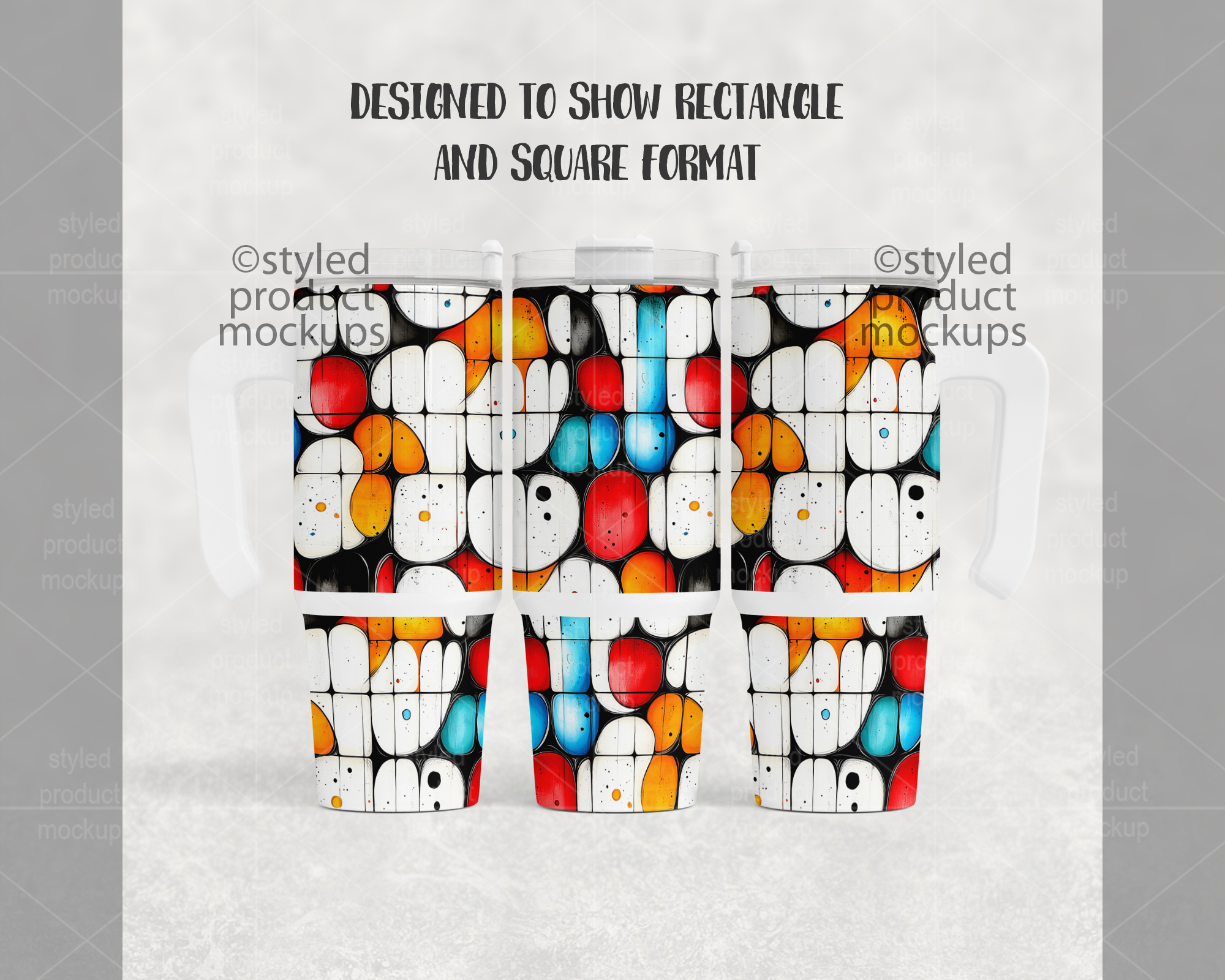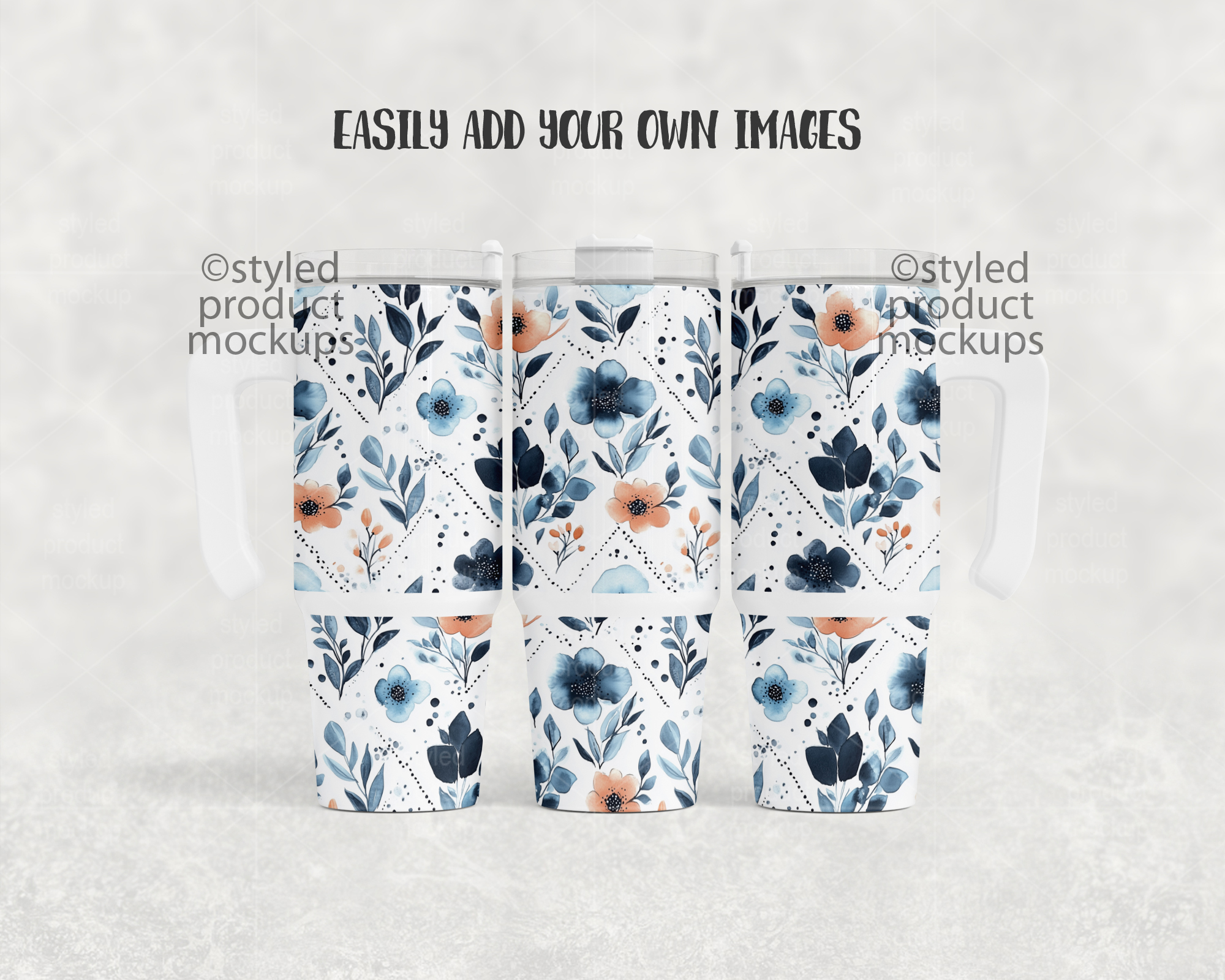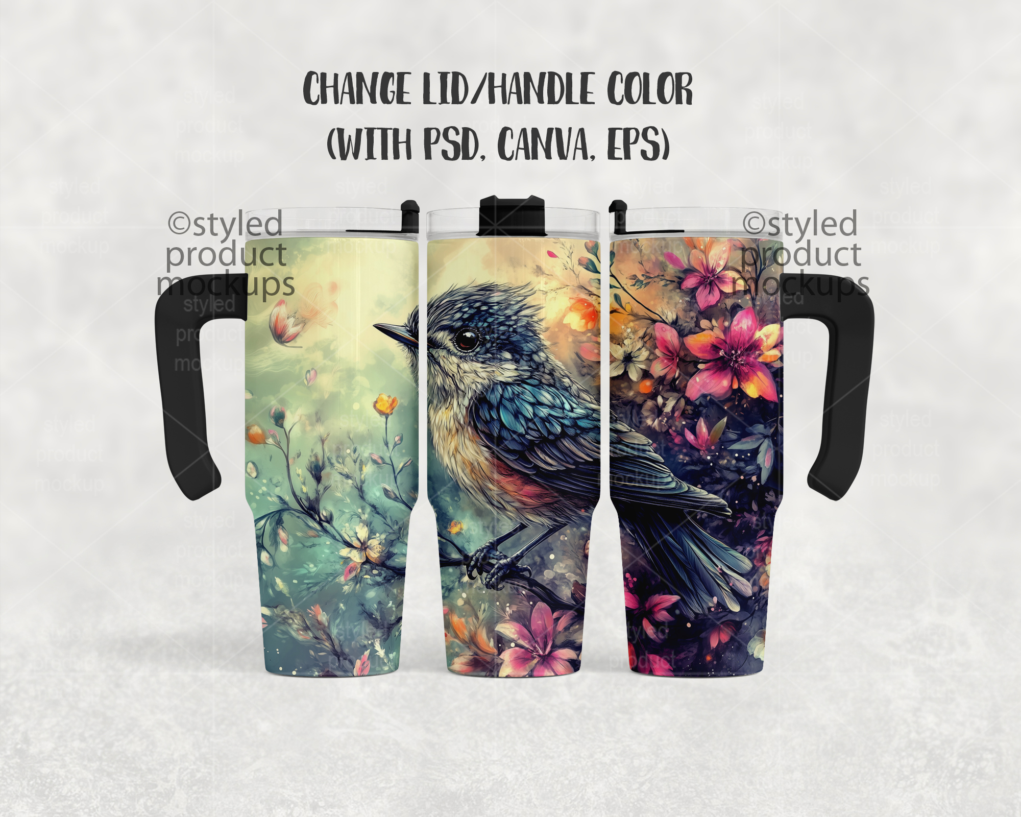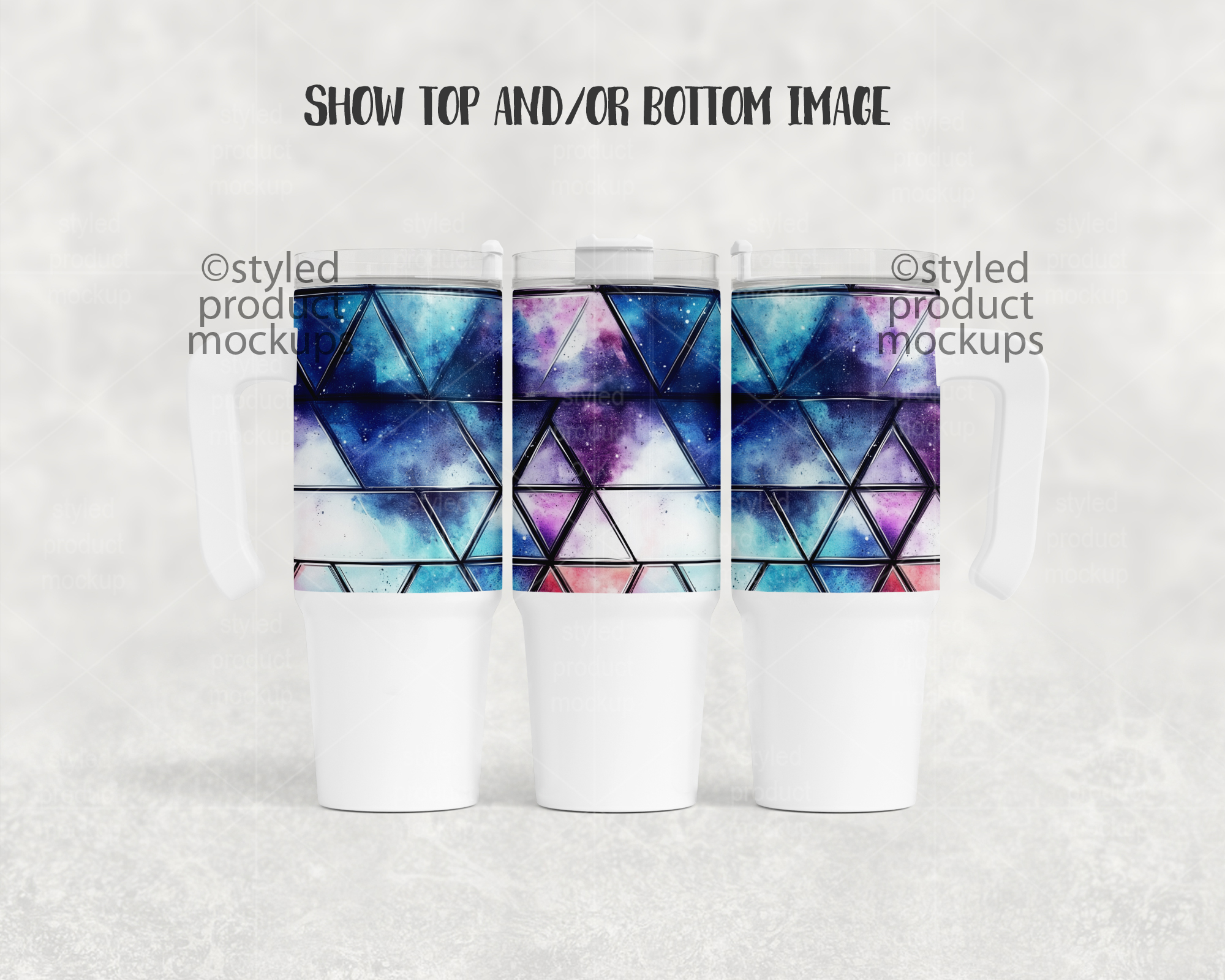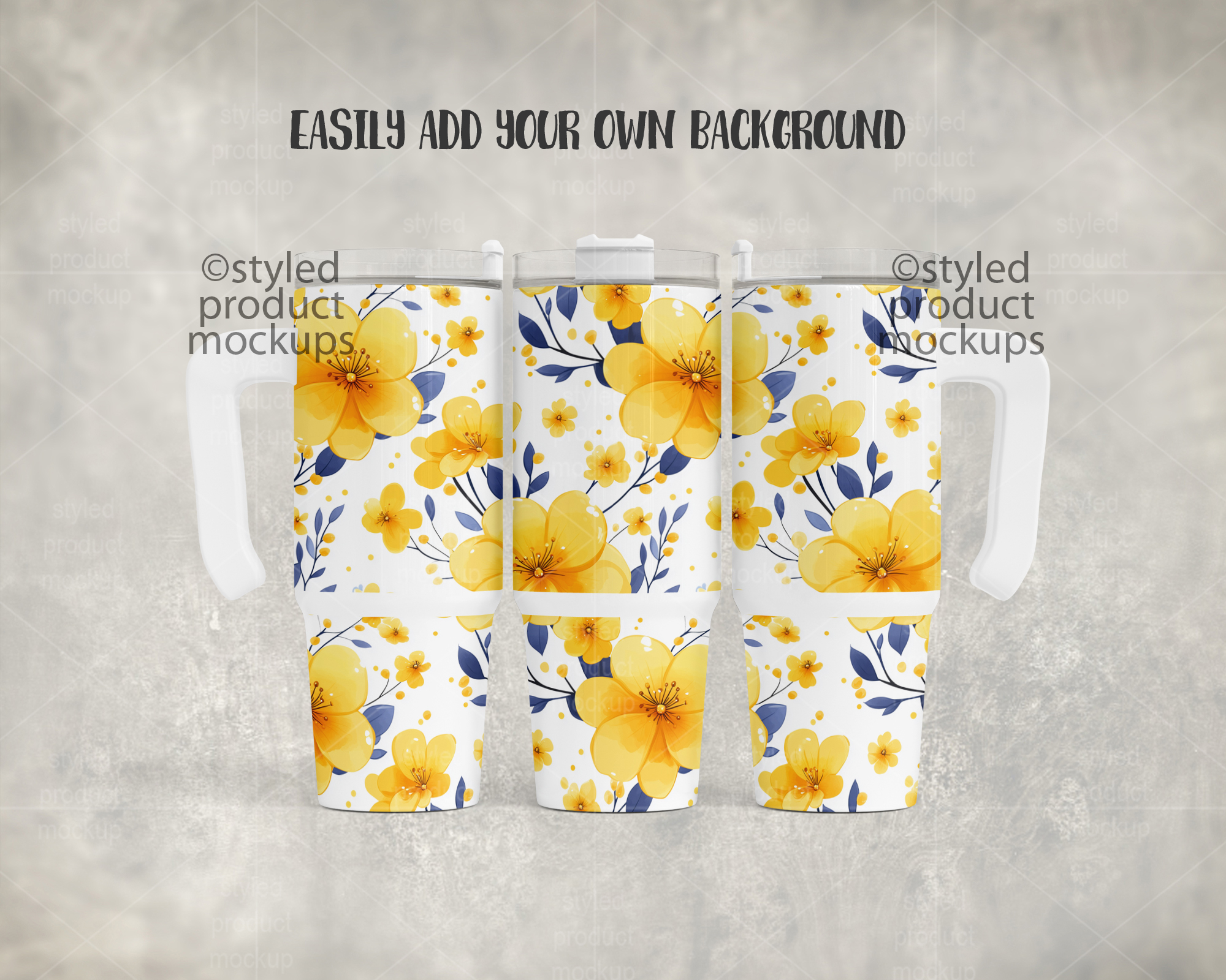This listing is a mock-up that features a dye sublimation 30oz tumbler with handle. Give a professional touch to your tumbler designs without the hassle of photographing each one. This styled product mockups template is ready to use, simply add in your own art files and background.