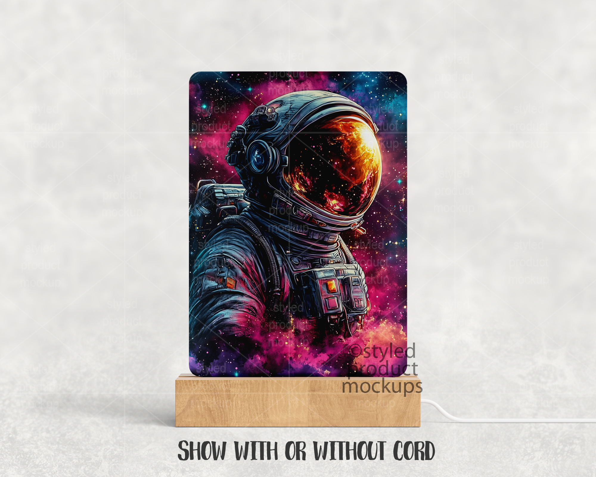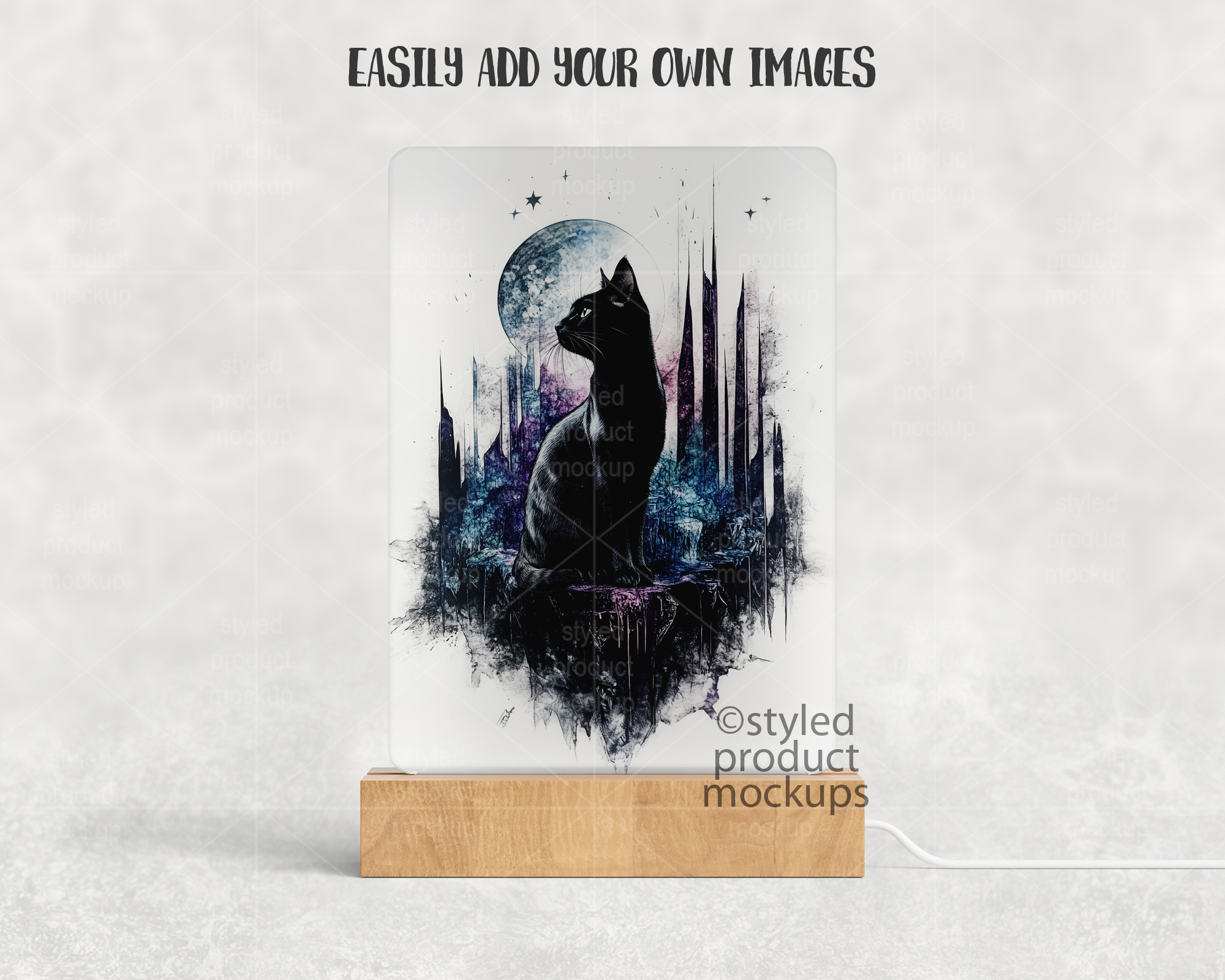 This listing is a mock-up that features a 5×7 inch LED plaque with a wood base. Give a professional touch to your LED photo panel designs without the hassle of photographing each one. This styled product mockups template is ready to use, simply add in your own art files and background.