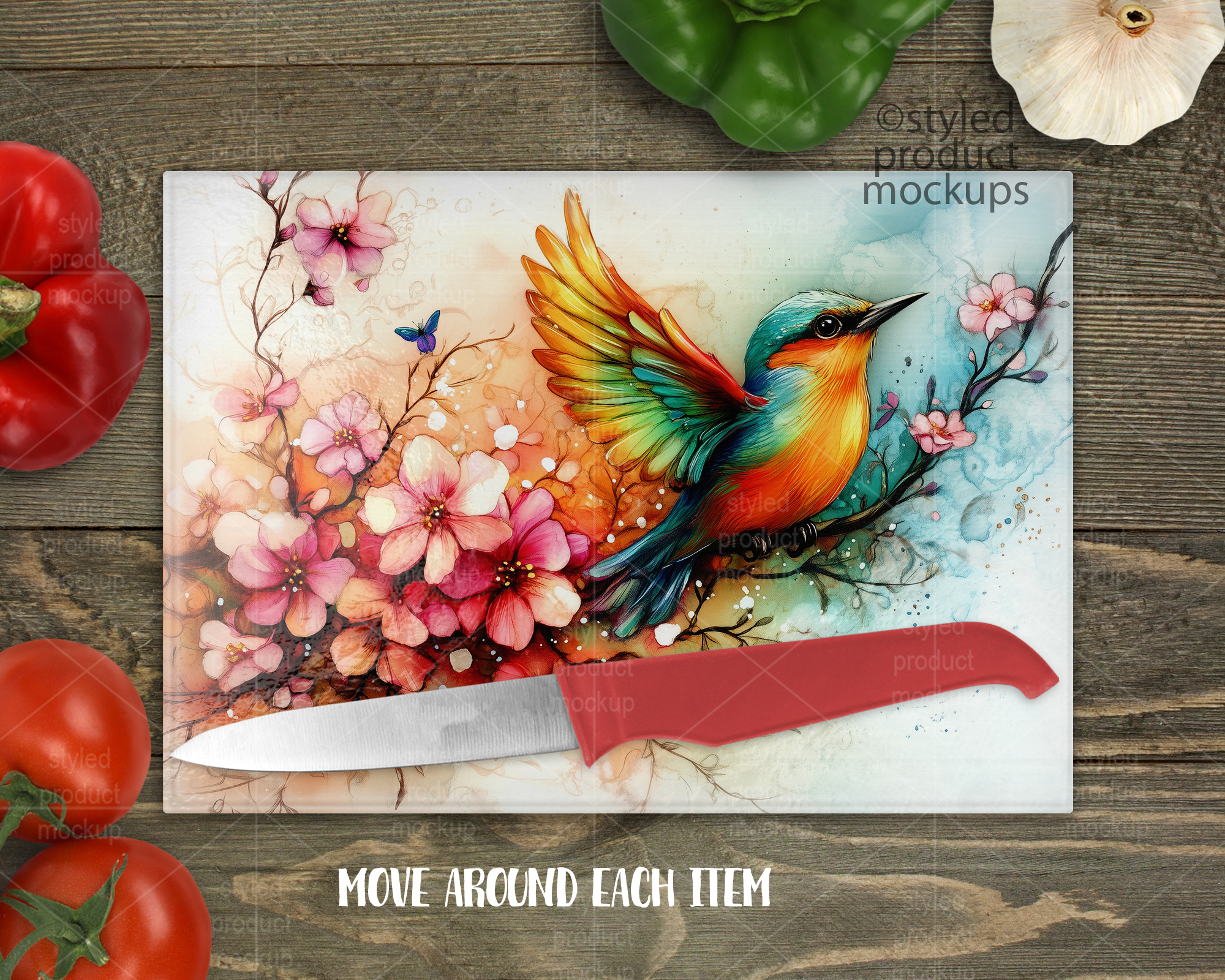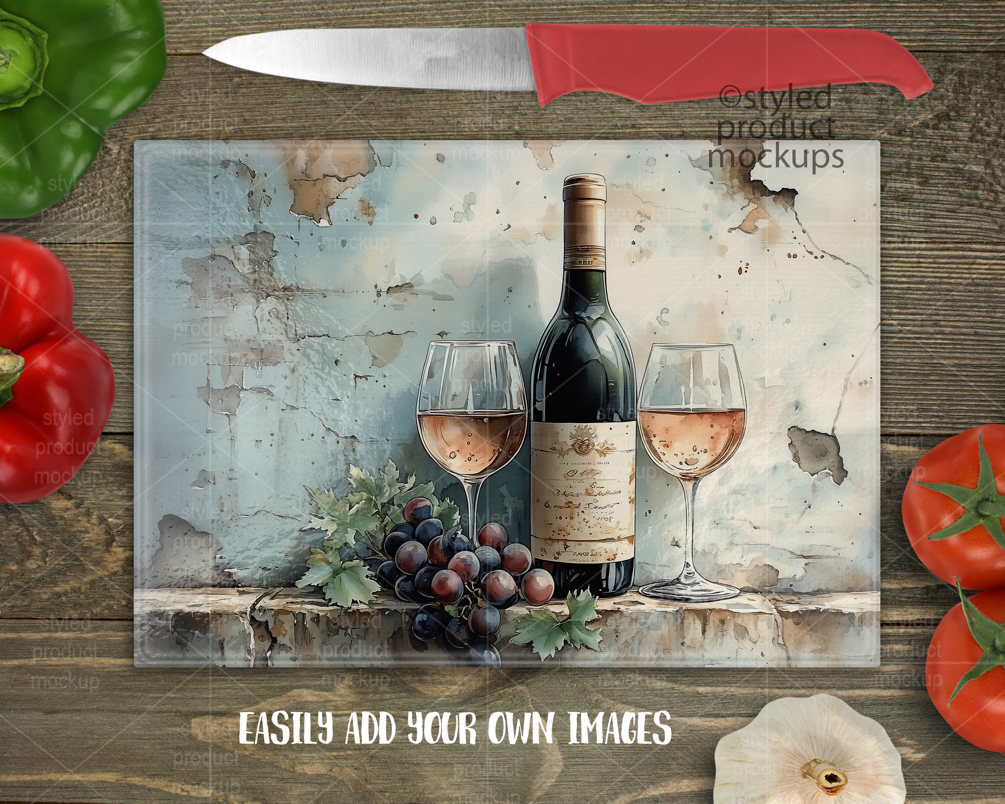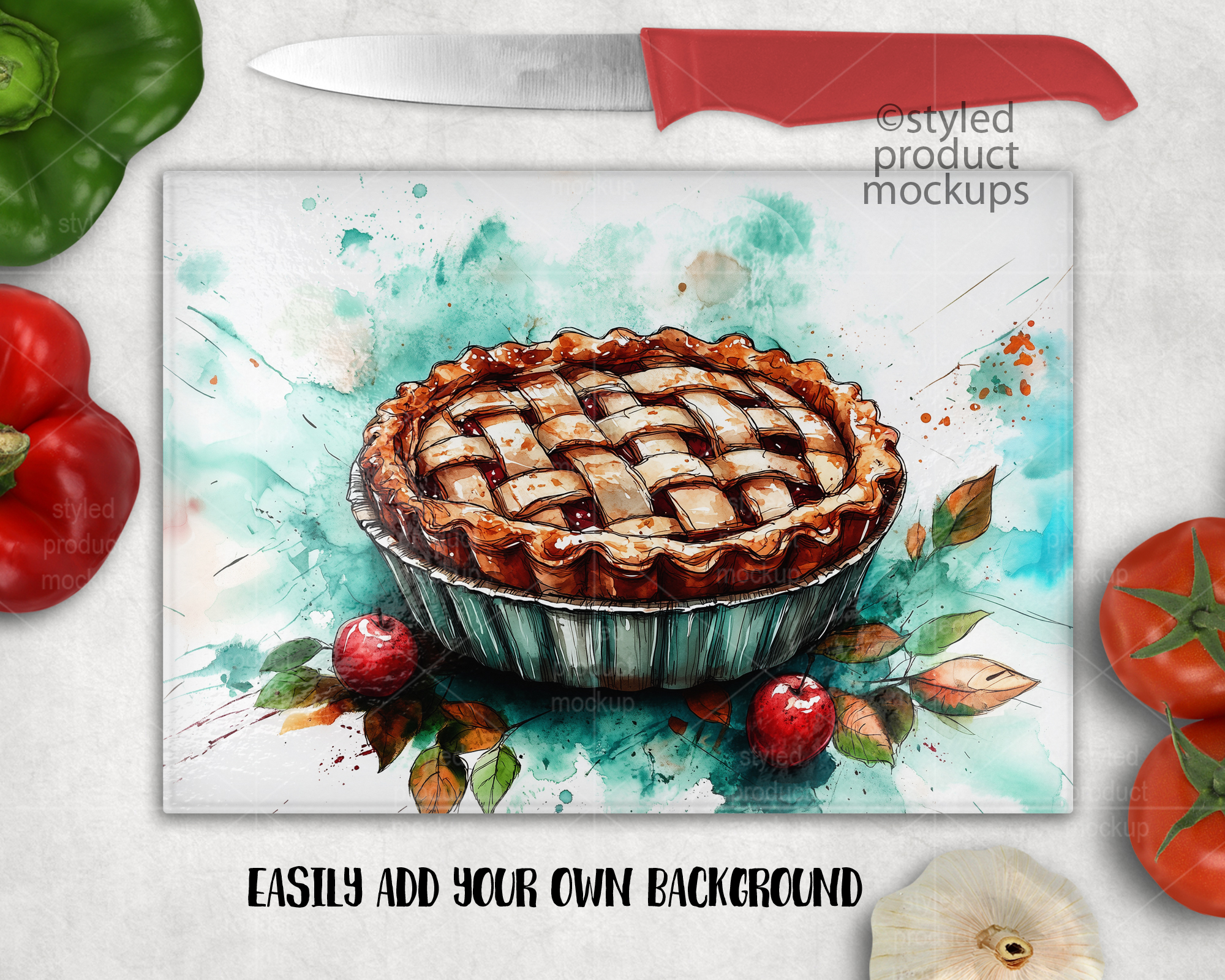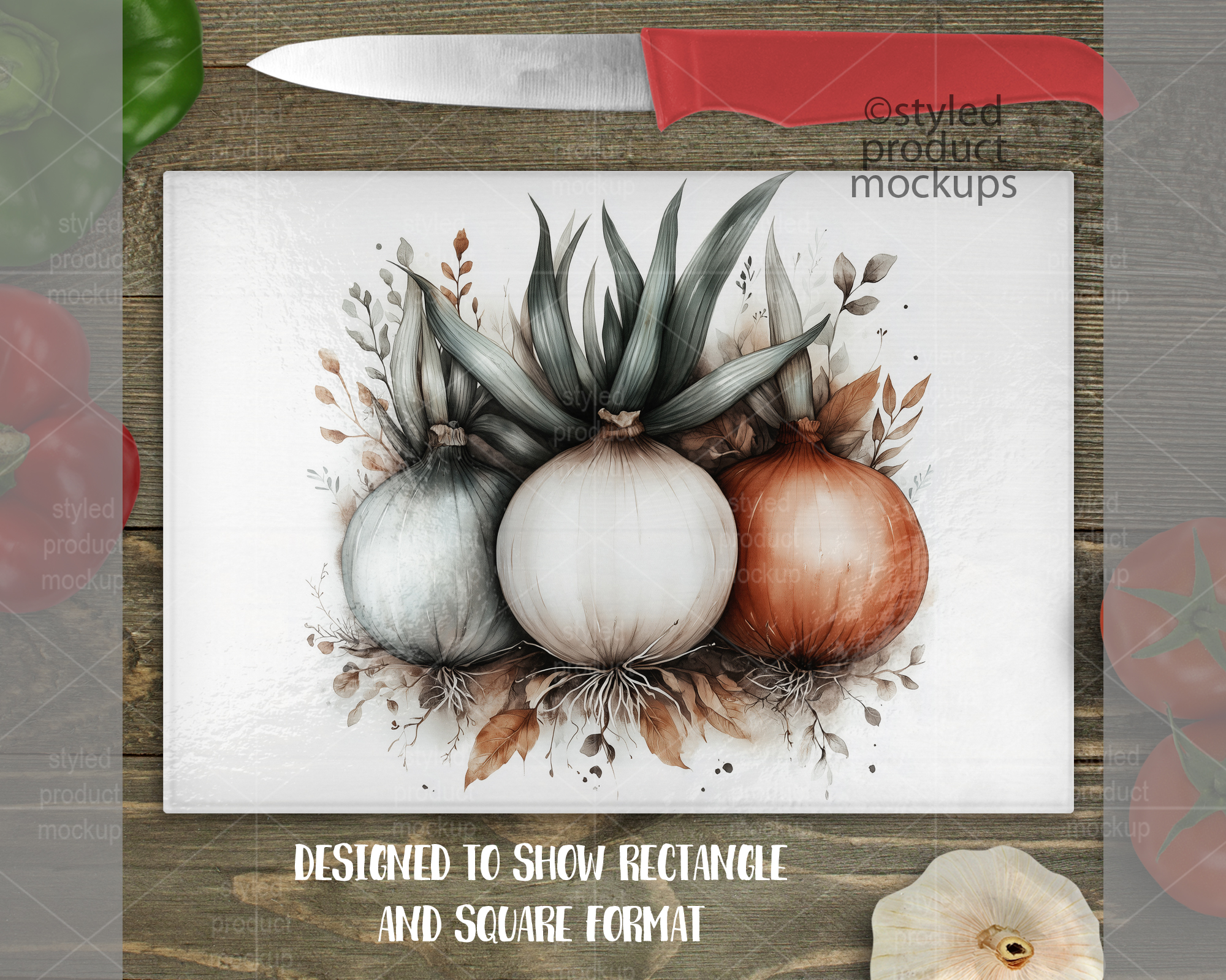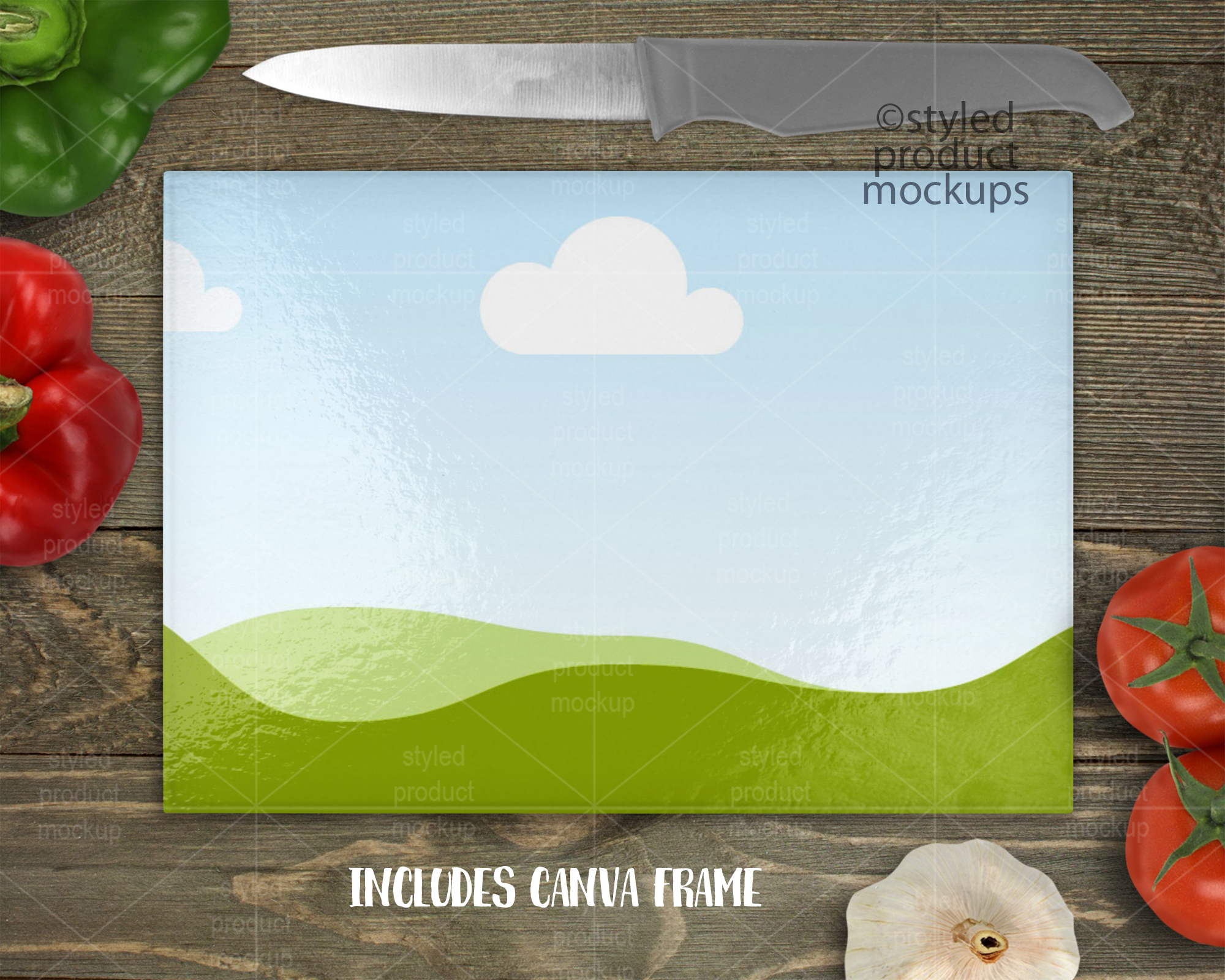 This listing is a mock-up that features a 7.75 x 11 inch rectangle glass cutting board with pebble texture. Give a professional touch to your cutting board without the hassle of photographing each one. This styled product mockups glass cutting board template is ready to use, simply add in your own art files and background. Includes layers for each vegetable and knife so you can move around. Includes wood background.