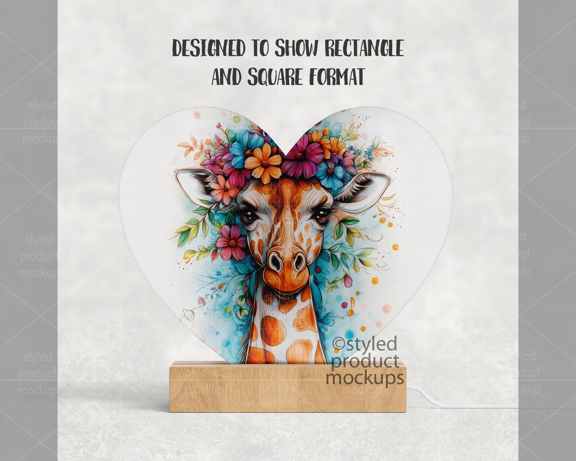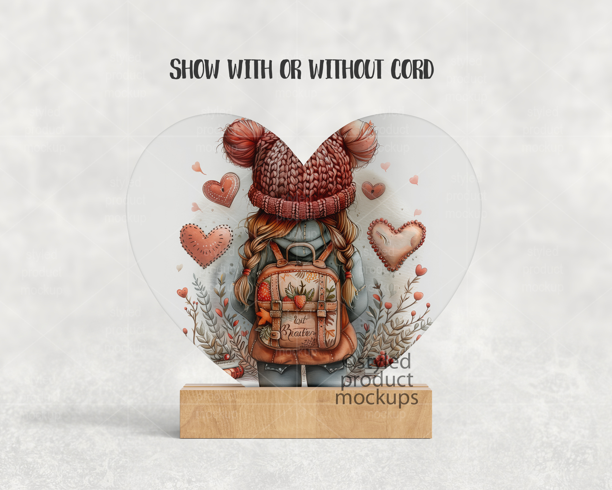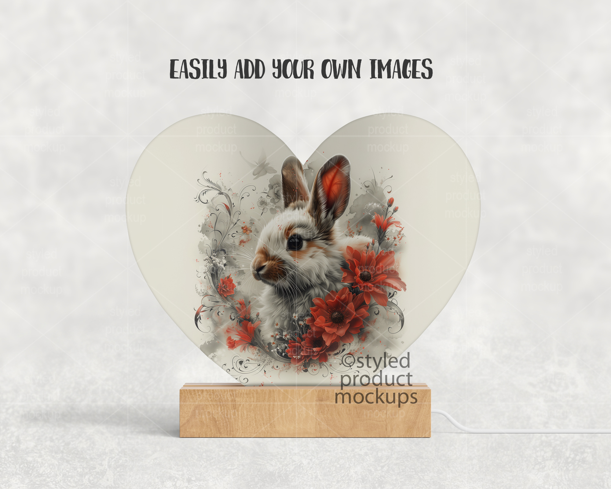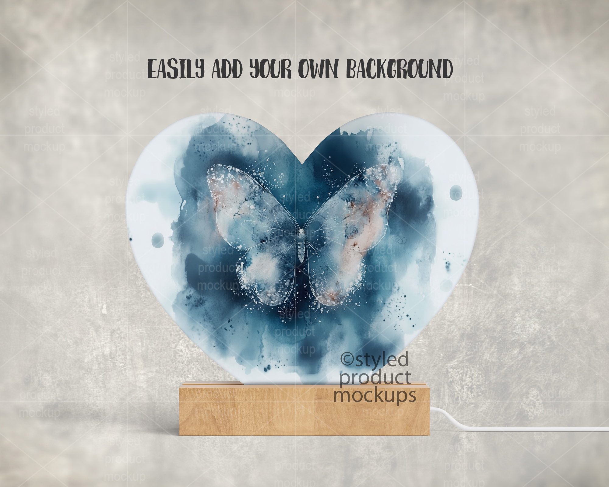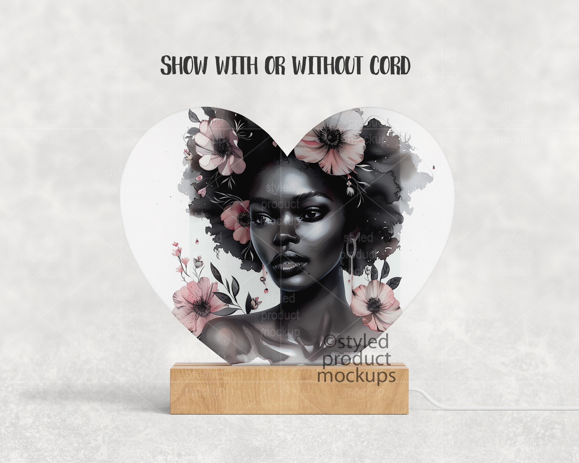 This listing is a mock-up that features a heart shaped LED plaque with a wood base. Give a professional touch to your LED photo panel designs without the hassle of photographing each one. This styled product mockups template is ready to use, simply add in your own art files and background.
