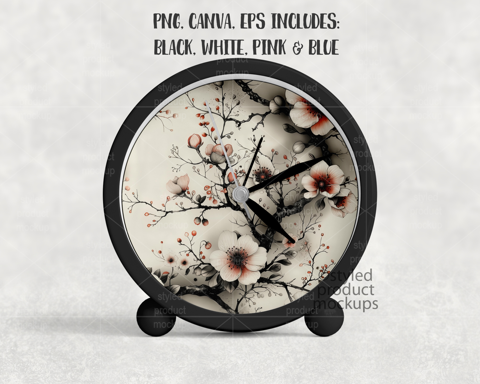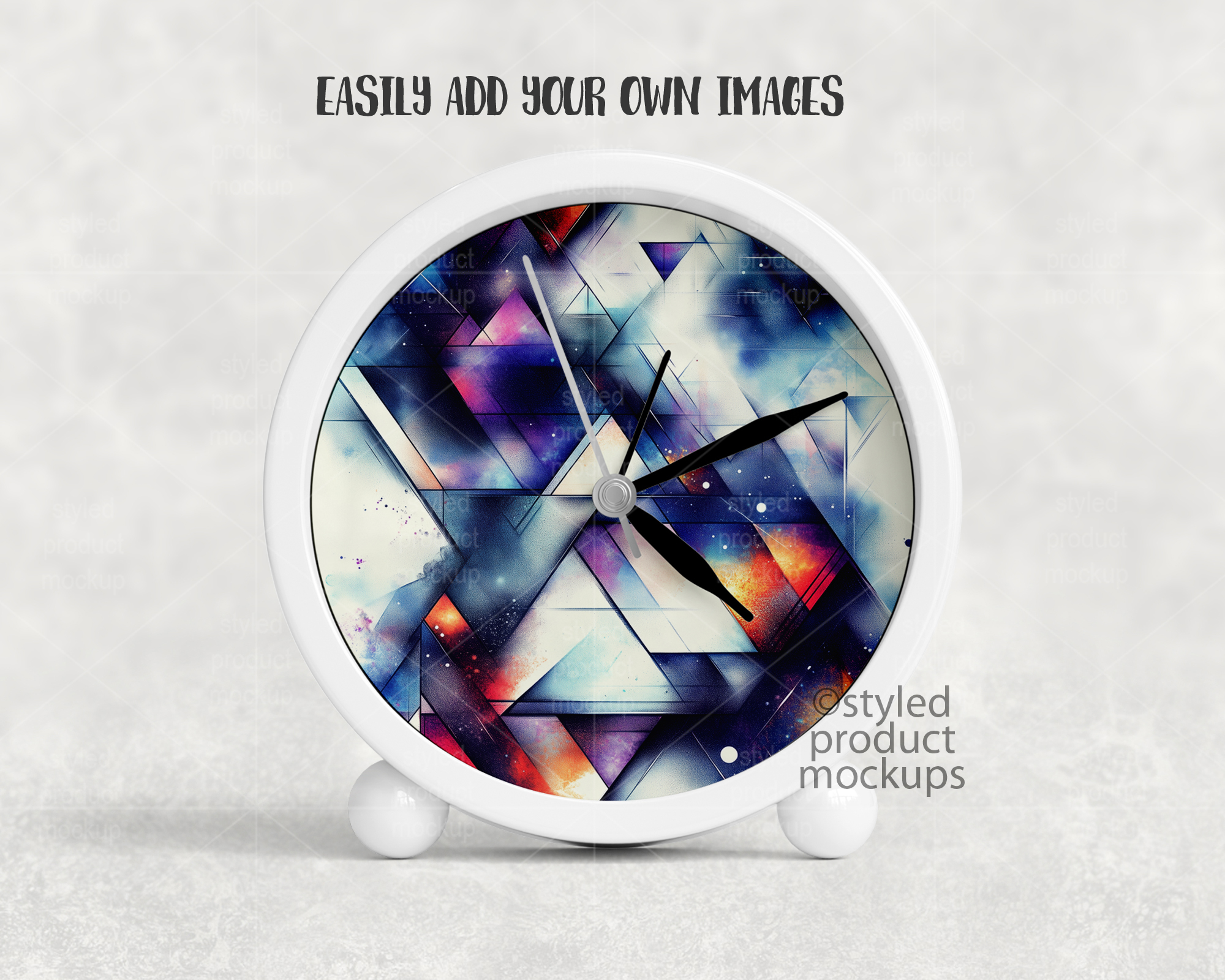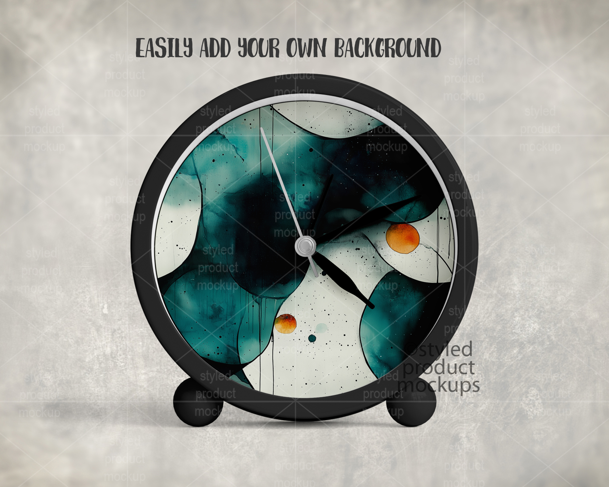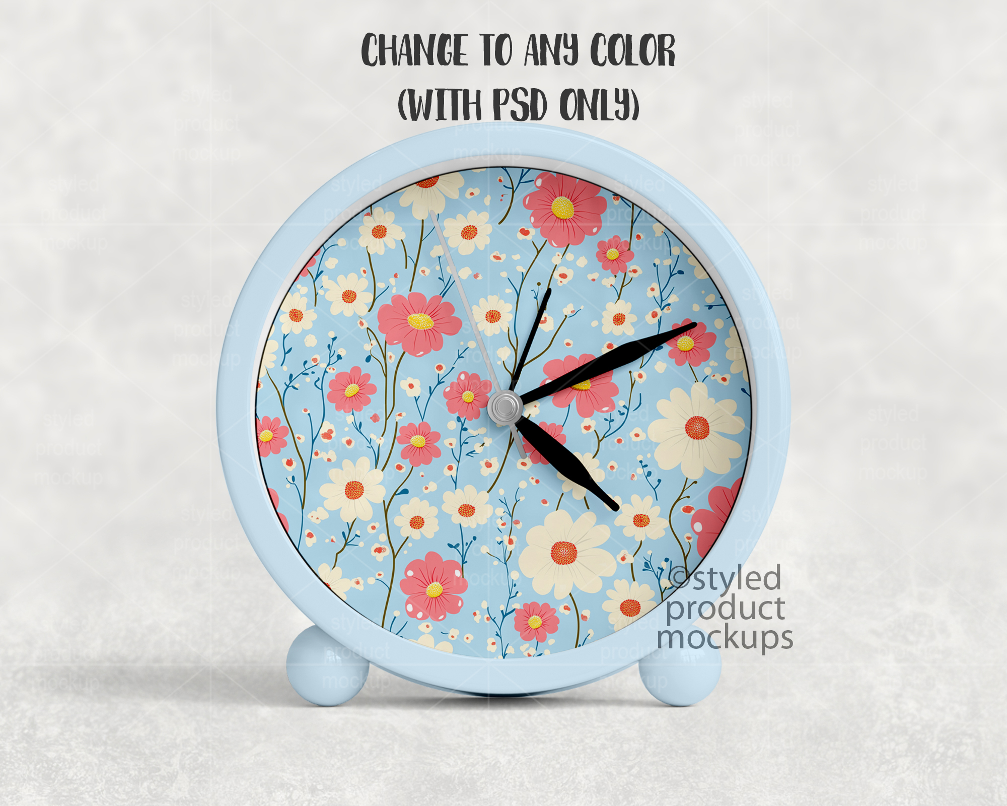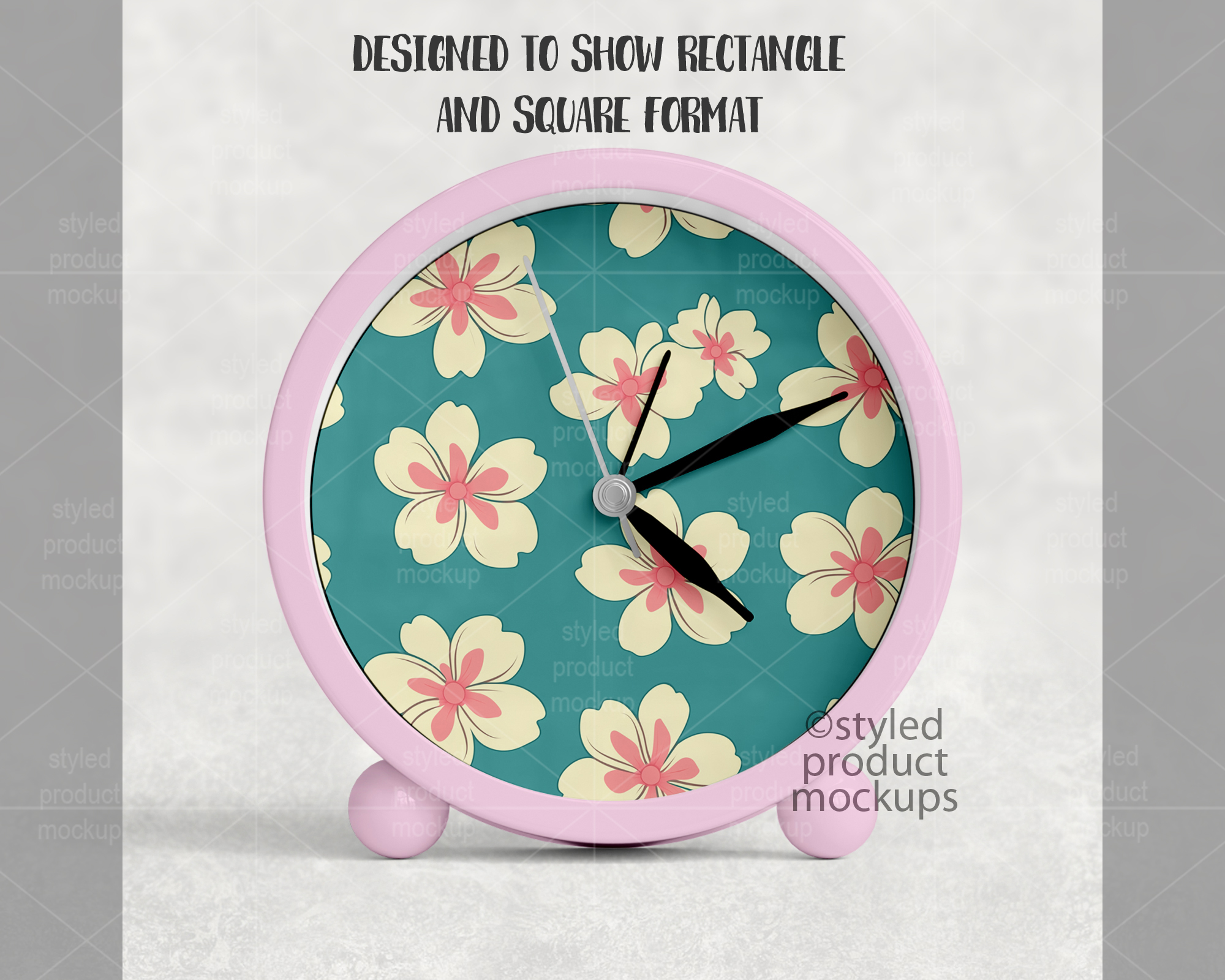 This listing is a mock-up that features a dye sublimation plastic round alarm clock. Give a professional touch to your desktop clock designs without the hassle of photographing each one. This styled product mockups template is ready to use, simply add in your own art files and background.