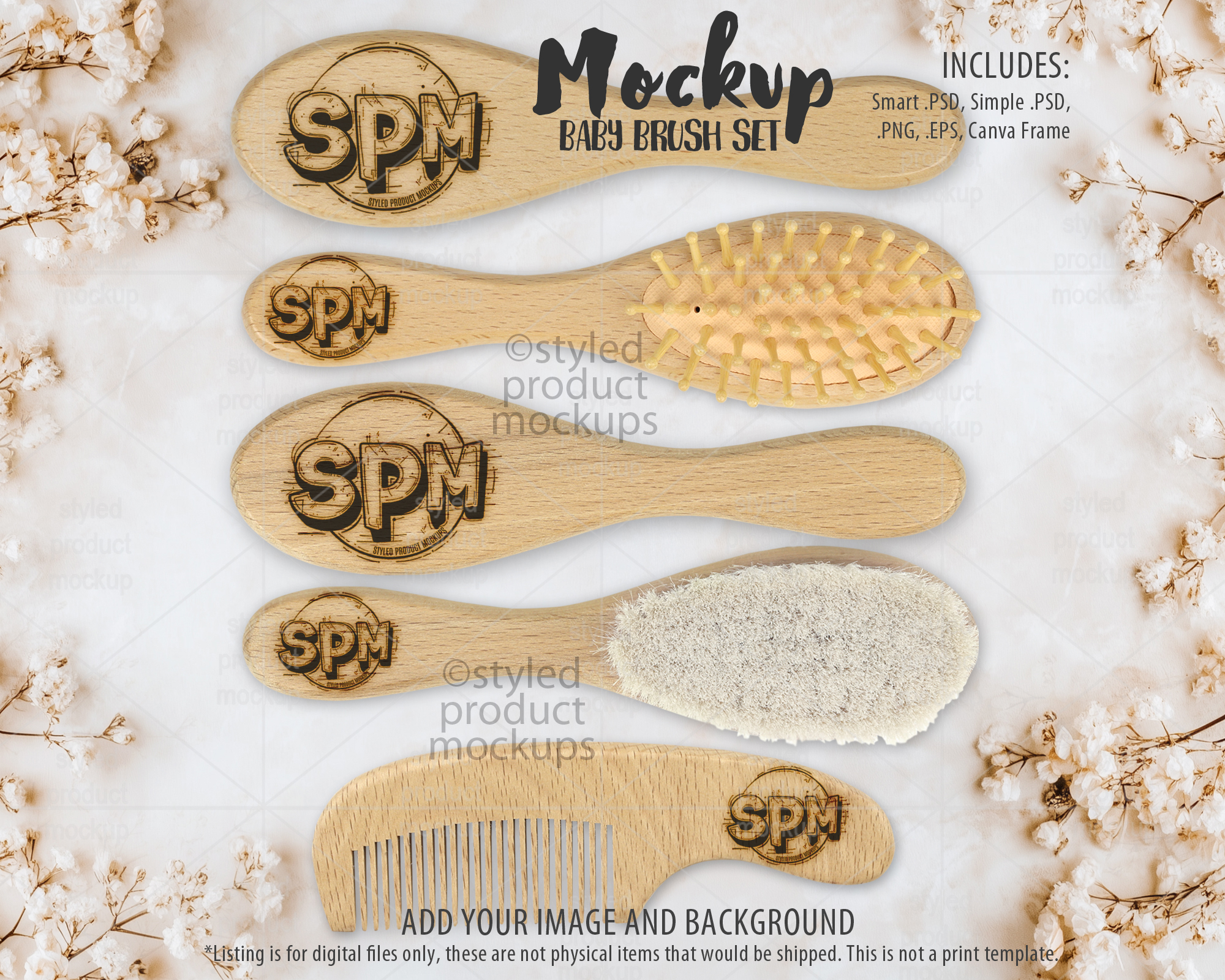 This listing is a mock-up that features a bamboo wood baby brush set. Include soft brush, hard brush and comb showing both sides of each brush. Give a professional touch to your brush set designs without the hassle of photographing each one. This styled product mockups template is ready to use, simply add in your own art files and background.