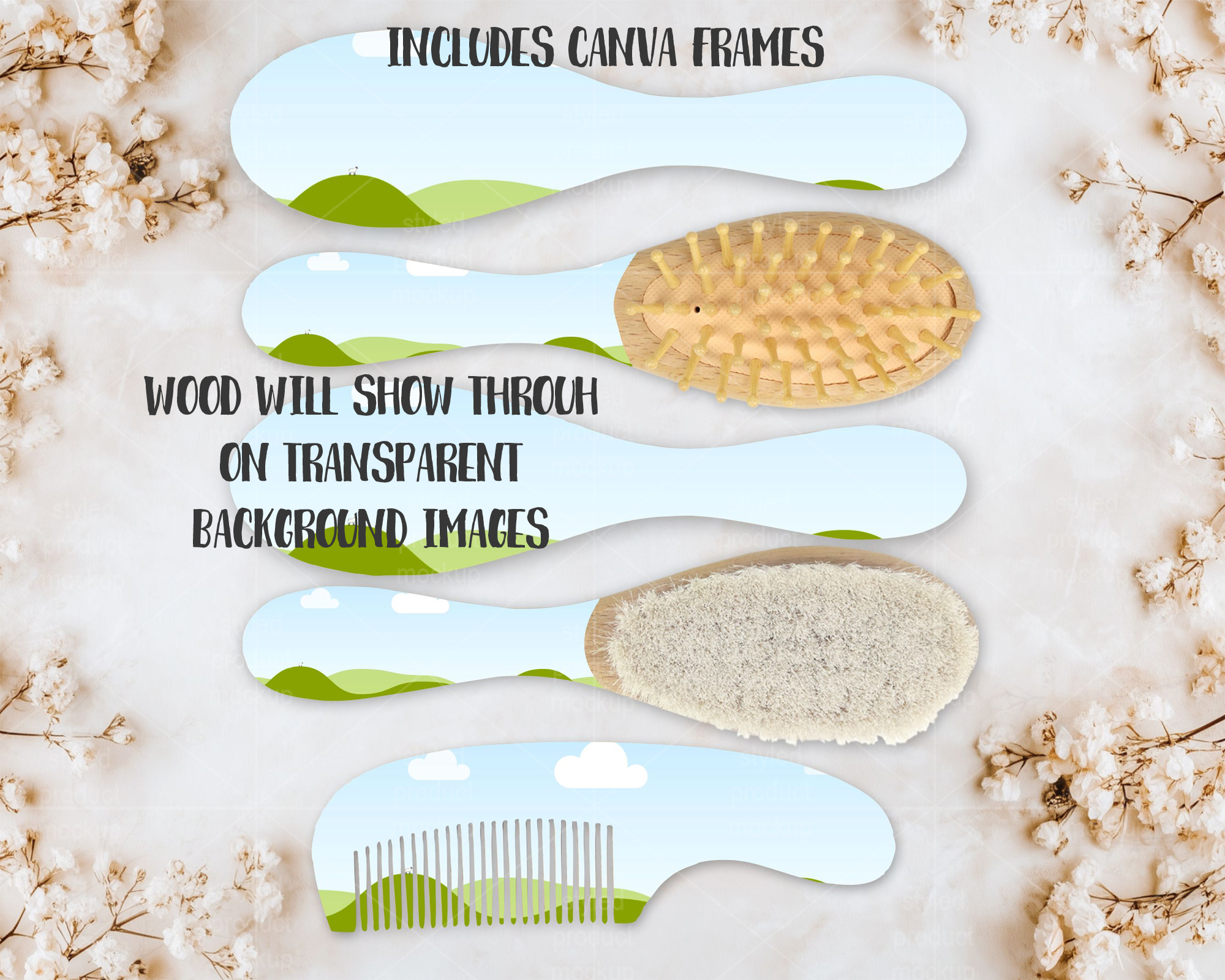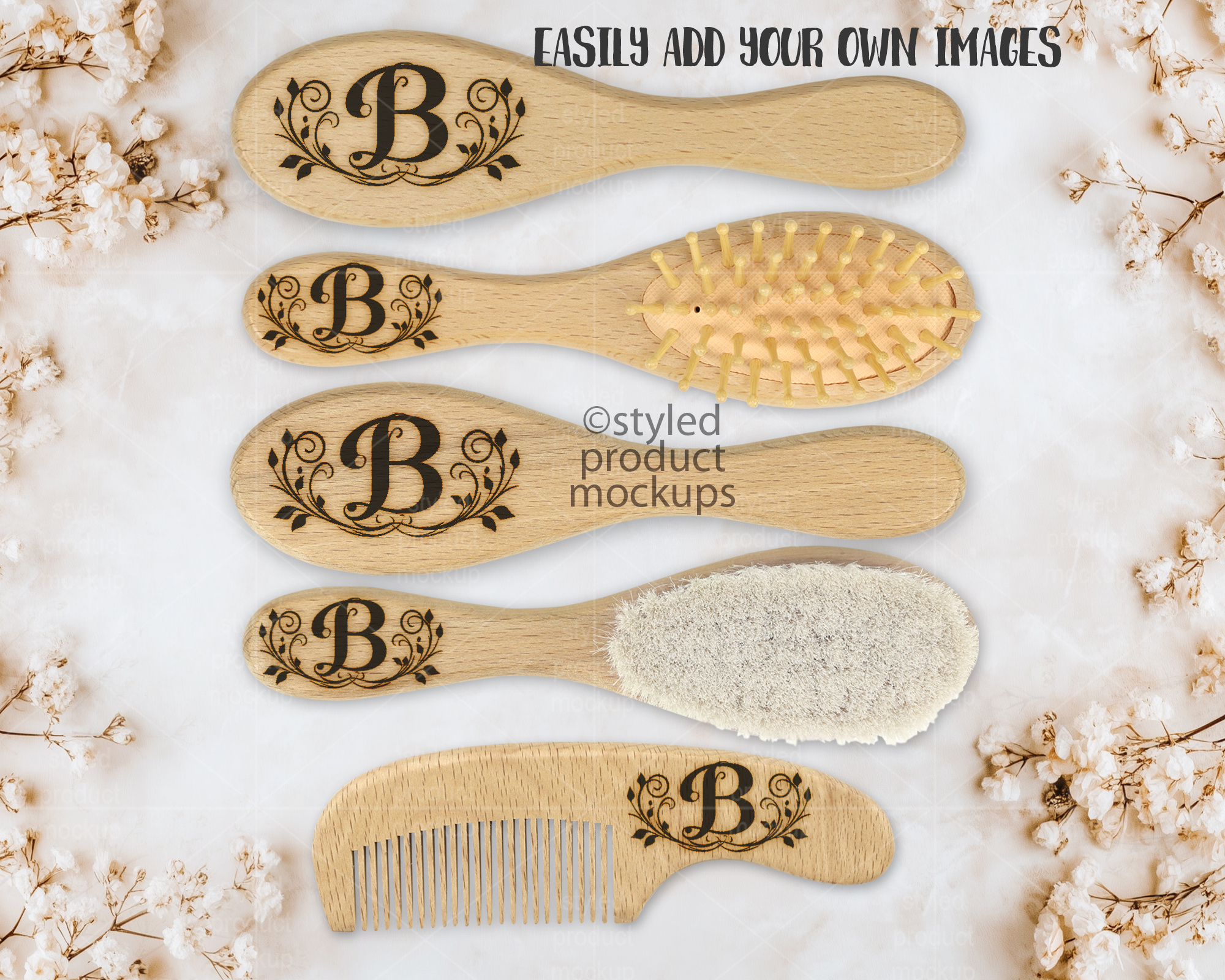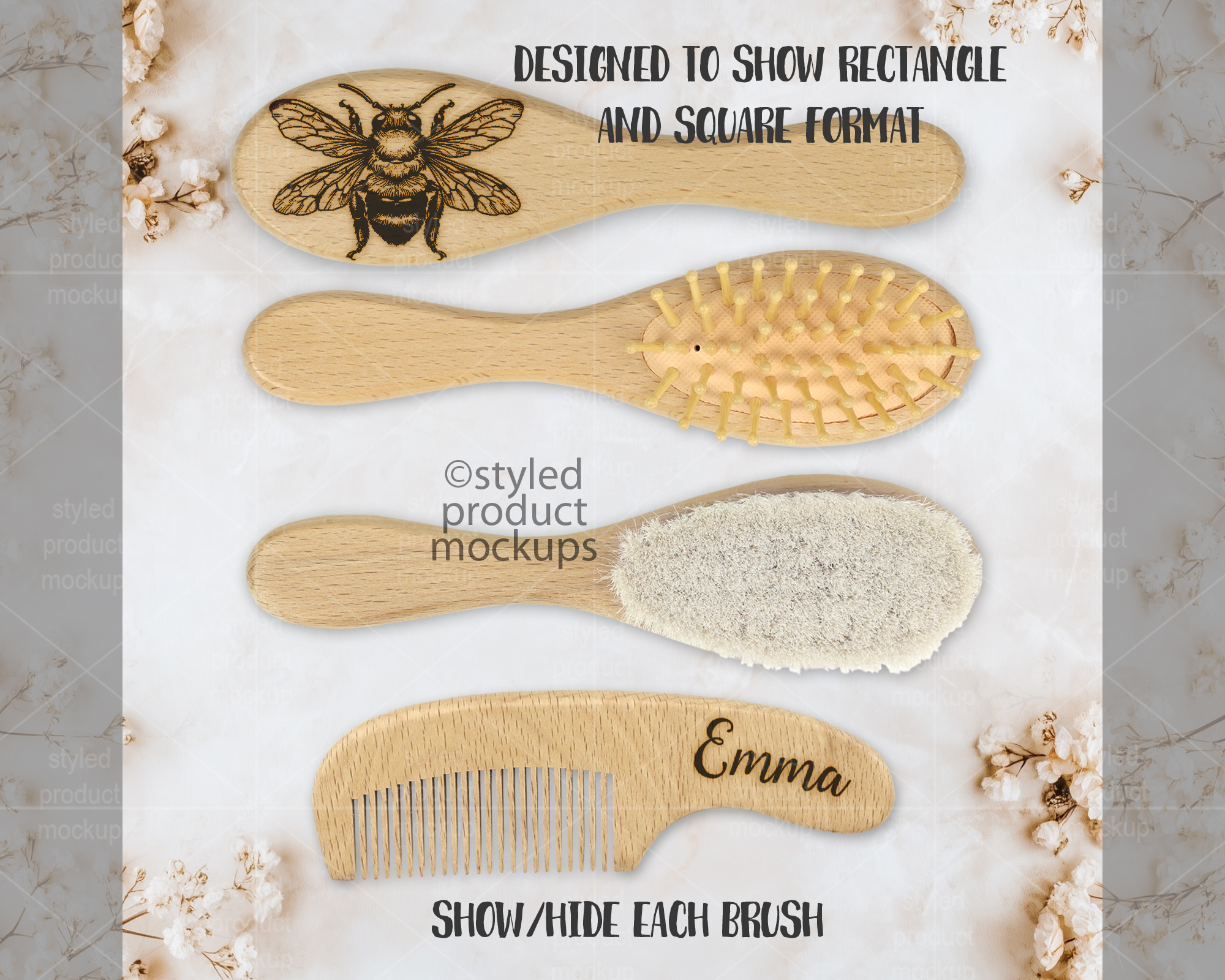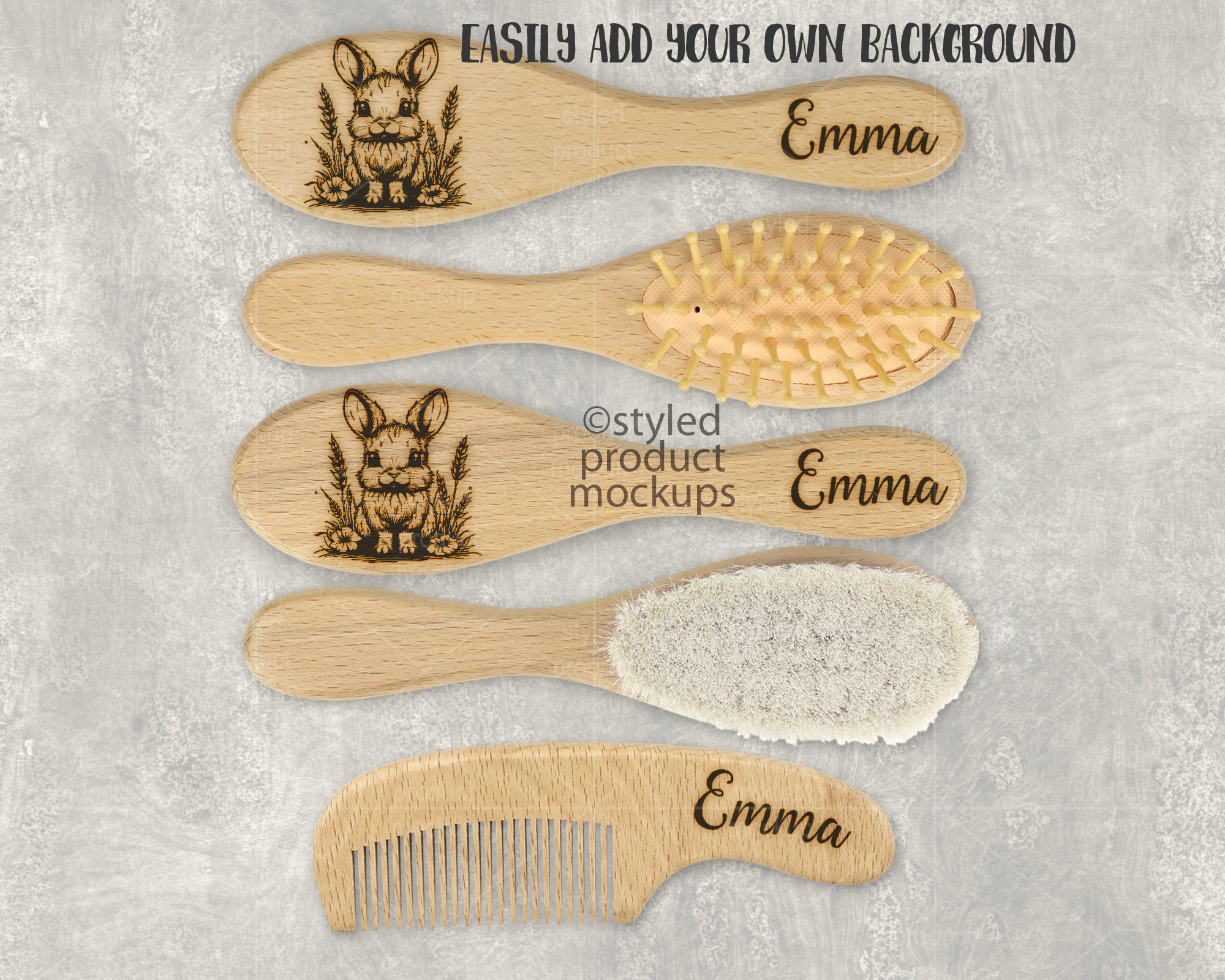 Key Words: brush set, baby brush set, baby grooming set, bamboo, wood, laser engraved, canva mockup, mockup, photoshop mockup, PSD mockup, PNG mockup, stock photography