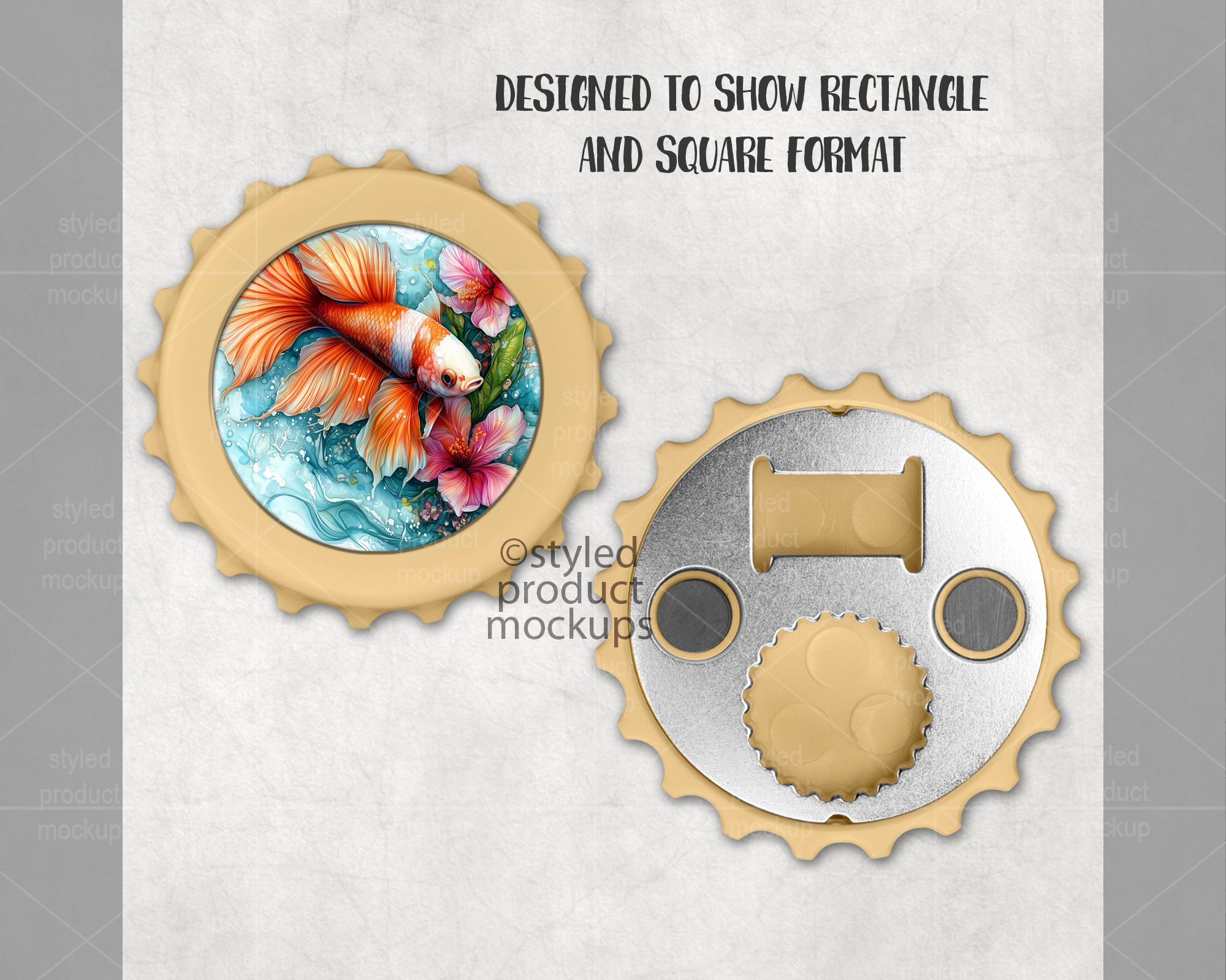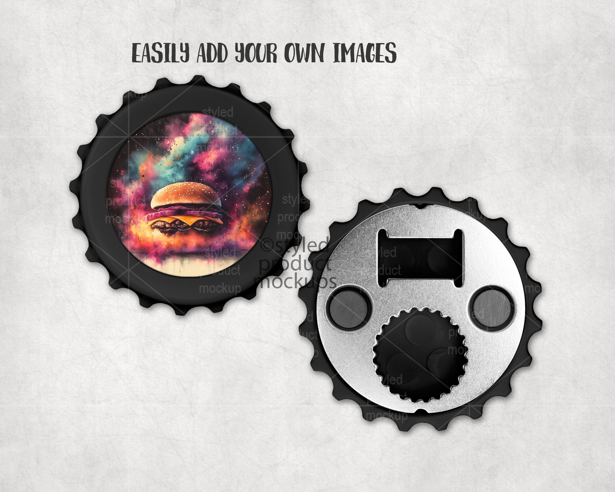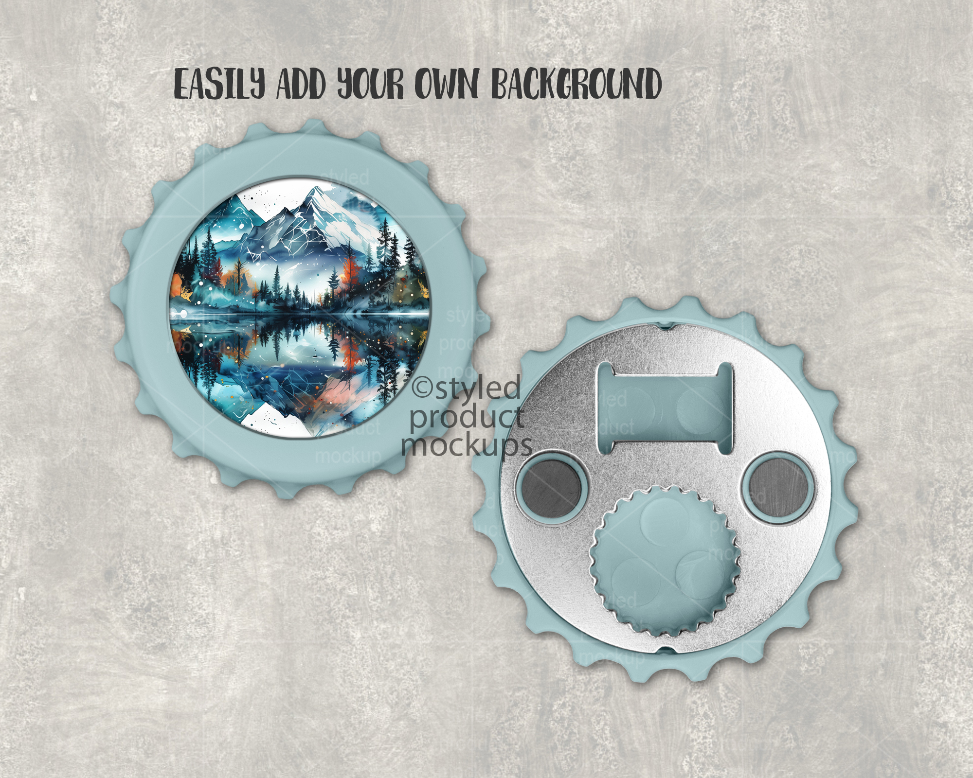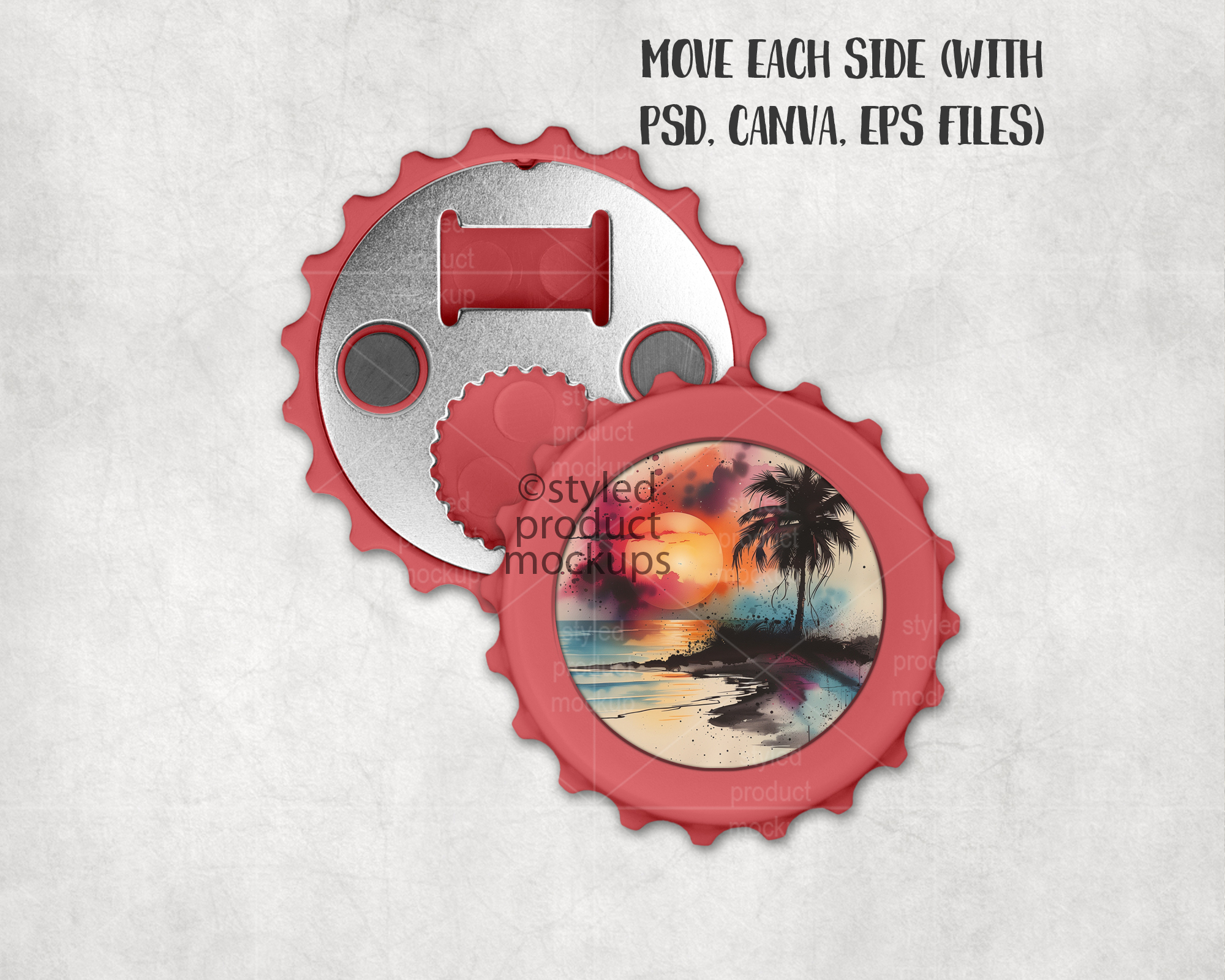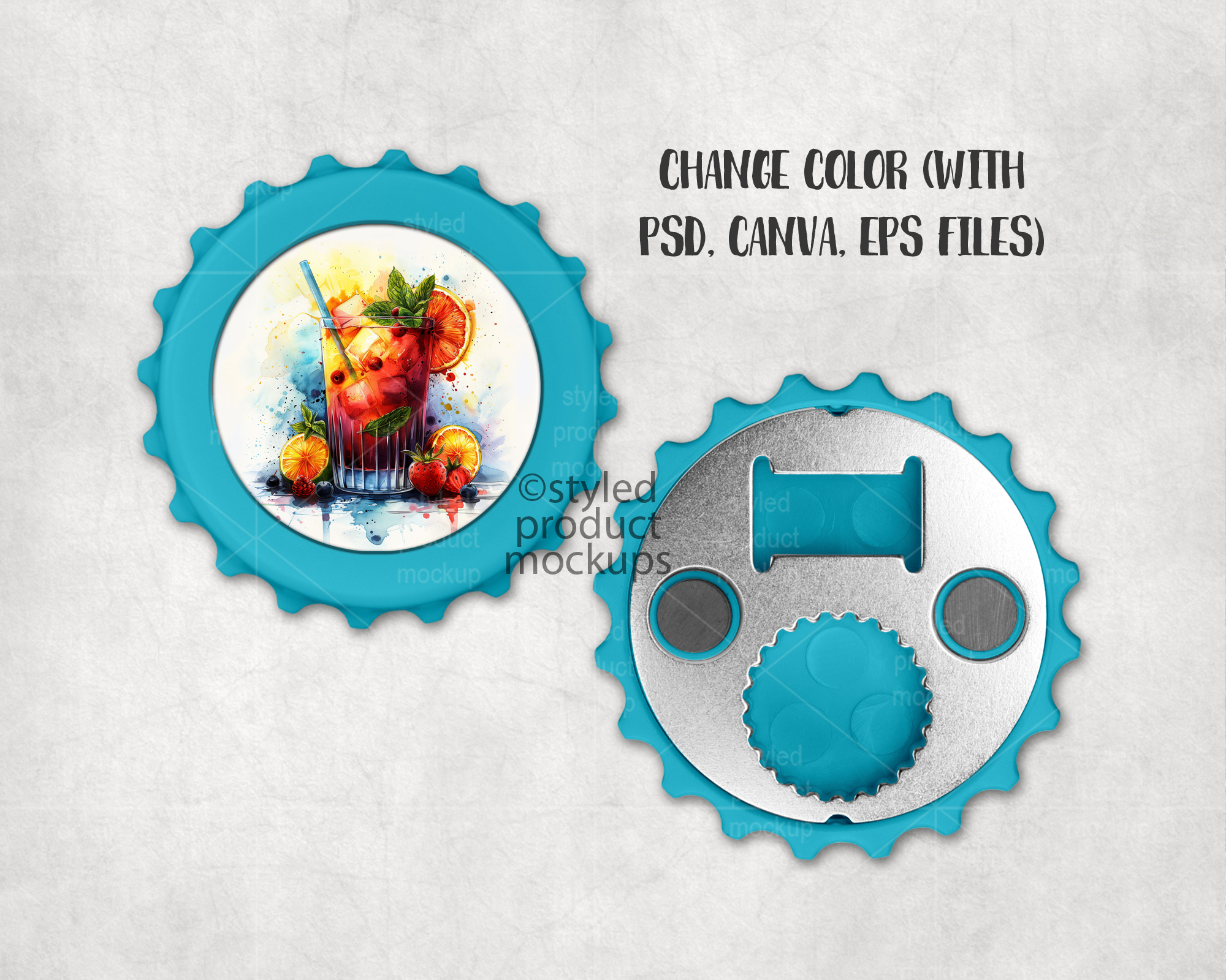 This listing is a mock-up that features a plastic bottlecap shaped bottle opener. Give a professional touch to your bottle opener designs without the hassle of photographing each one. This styled product mockups template is ready to use, simply add in your own art files and background.