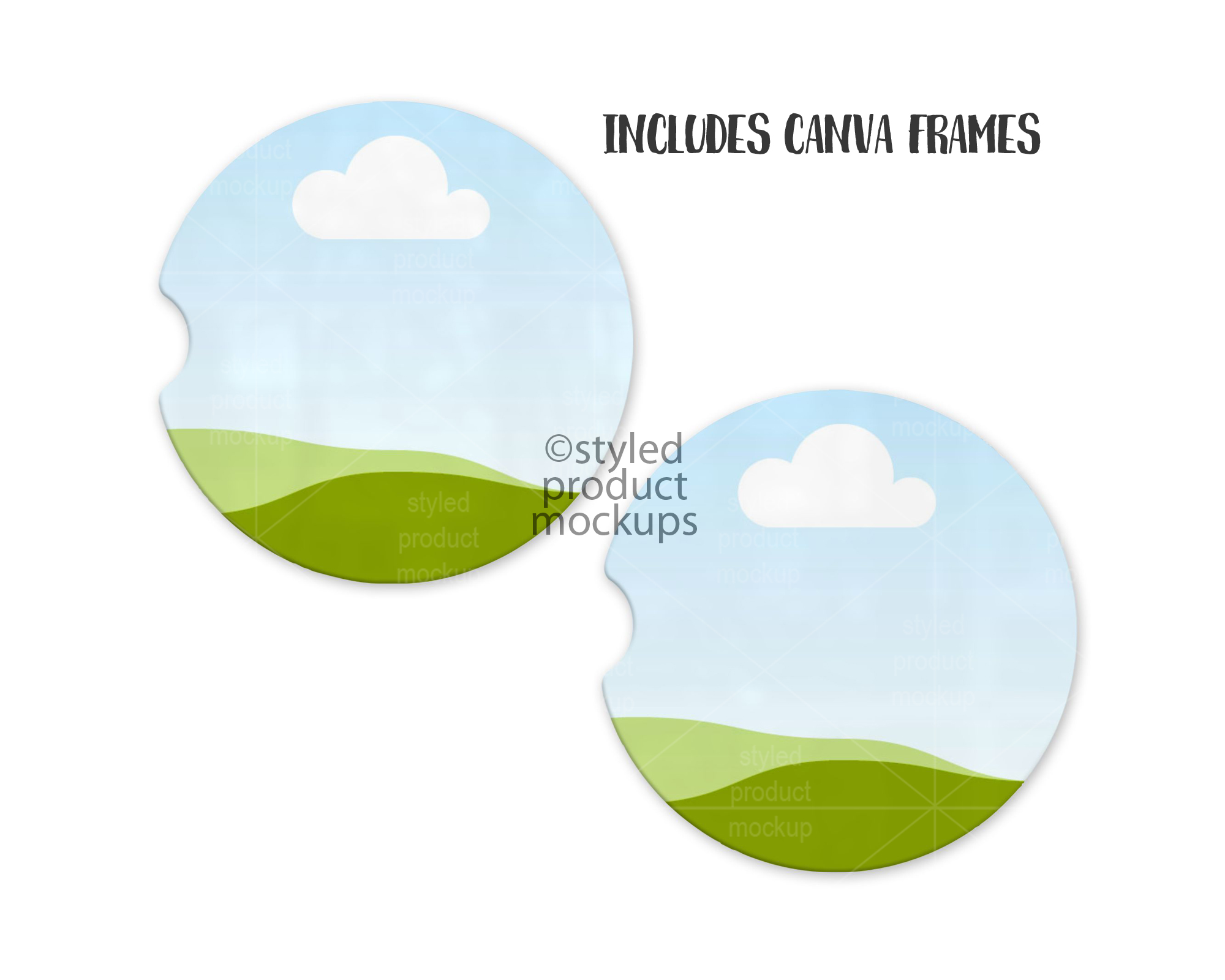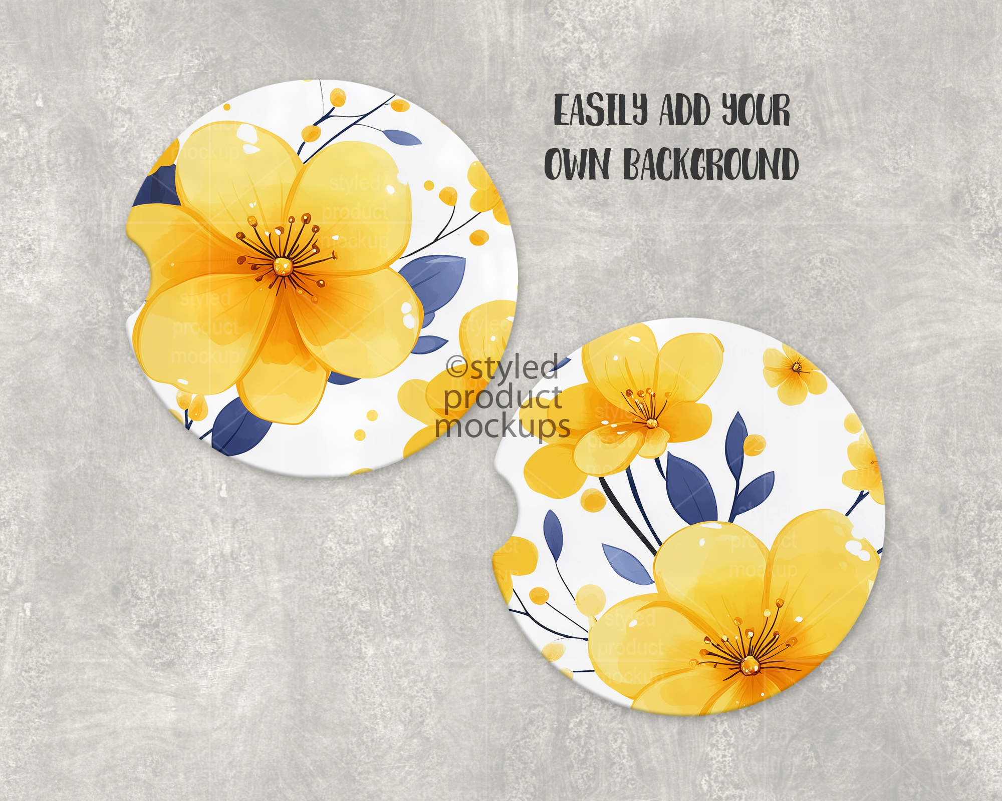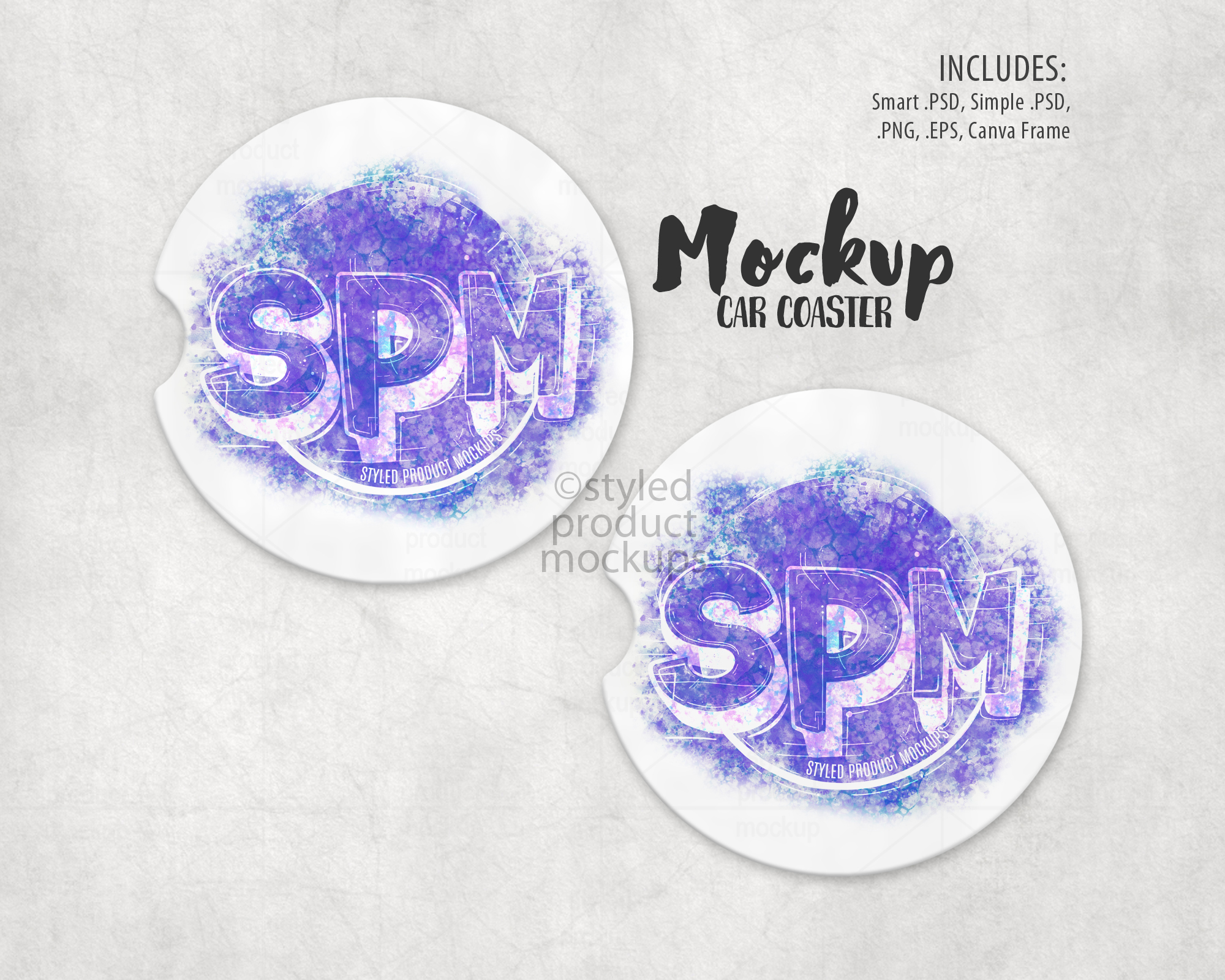 This listing is a mock-up that features a set of two dye sublimation car coasters. Give a professional touch to your car coaster designs without the hassle of photographing each one. This styled product mockups template is ready to use, simply add in your own art files and background.