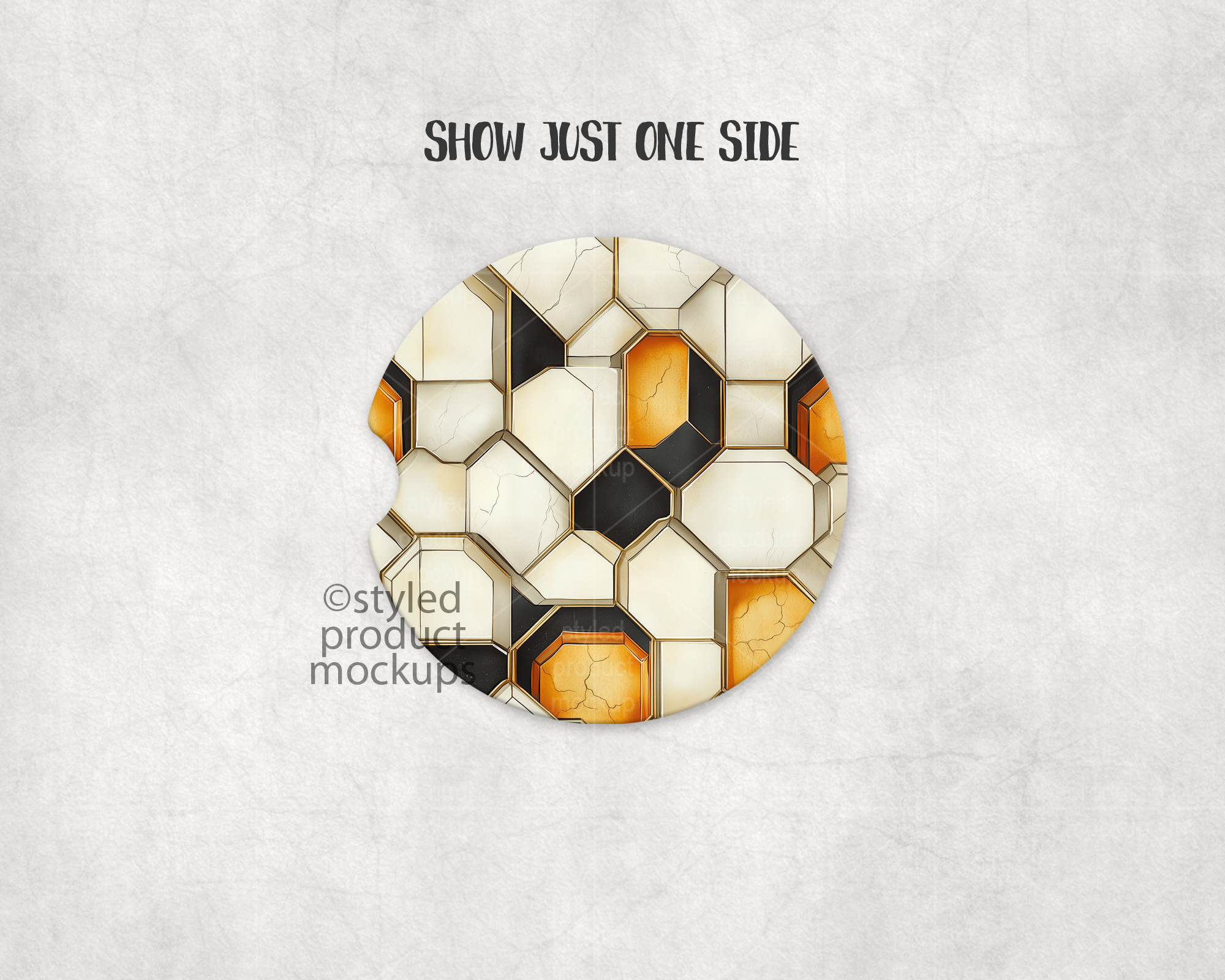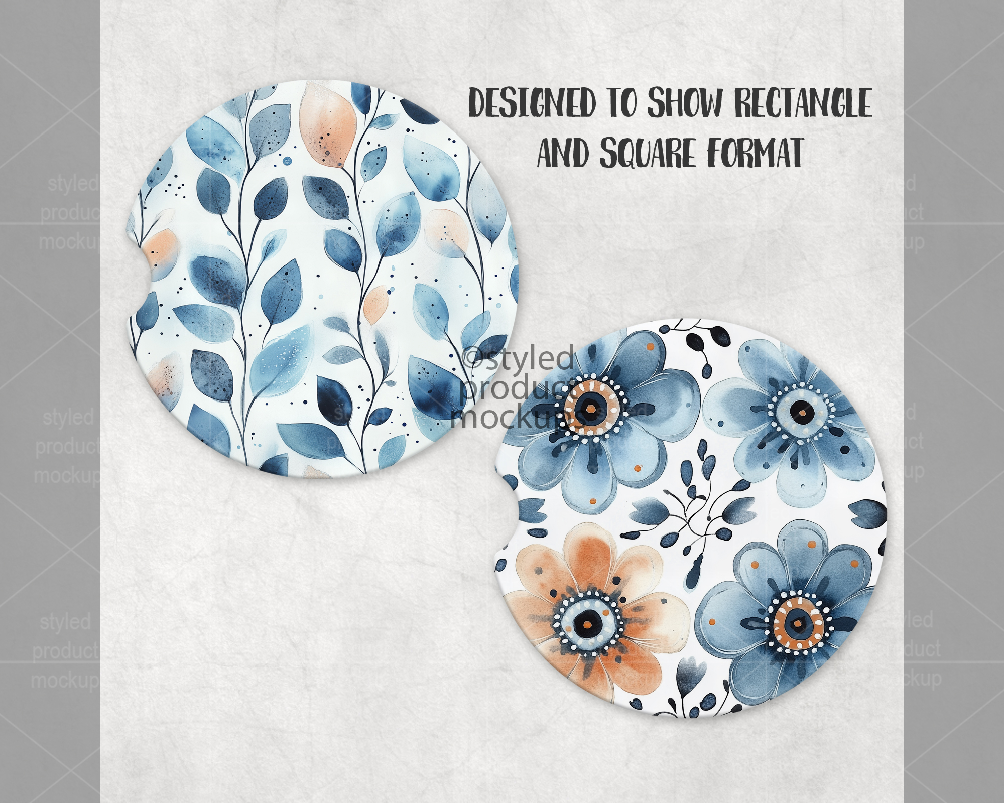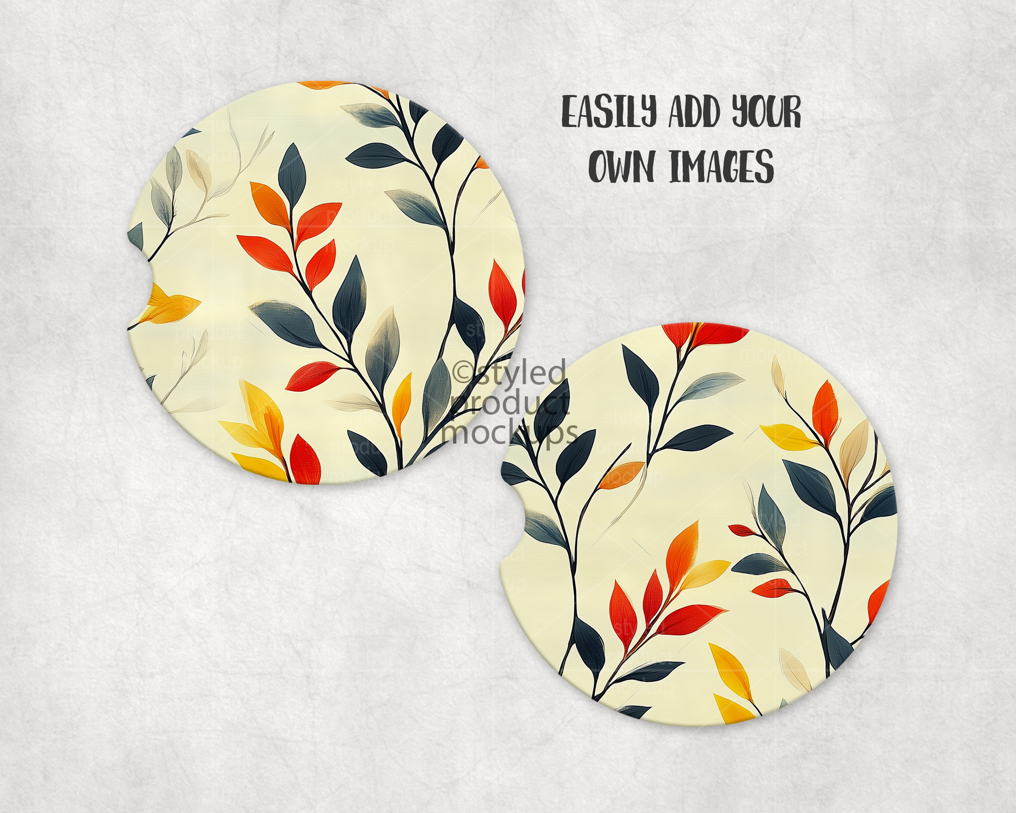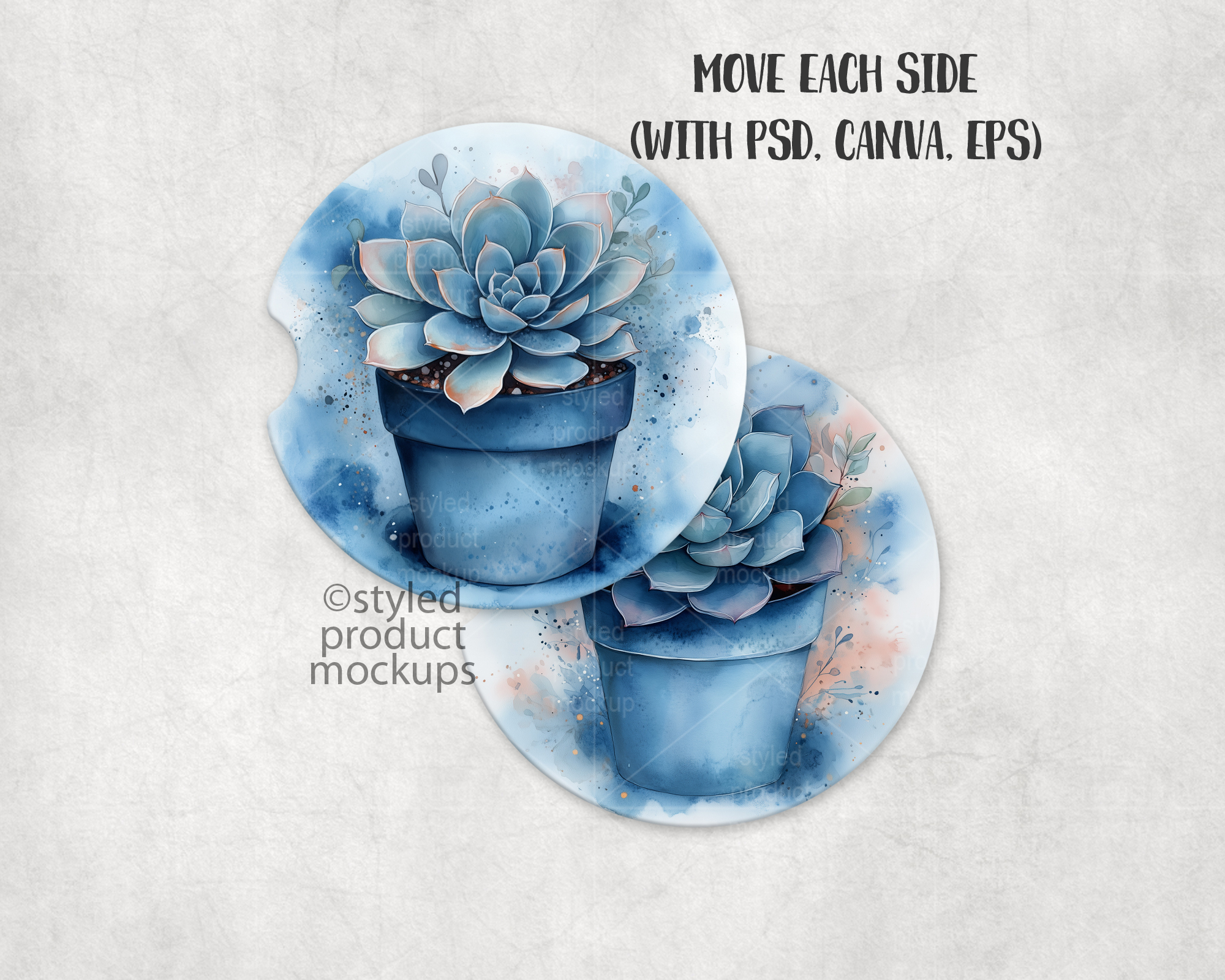 This listing is a mock-up that features a set of two dye sublimation car coasters. Give a professional touch to your car coaster designs without the hassle of photographing each one. This styled product mockups template is ready to use, simply add in your own art files and background.