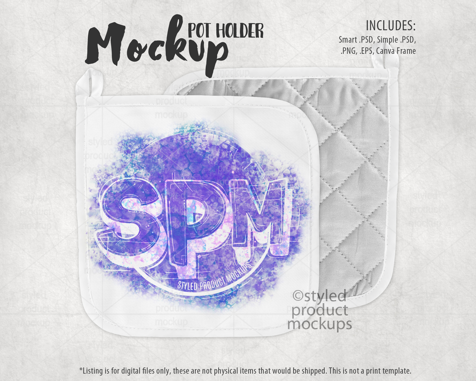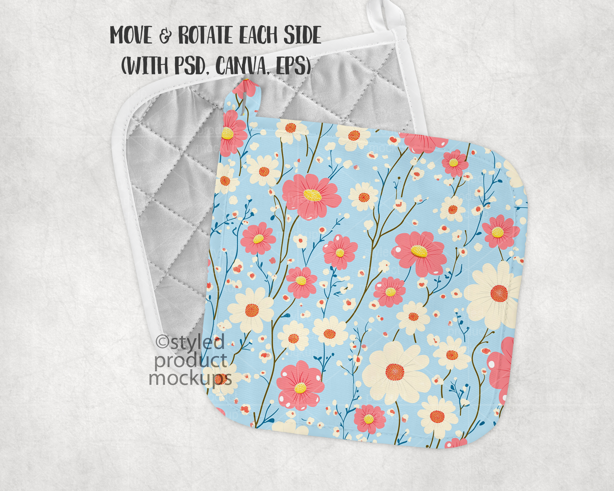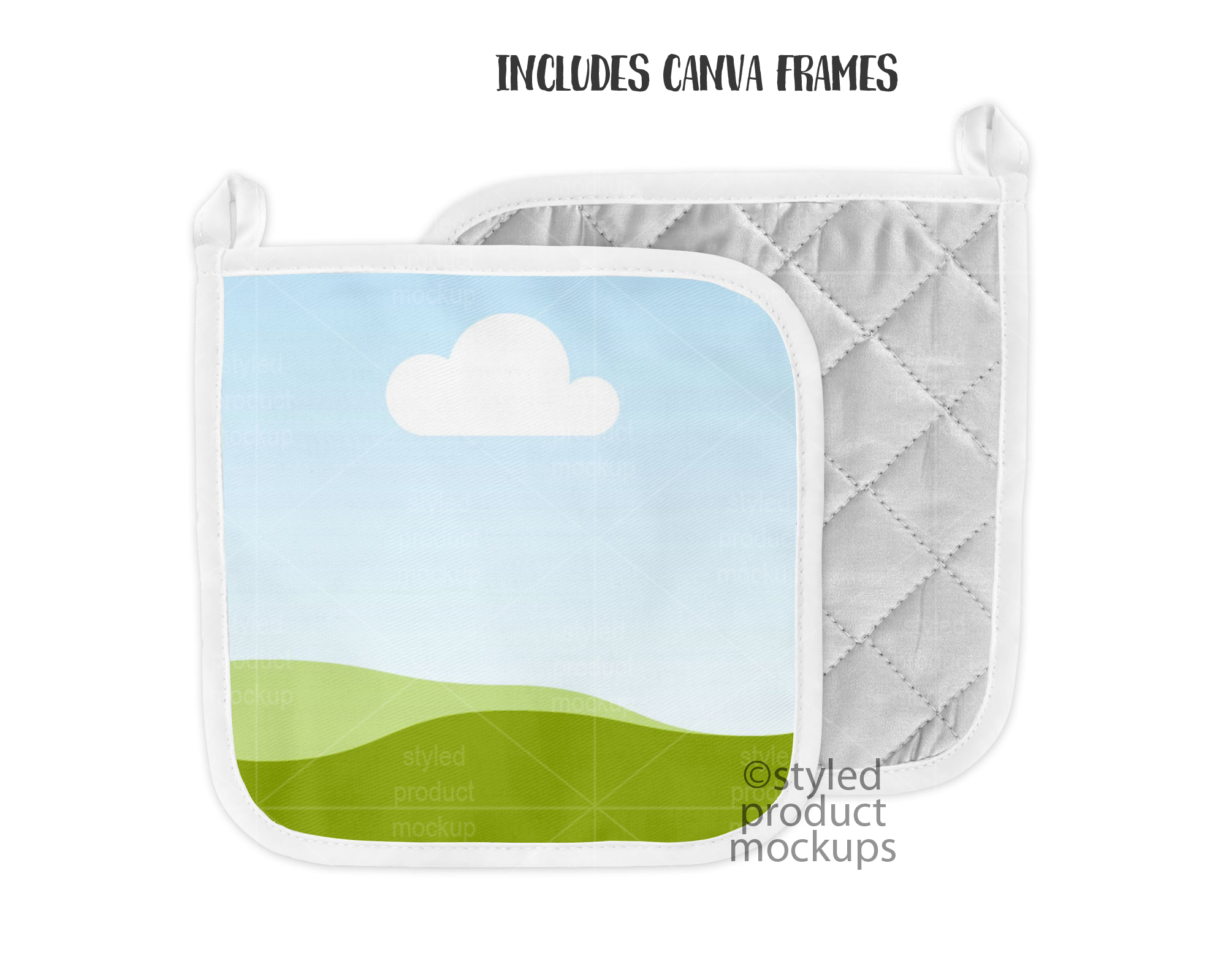 Key Words: pot holder, pot, holder, corner loop, potholder, sublimation, mockup, template, display, PSD, PNG, digital, stock photography