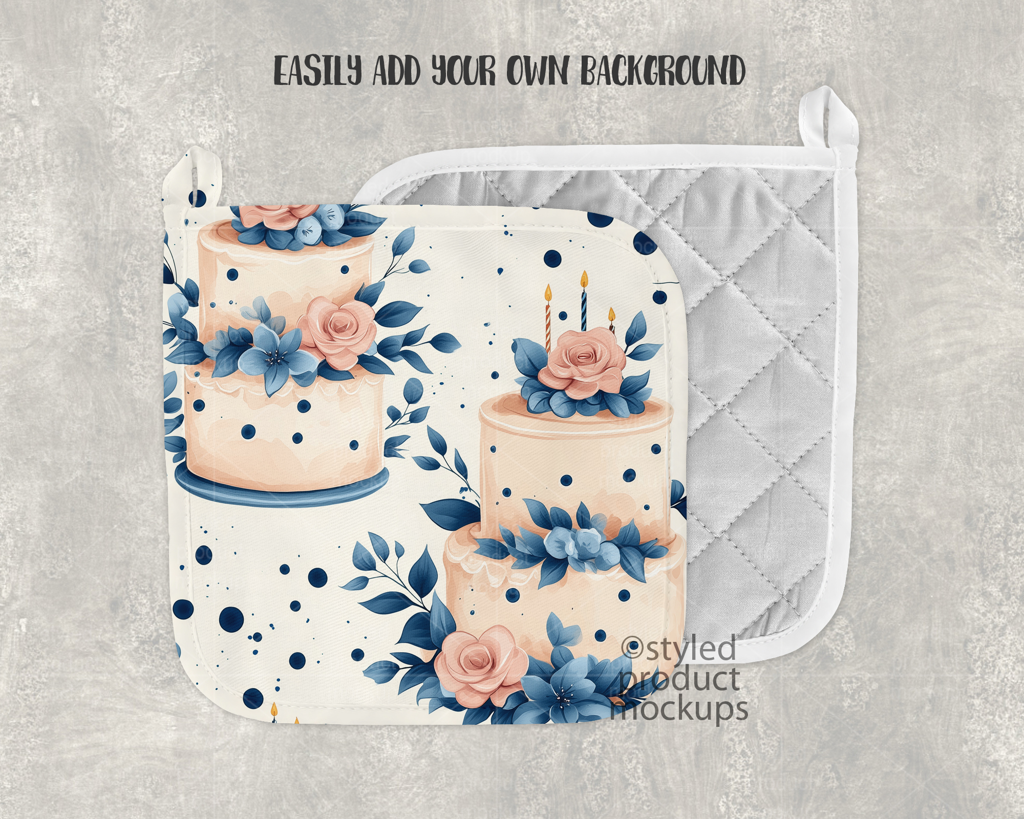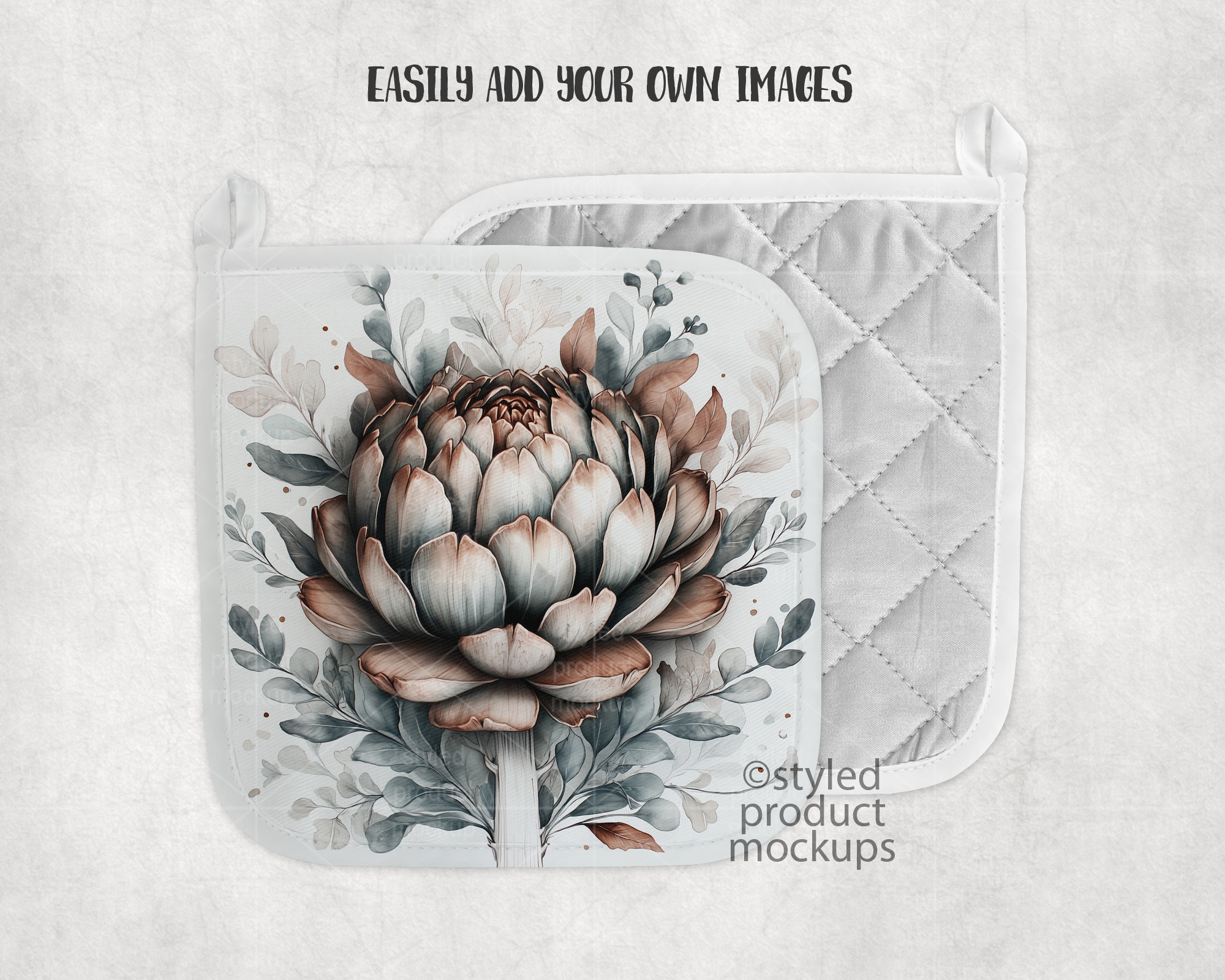 This listing is a mock-up that features a dye sublimation potholder with corner loop. Give a professional touch to your potholder designs without the hassle of photographing each one. This styled product mockup template is ready to use, simply add in your own art files and background.