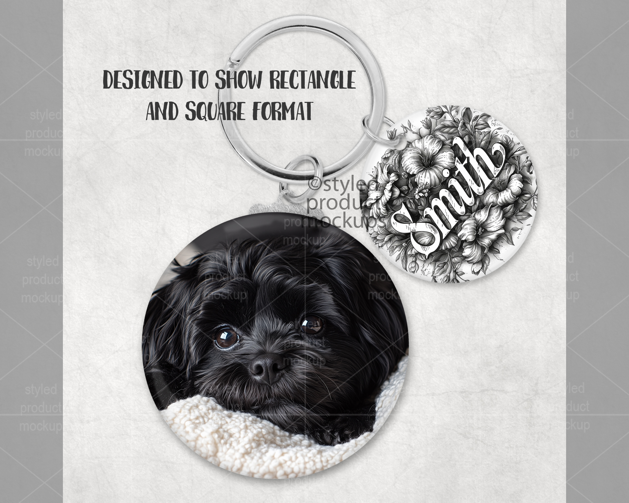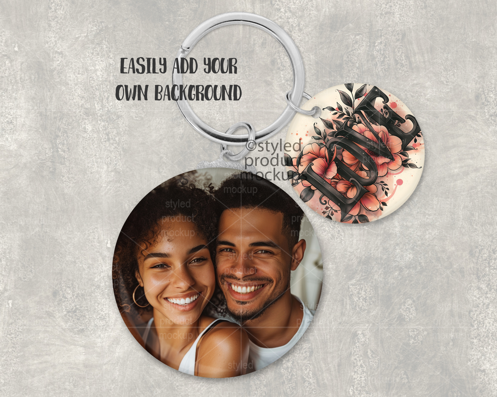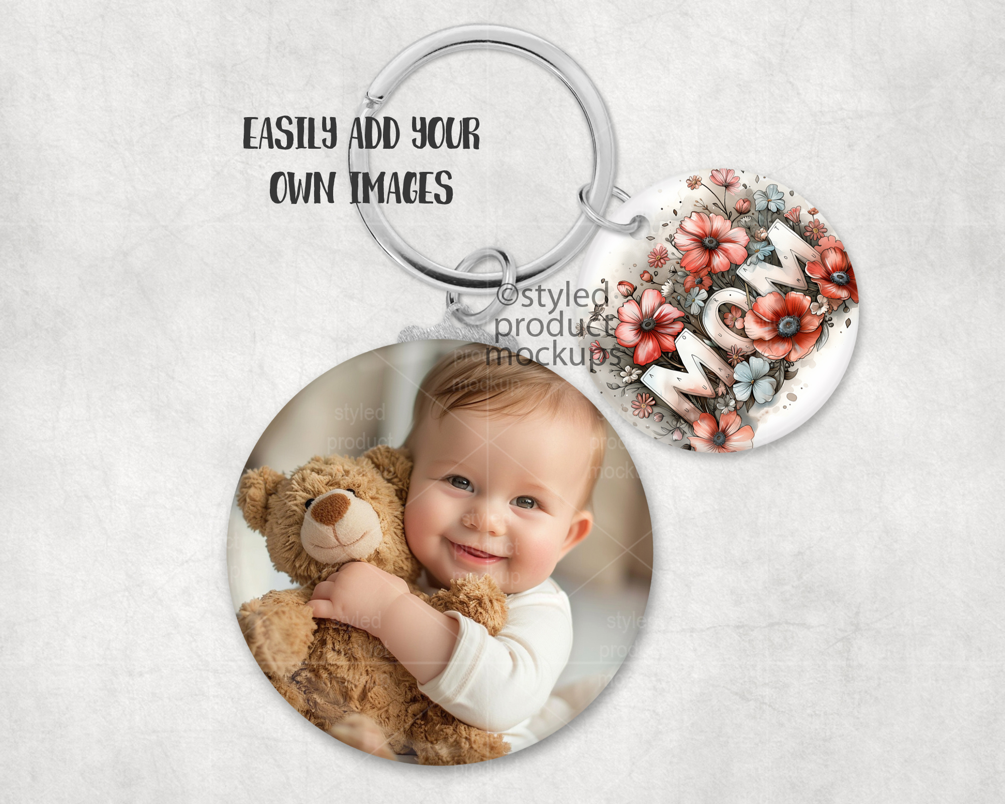 This listing is a mock-up that features button keychain with one large and one small button. Give a professional touch to your button keyring designs without the hassle of photographing each one. Our template is ready to use, simply add in your own art files and background.