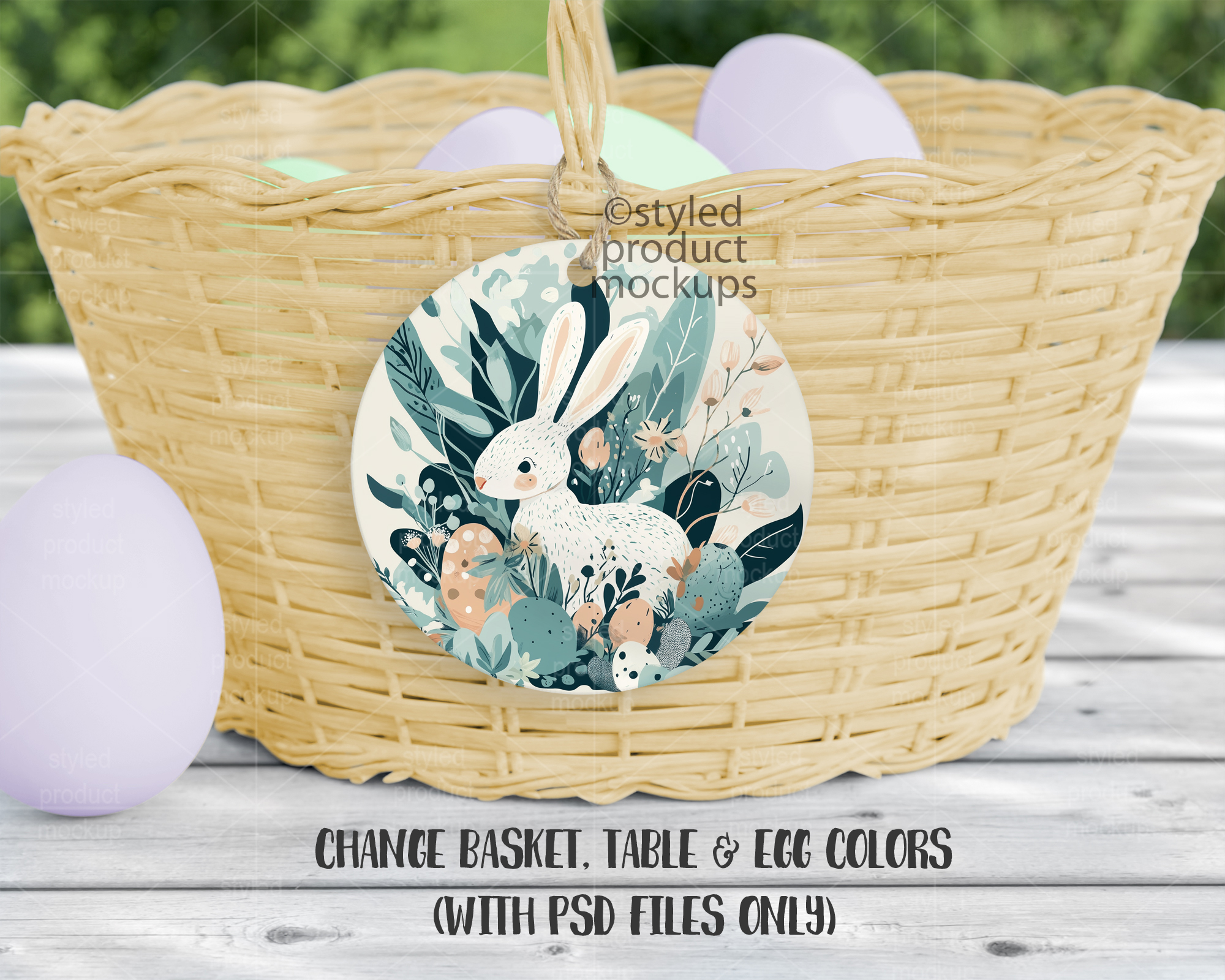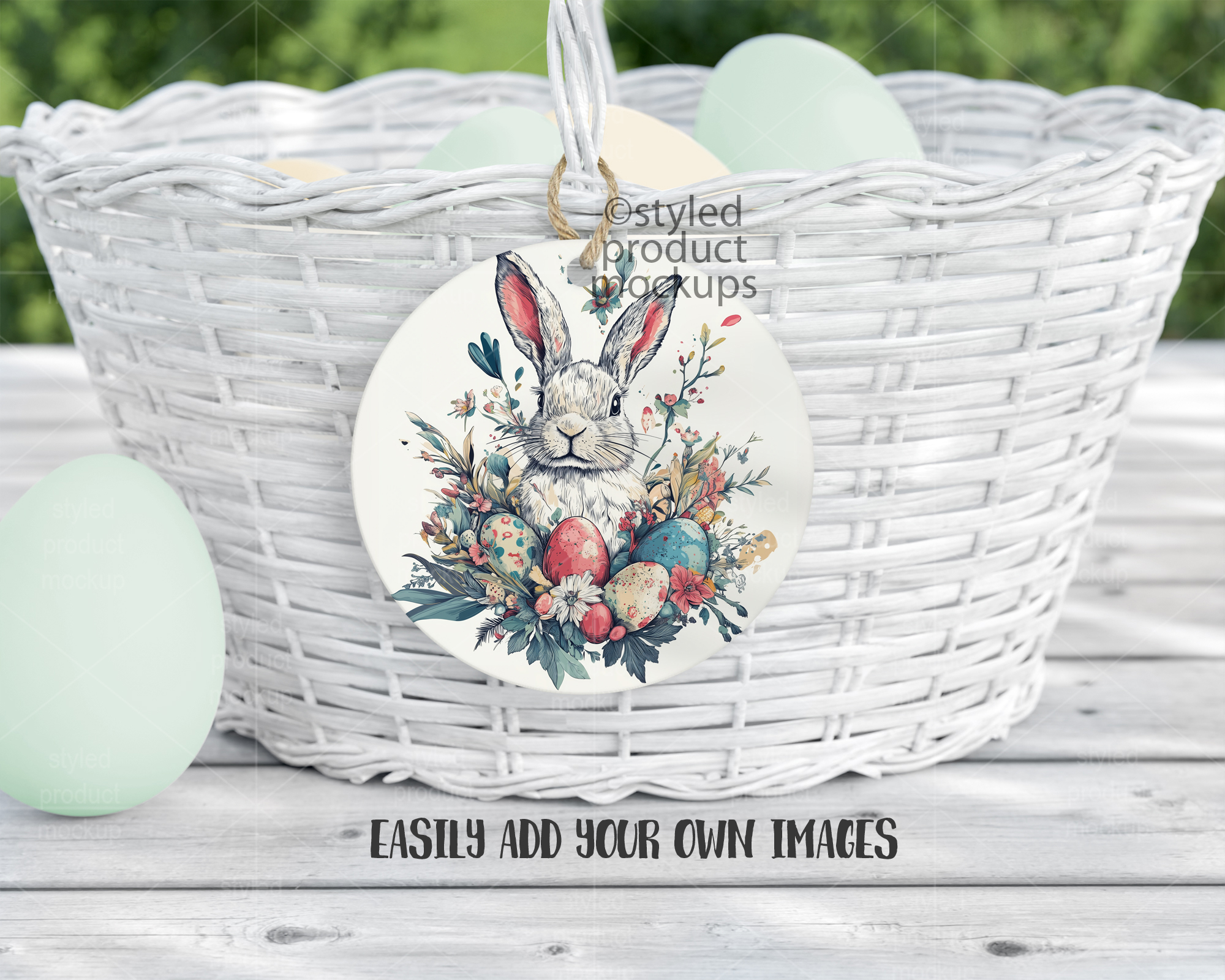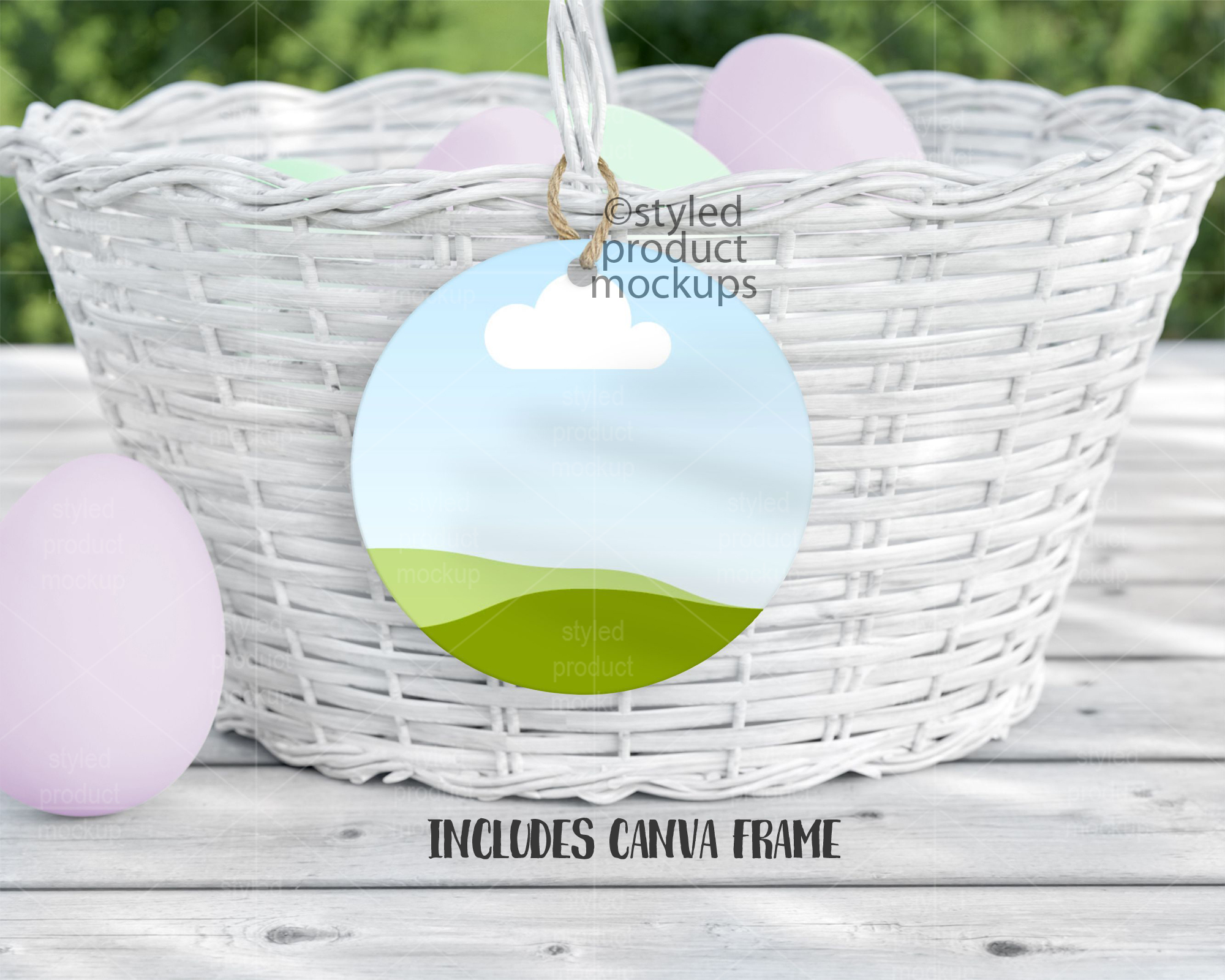 Dye sublimation round tag on Easter basket Mockup | Add your own image and background