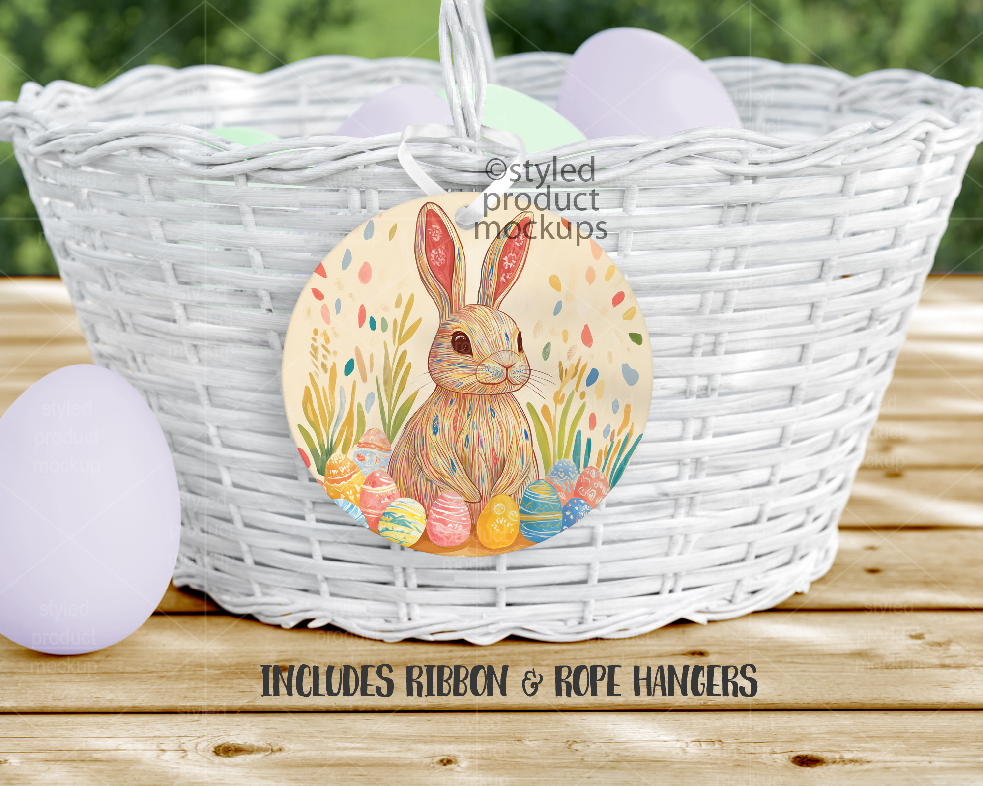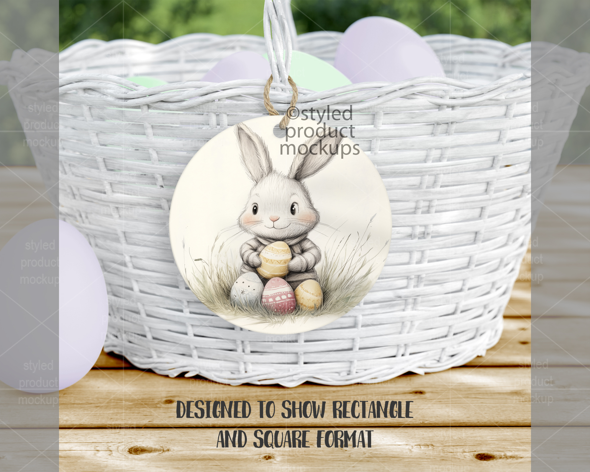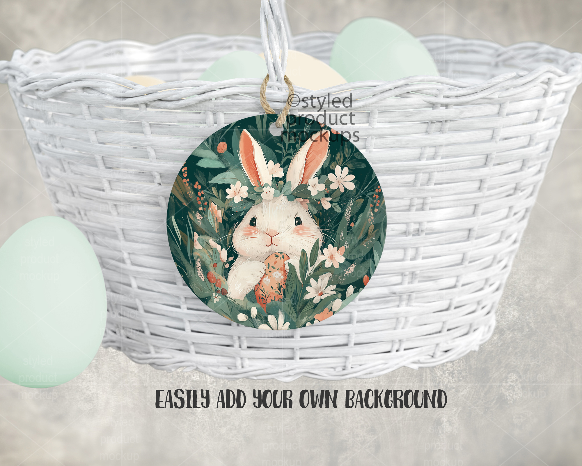Dye sublimation round tag on Easter basket Mockup | Add your own image and background