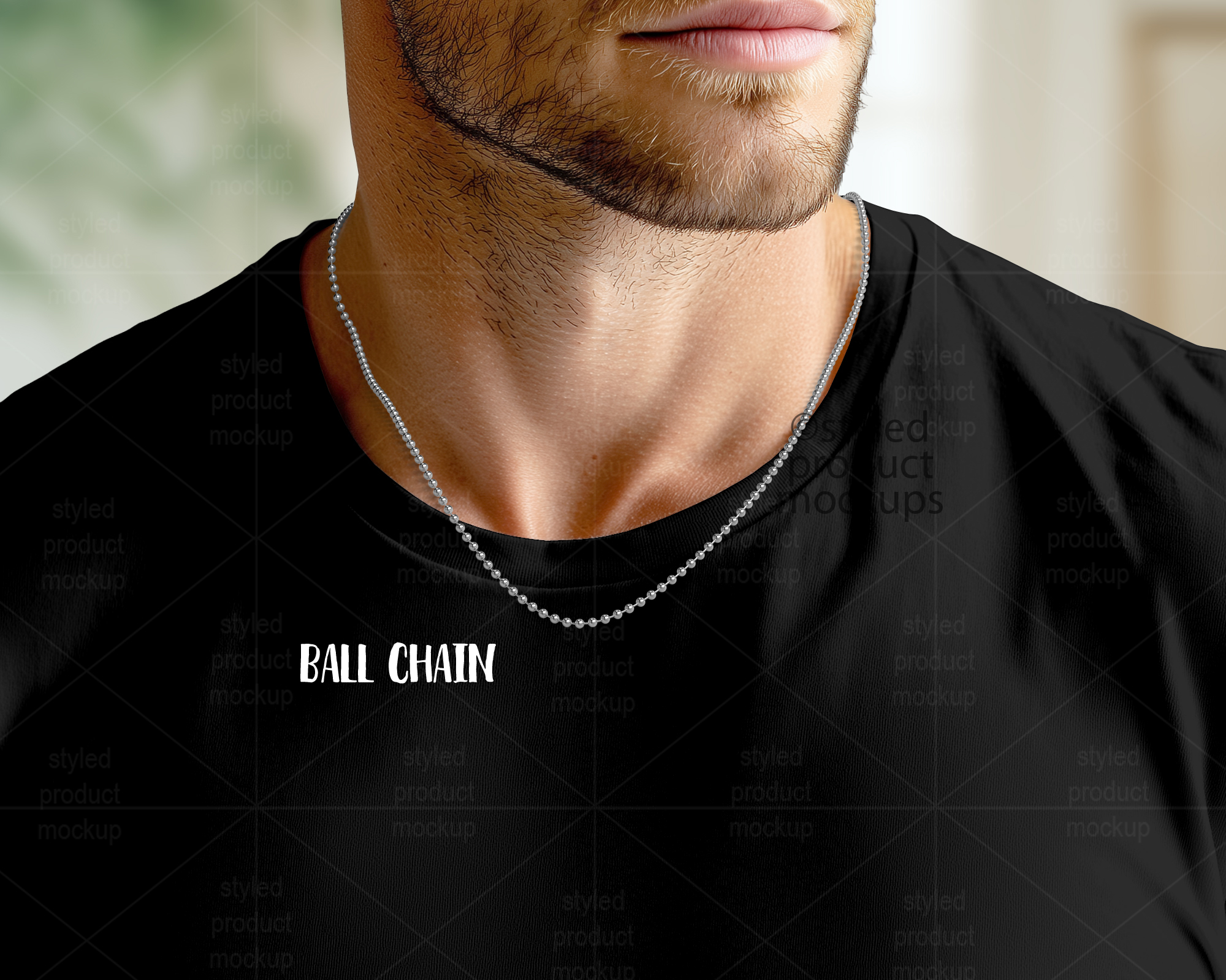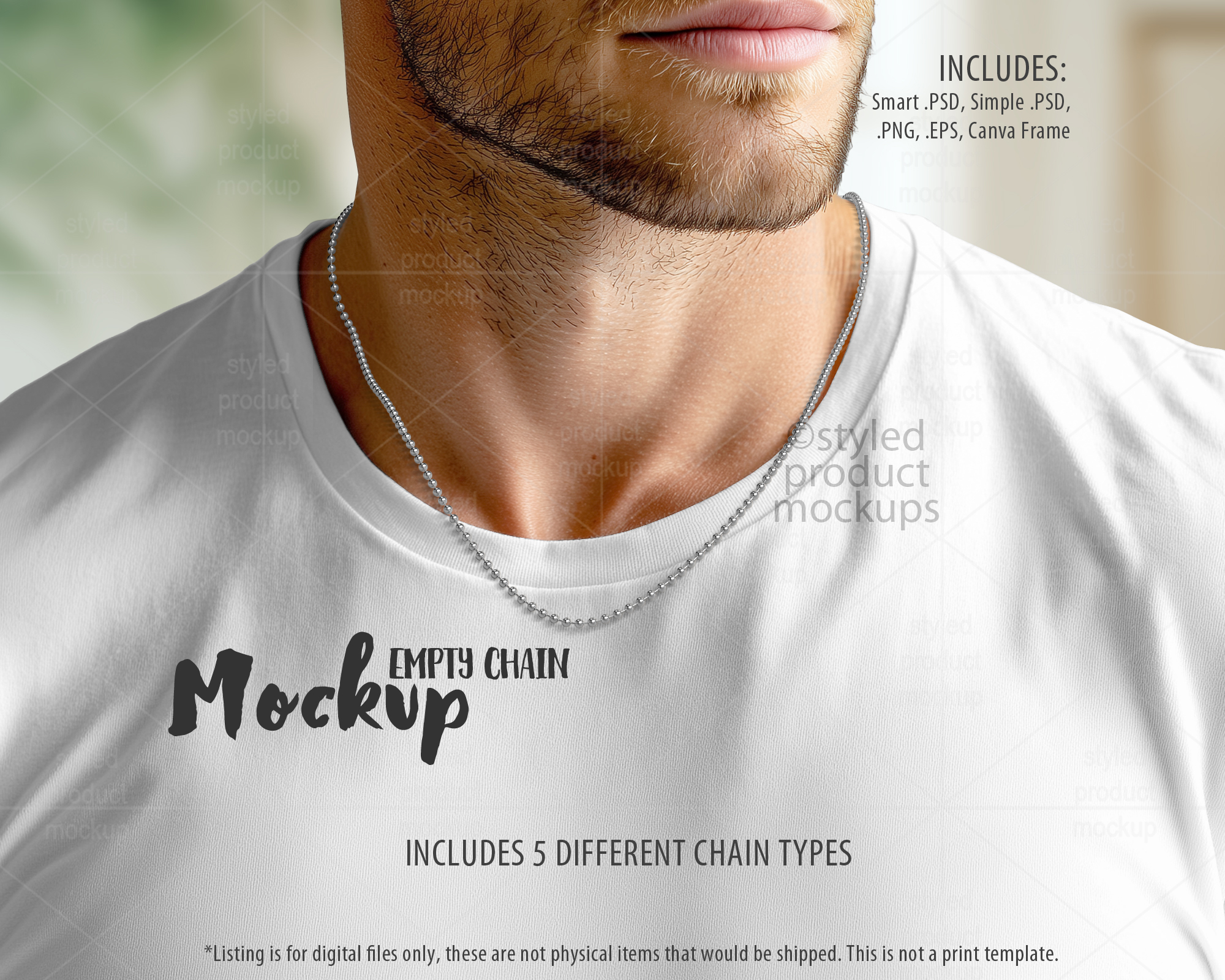 This listing is a mock-up that features a male model with empty chains around his neck. Includes ball chain, cuban chain, rolo chain, rope, and snake chain. Give a professional touch to your necklace designs without the hassle of photographing each one. This styled product mockups template is ready to use, simply add in your own art files and background.