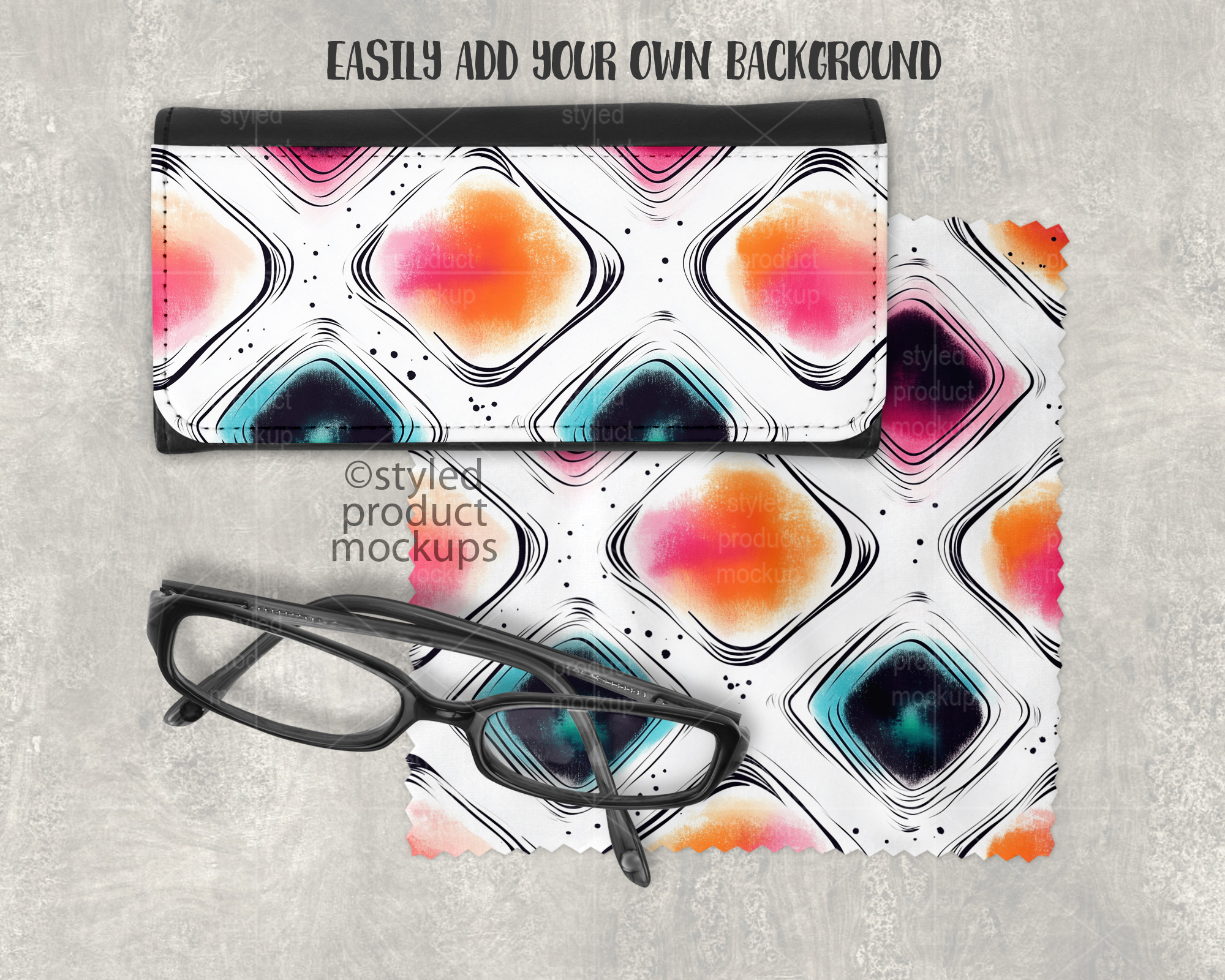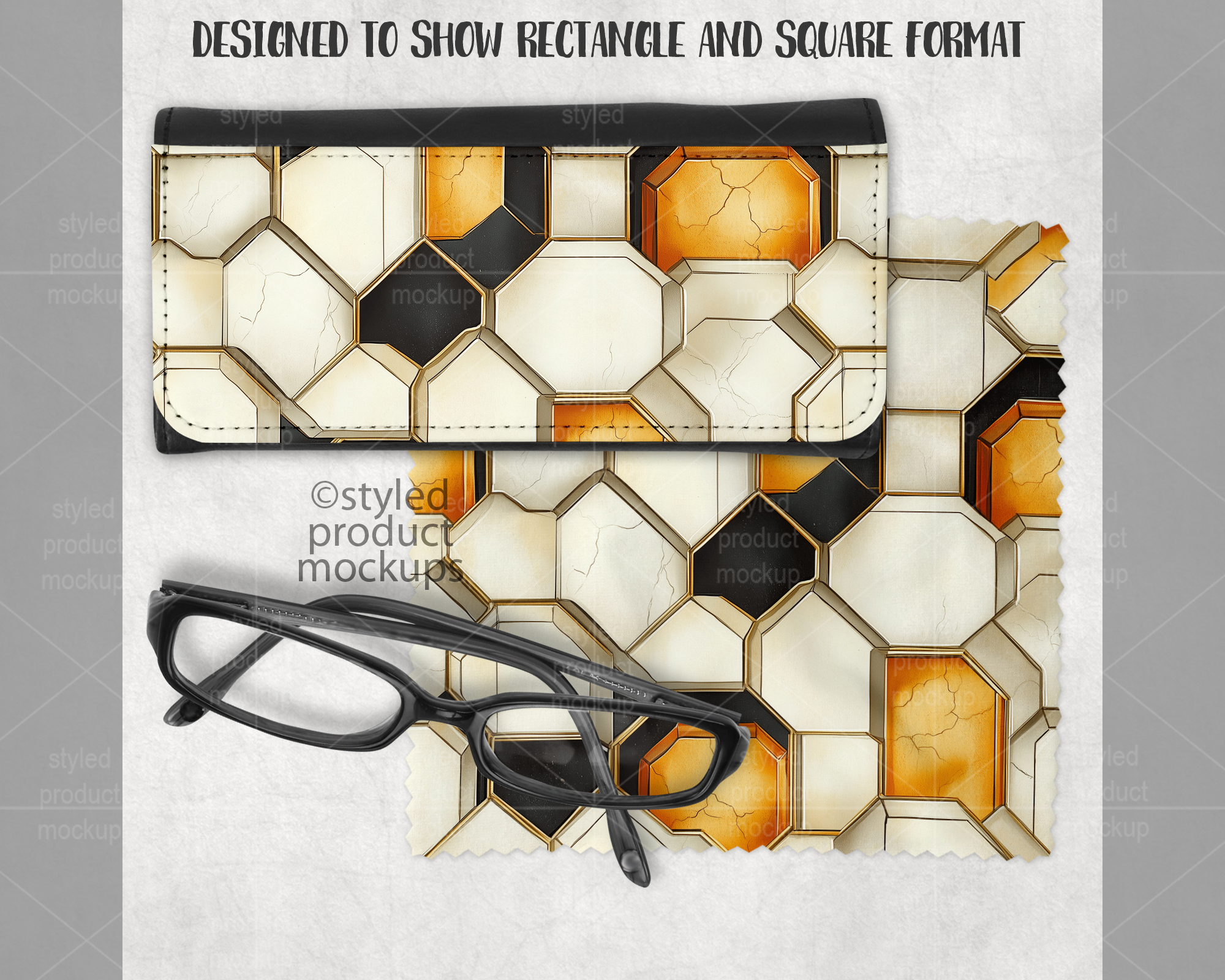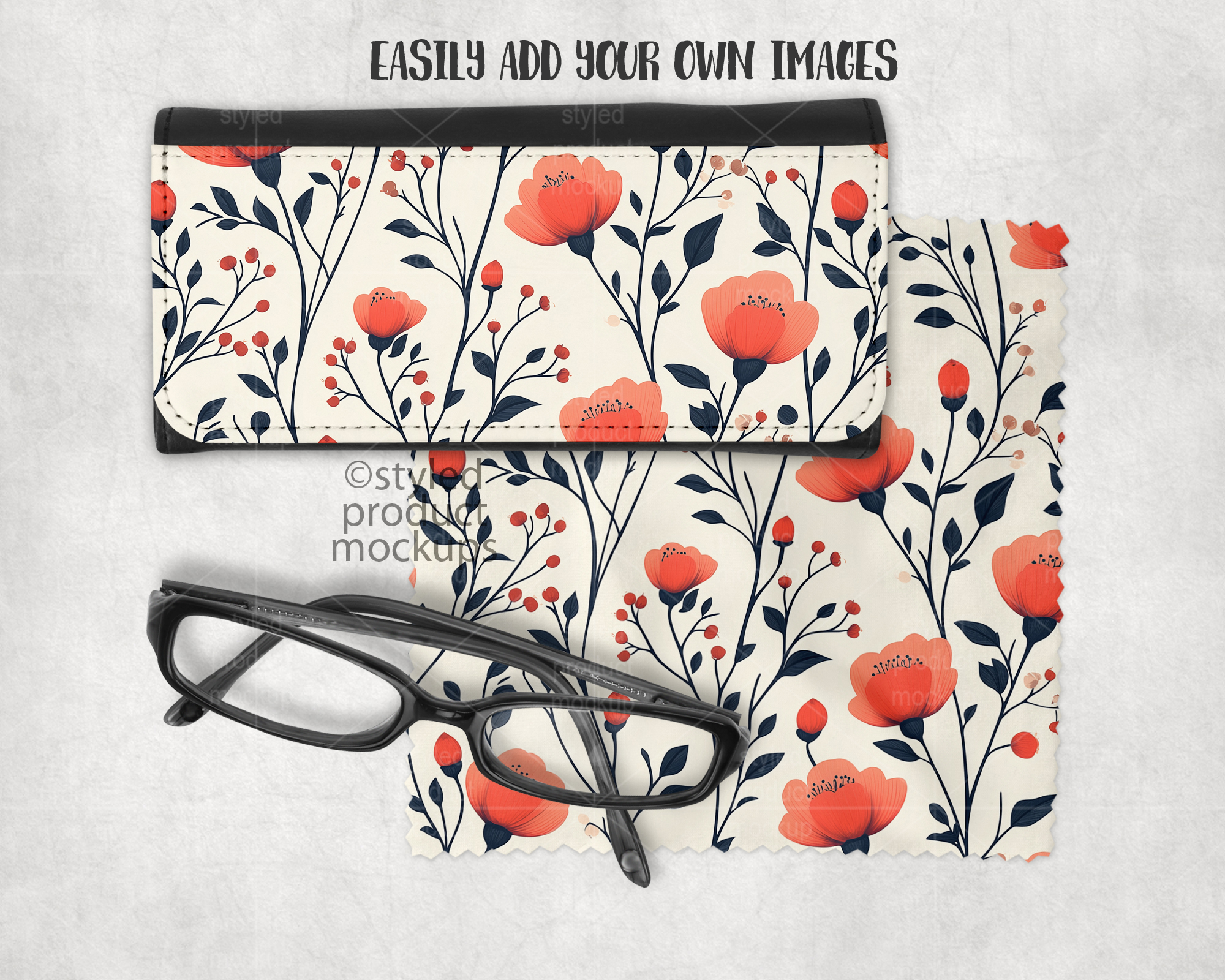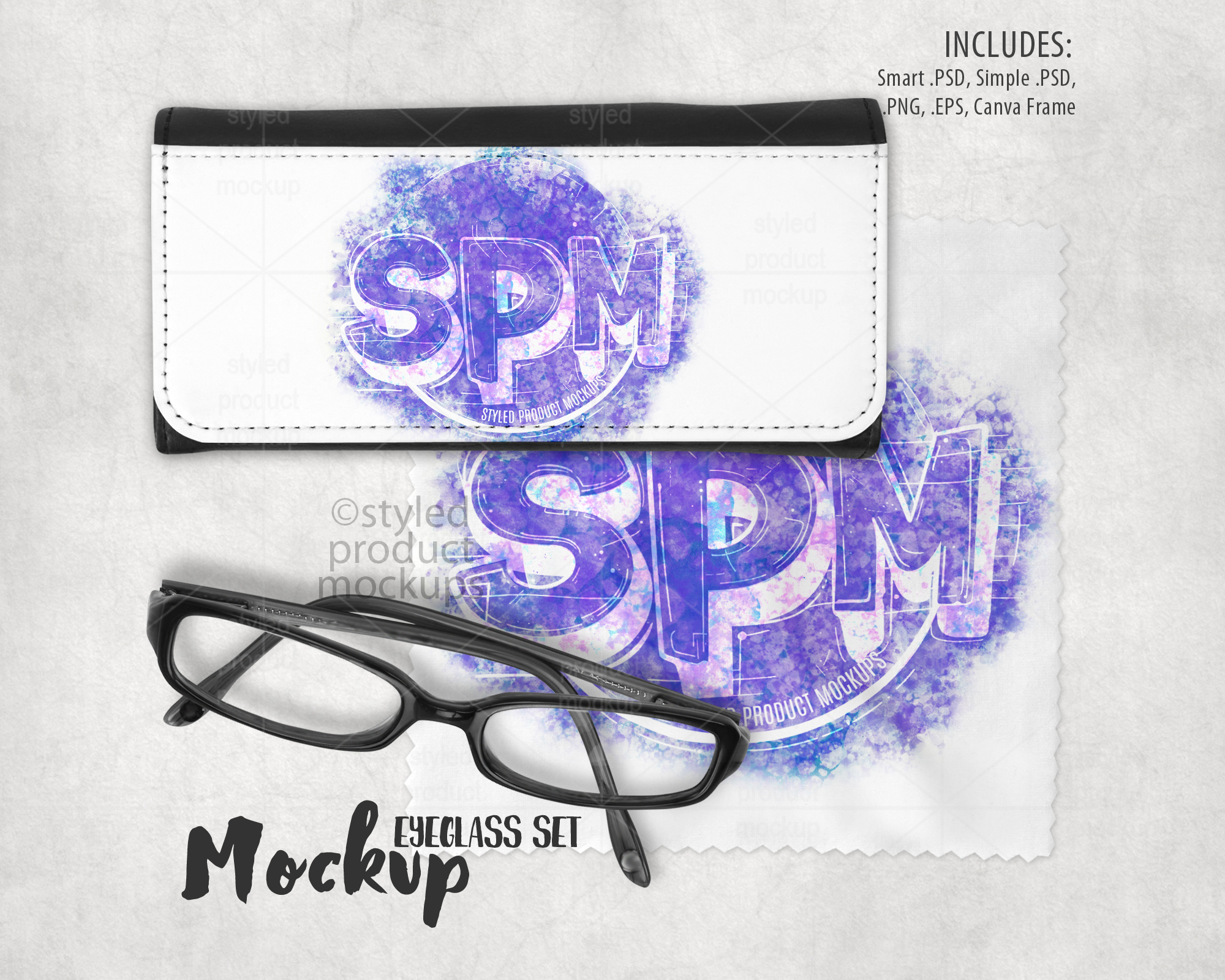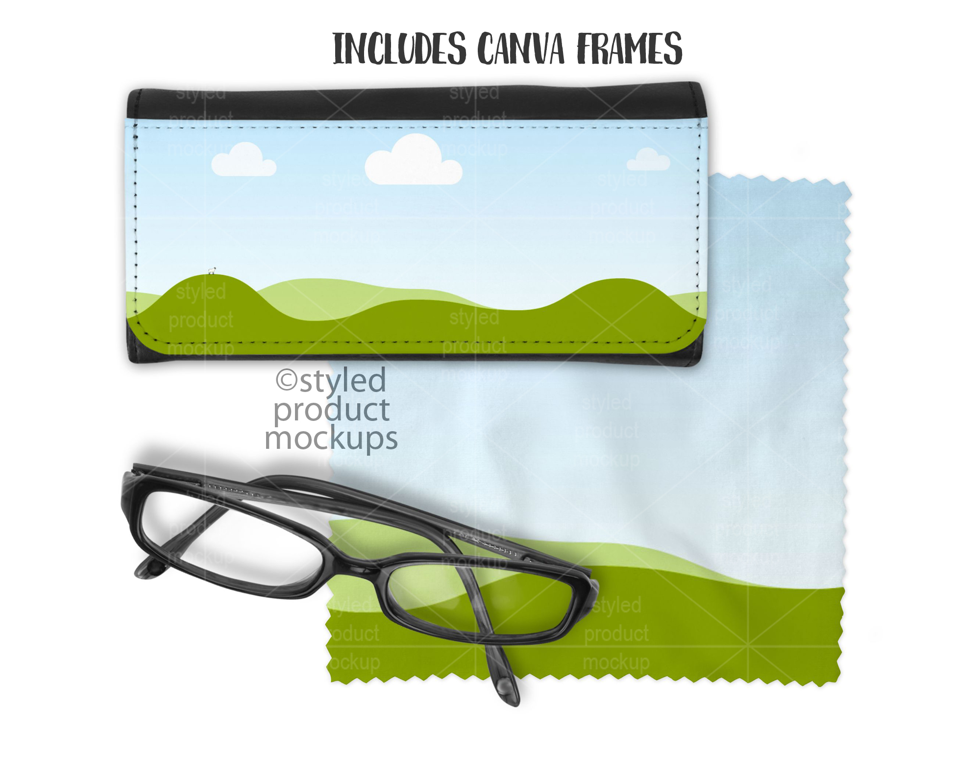 This listing is a gift set mock-up that features a PU leather eyeglass case and square lens cloth. Give a professional touch to your eyeglass gift set designs without the hassle of photographing each one. This styled product mockups template is ready to use, simply add in your own art files and background.
