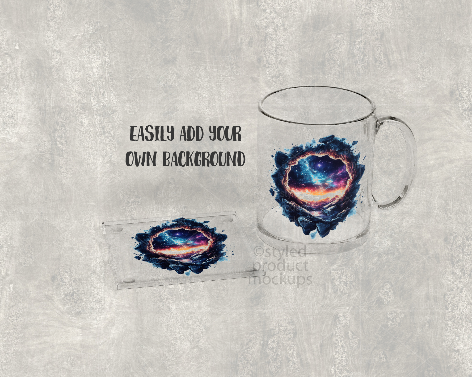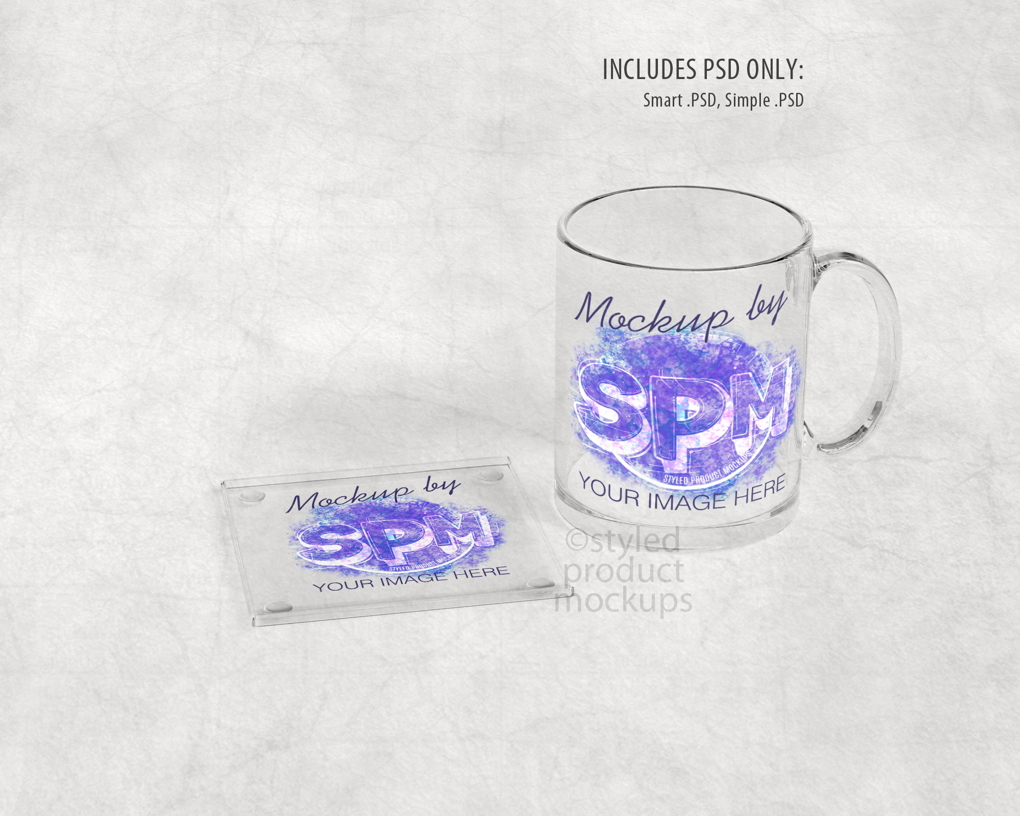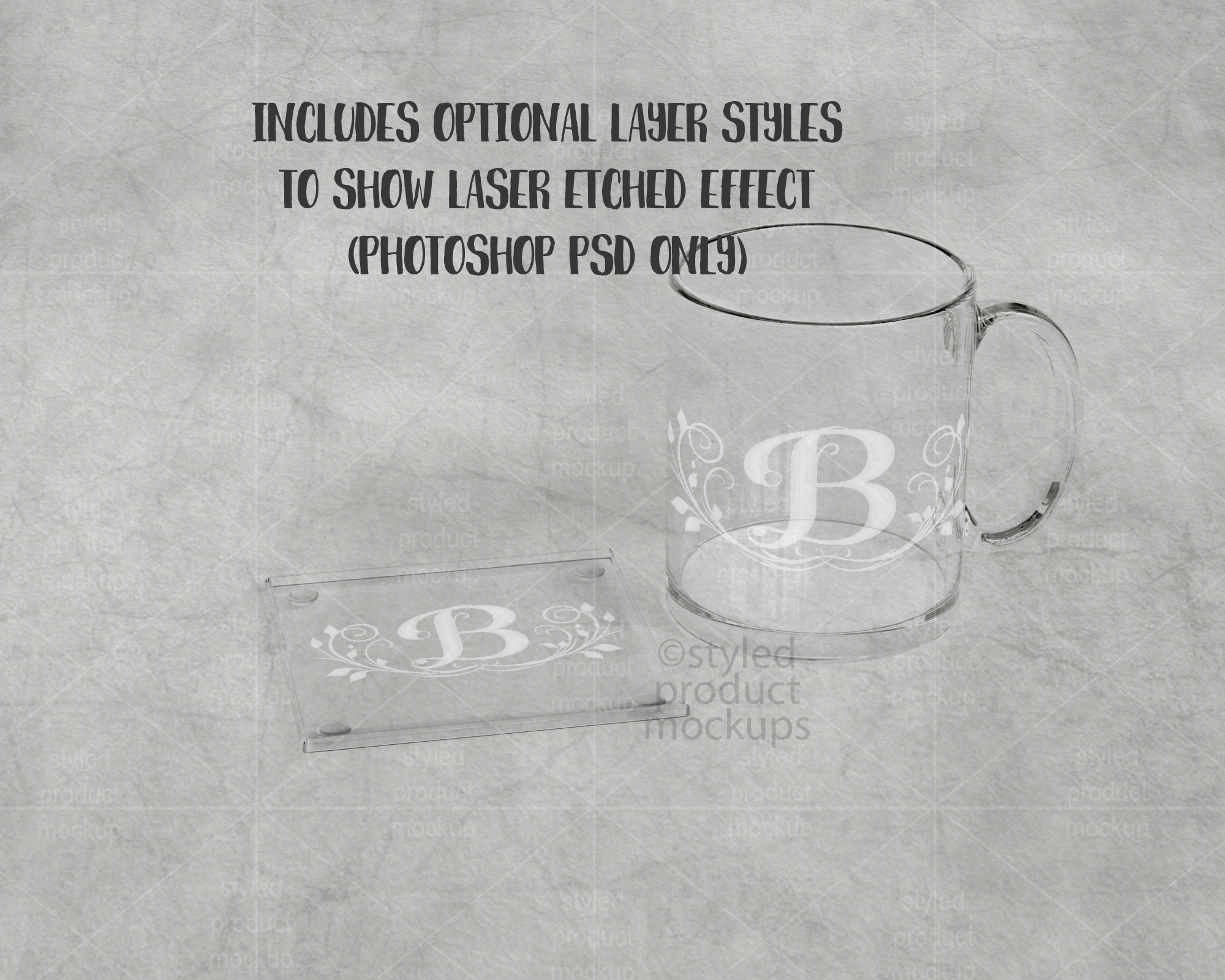 This listing features a glass coaster and mug set mockup. Includes layers to show a sublimation or vinyl print as well as a laser engraved effect.