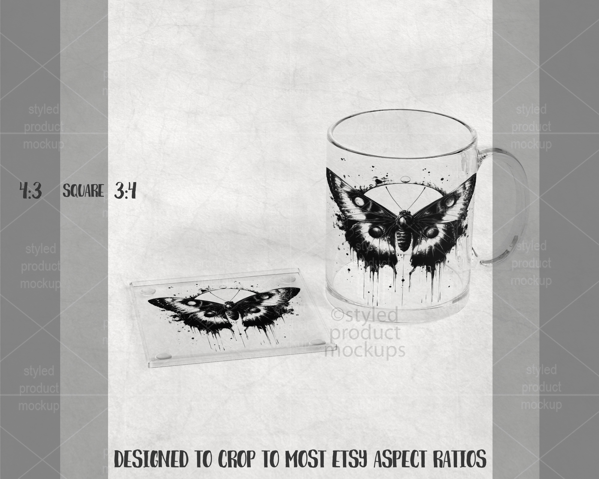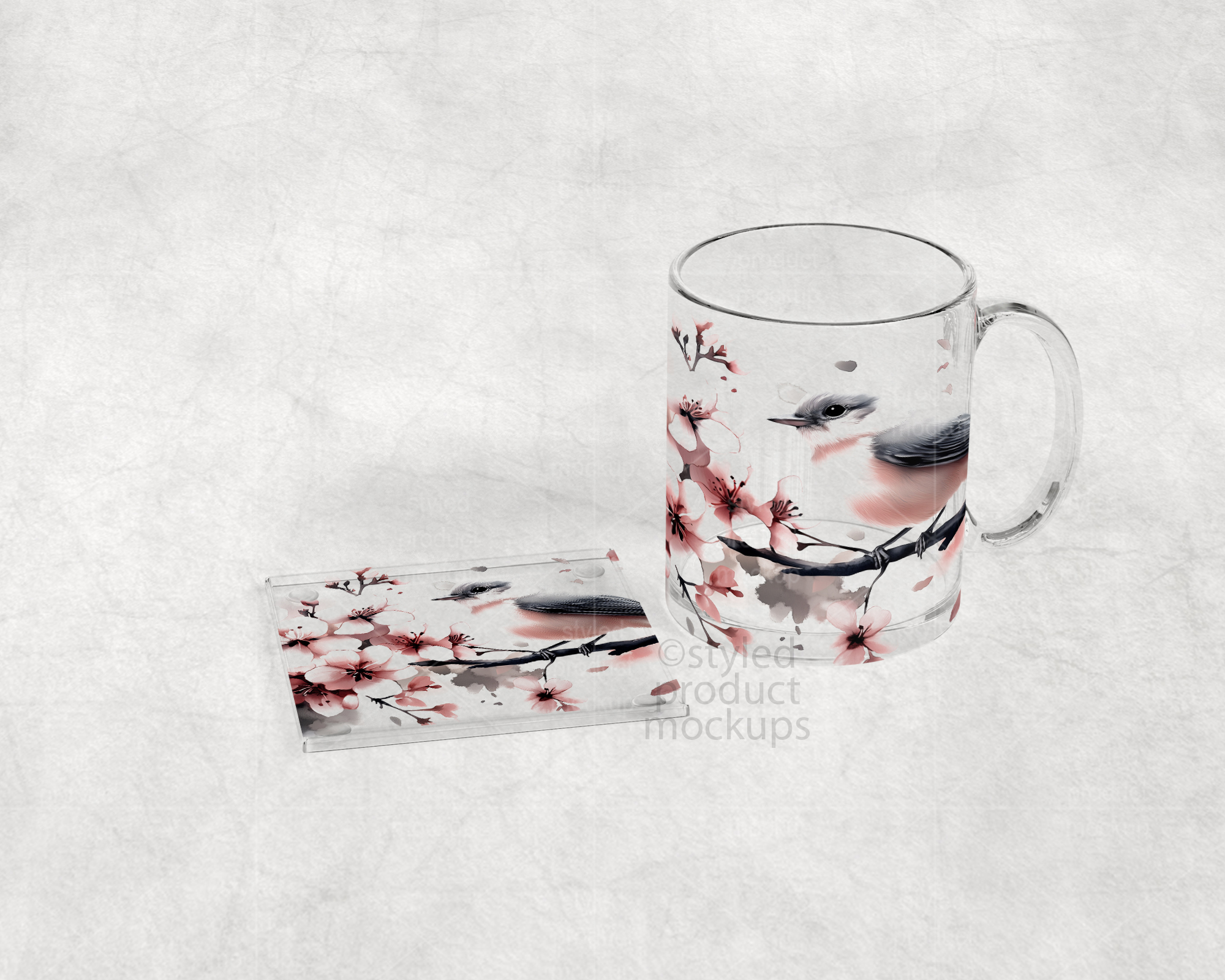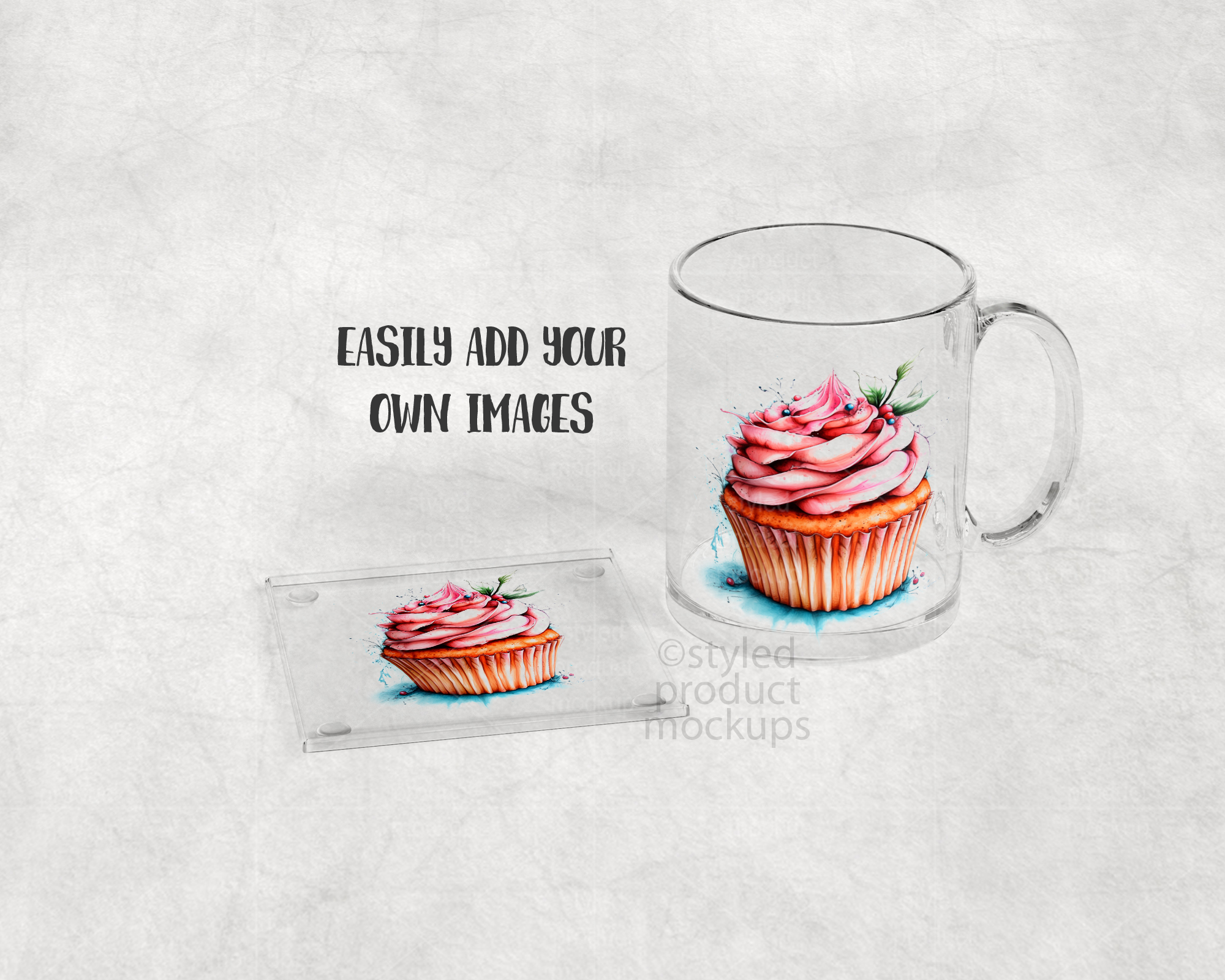 This listing features a glass coaster and mug set mockup. Includes layers to show a sublimation or vinyl print as well as a laser engraved effect.