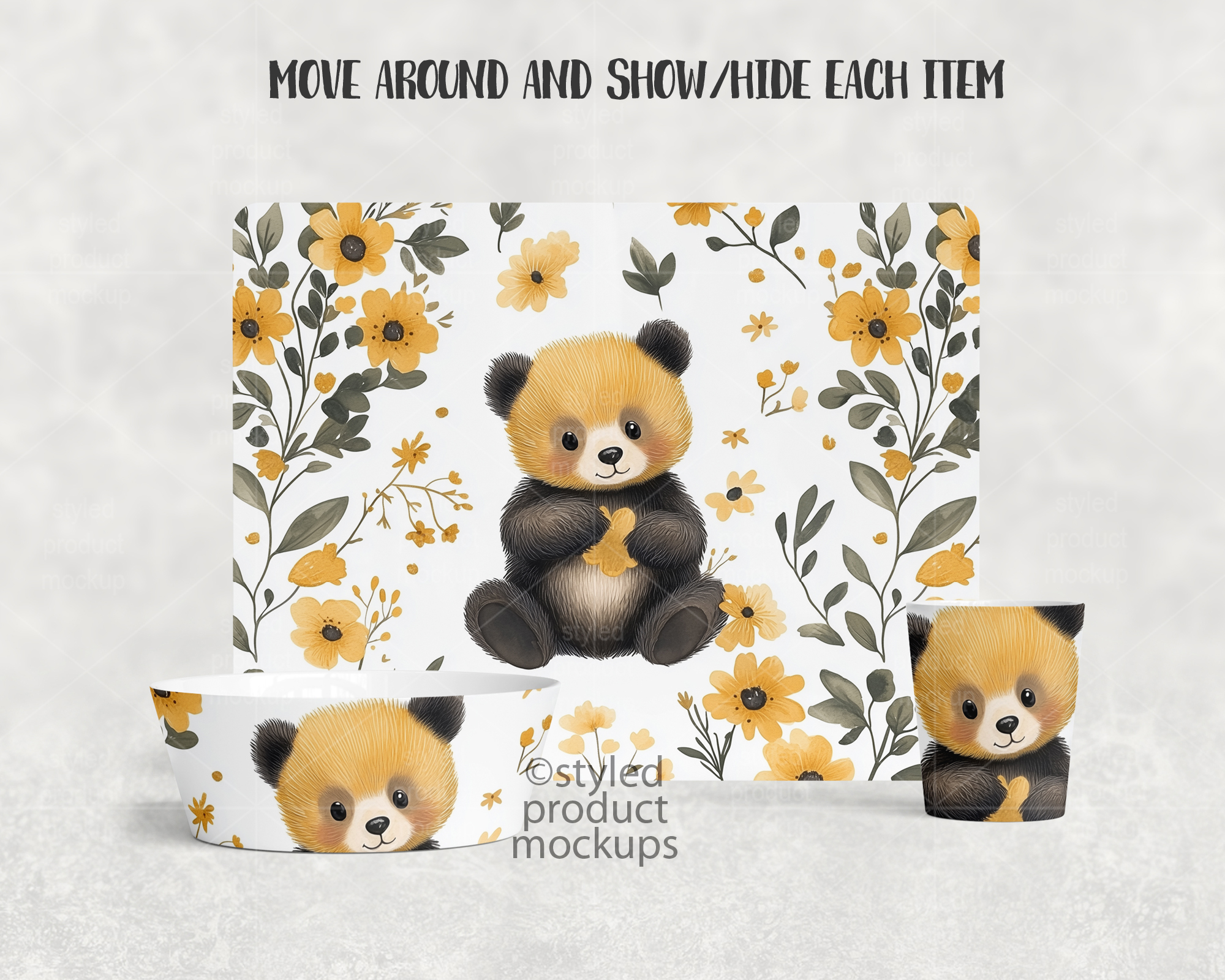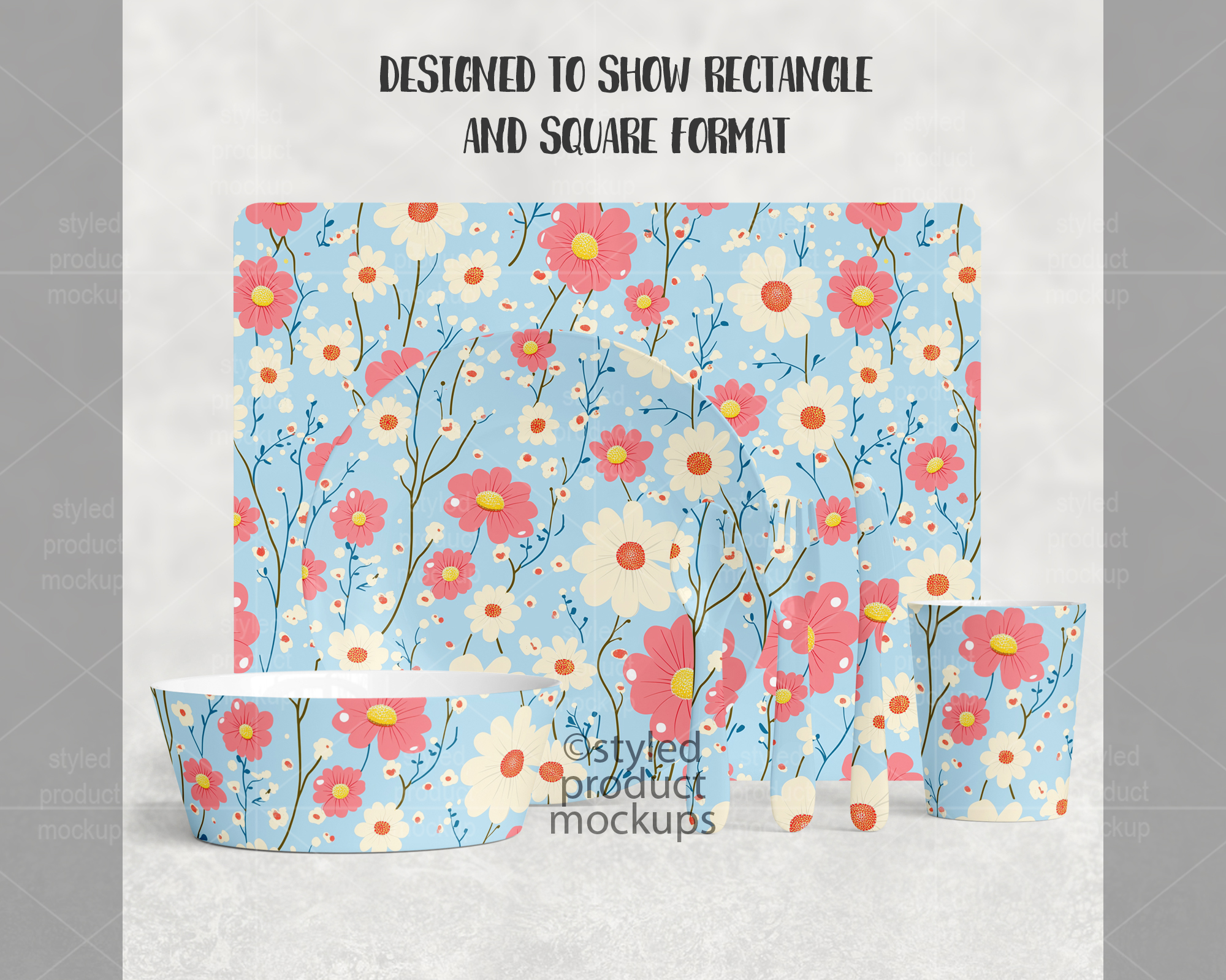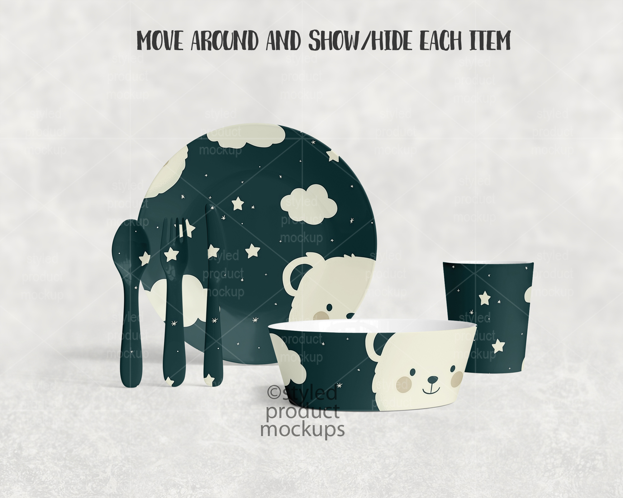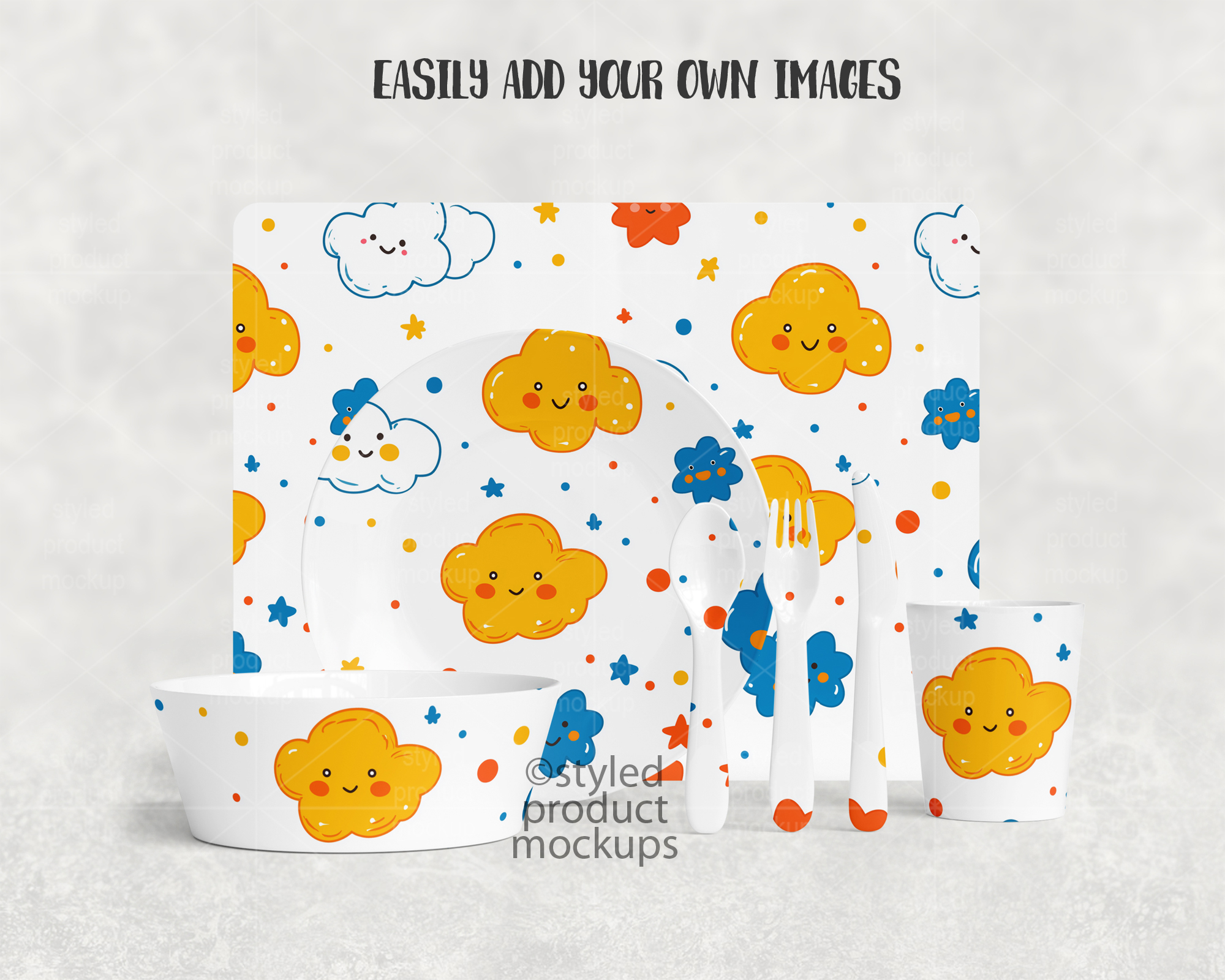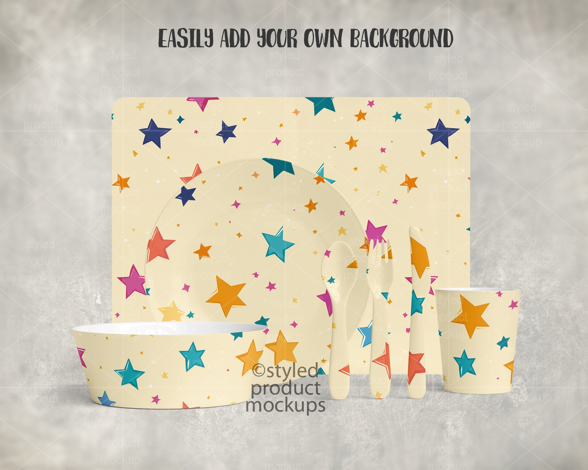 This listing is a mock-up that features a dye sublimation kids polymer tableware gift set. Includes placemat, plate, bowl, cup, fork, knife and spoon. 5 files in one at half off. Give a professional touch to your gift set designs without the hassle of photographing each one. This styled product mockups template is ready to use, simply add in your own art files and background.