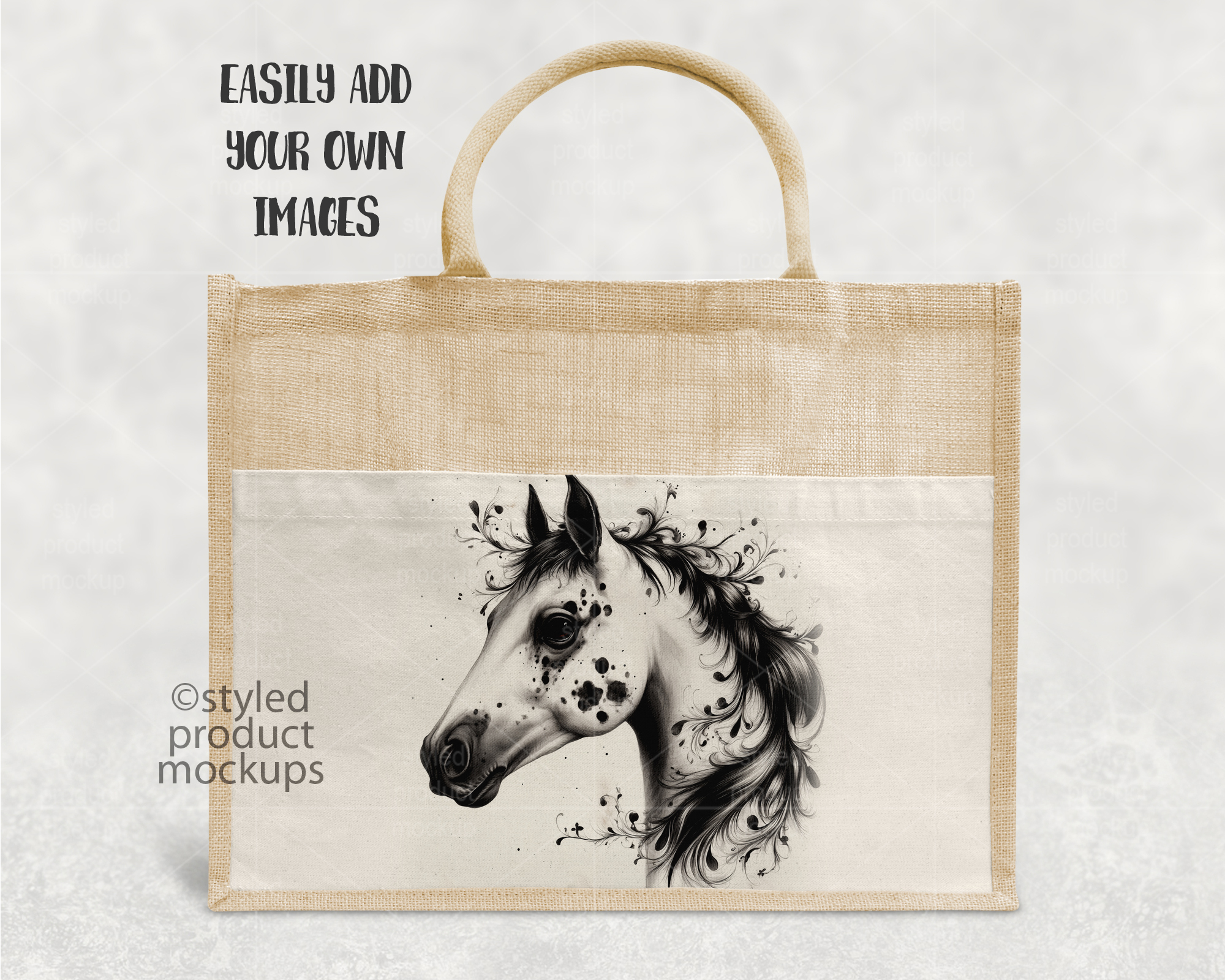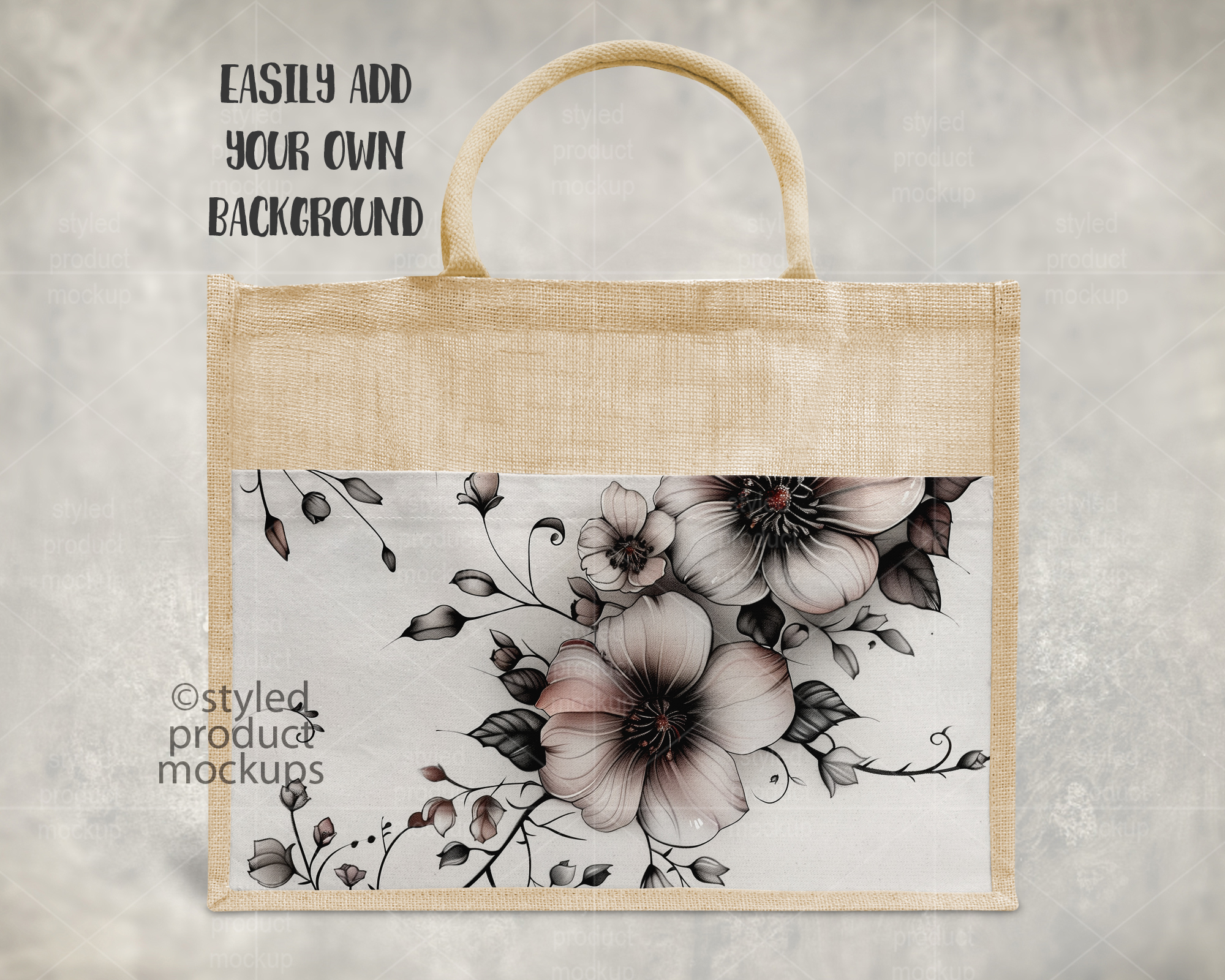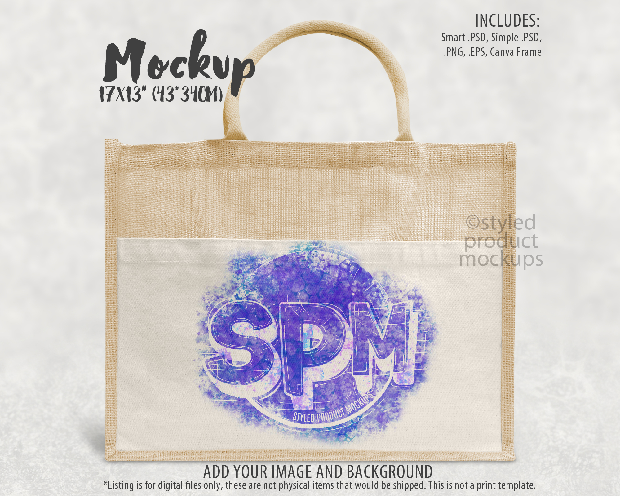 This listing is a mock-up that features a dye sublimation large jute linen tote bag measuring 17×13” (43*34cm). Give a professional touch to your tote bag designs without the hassle of photographing each one. This styled product mockups template is ready to use, simply add in your own art files and background.