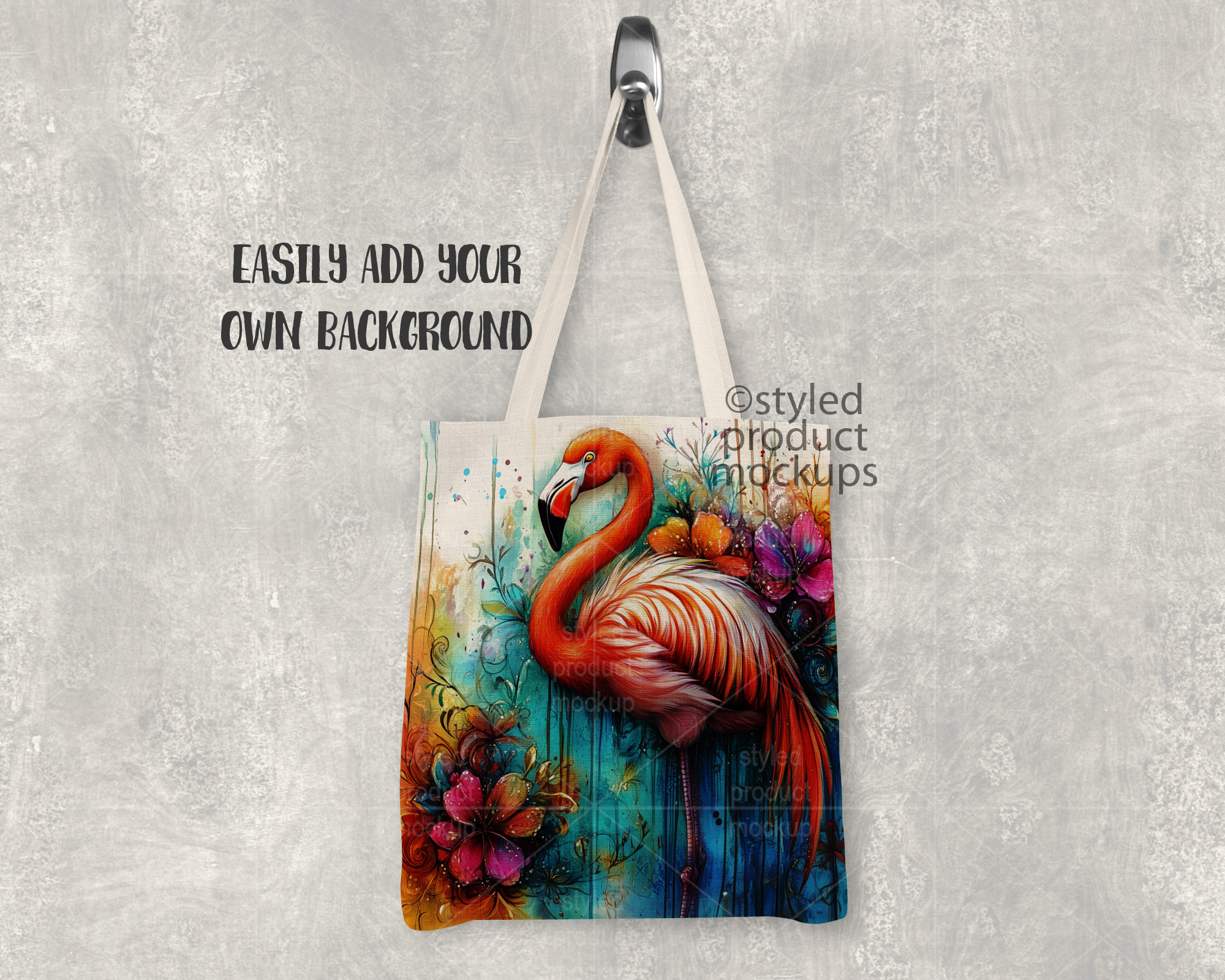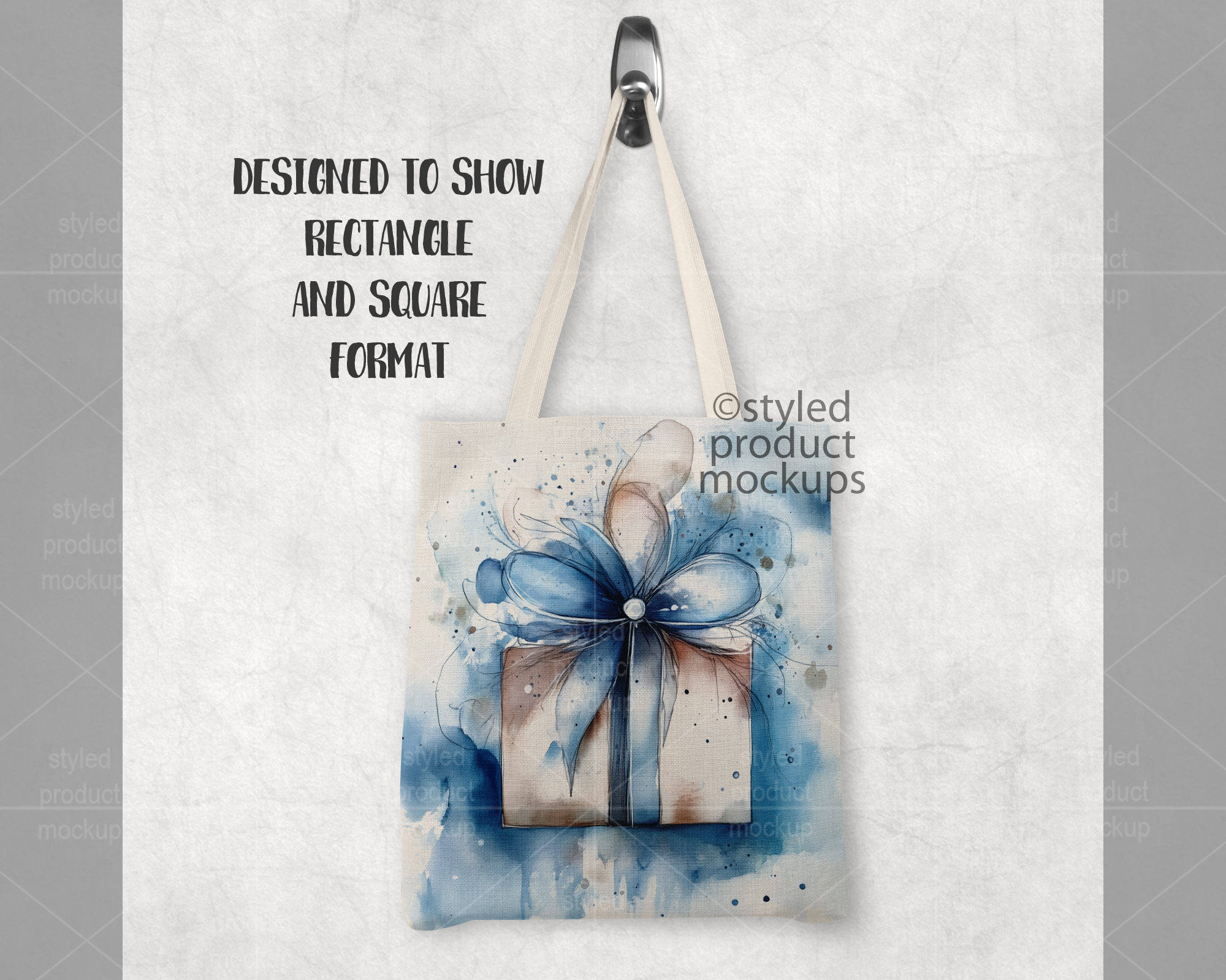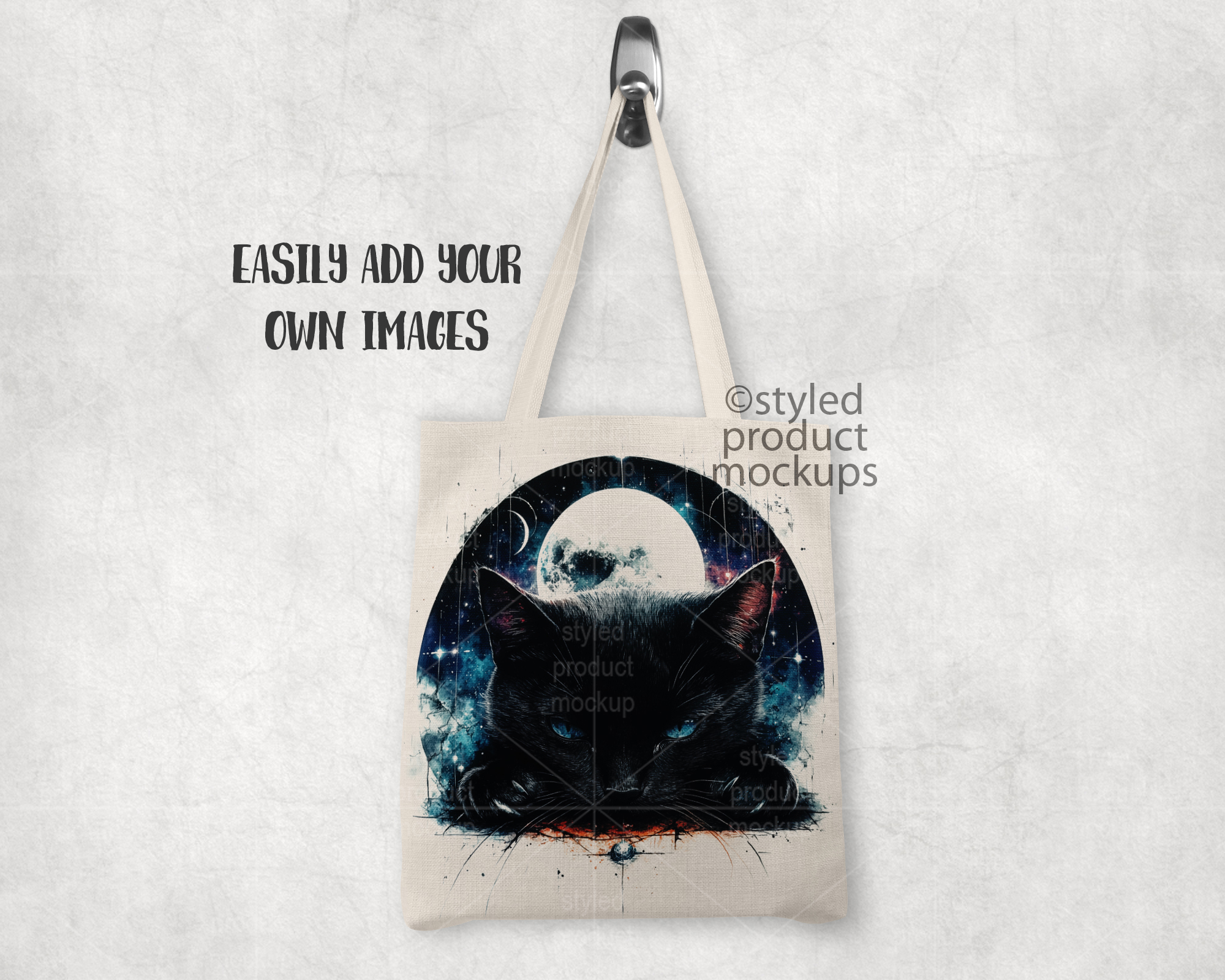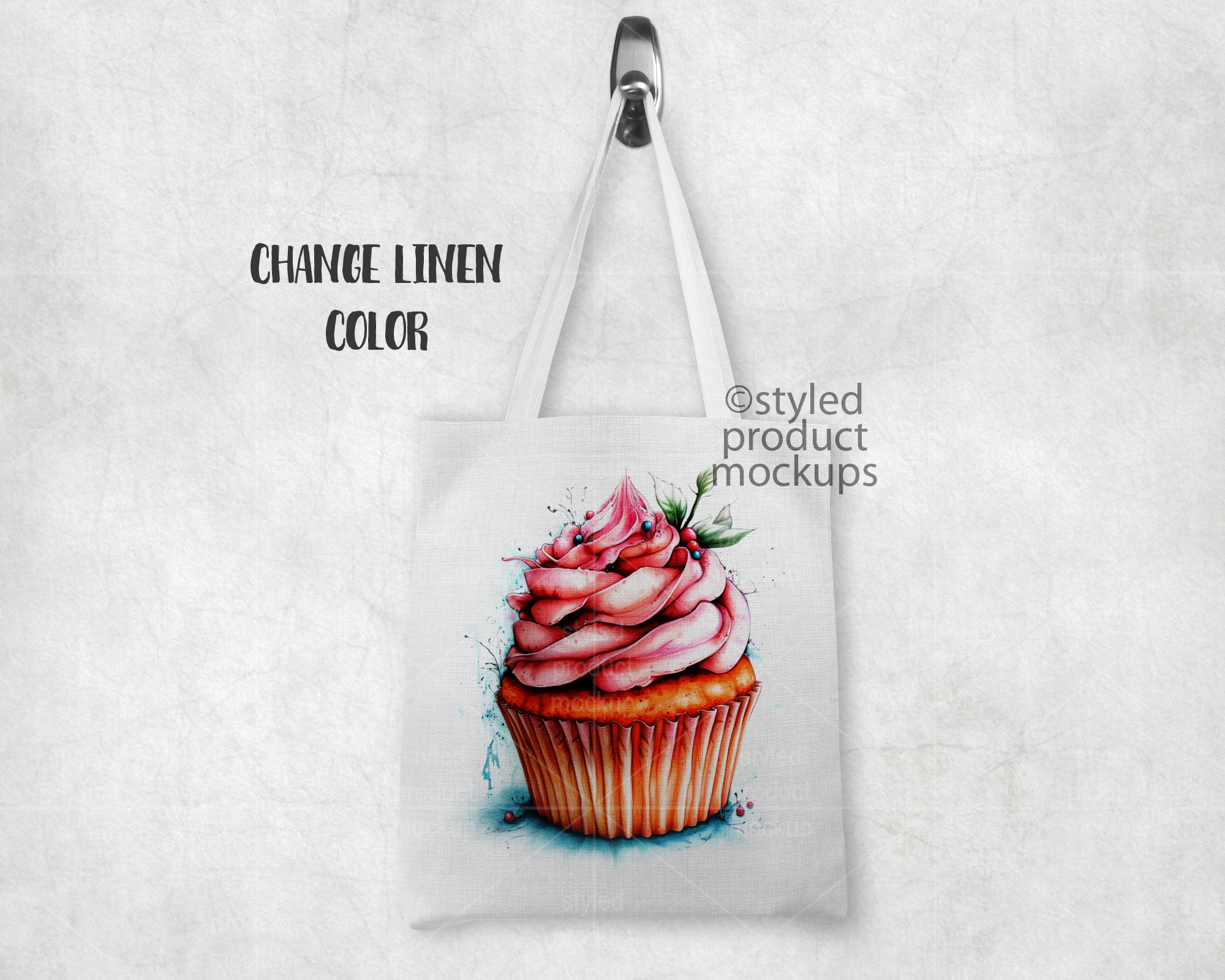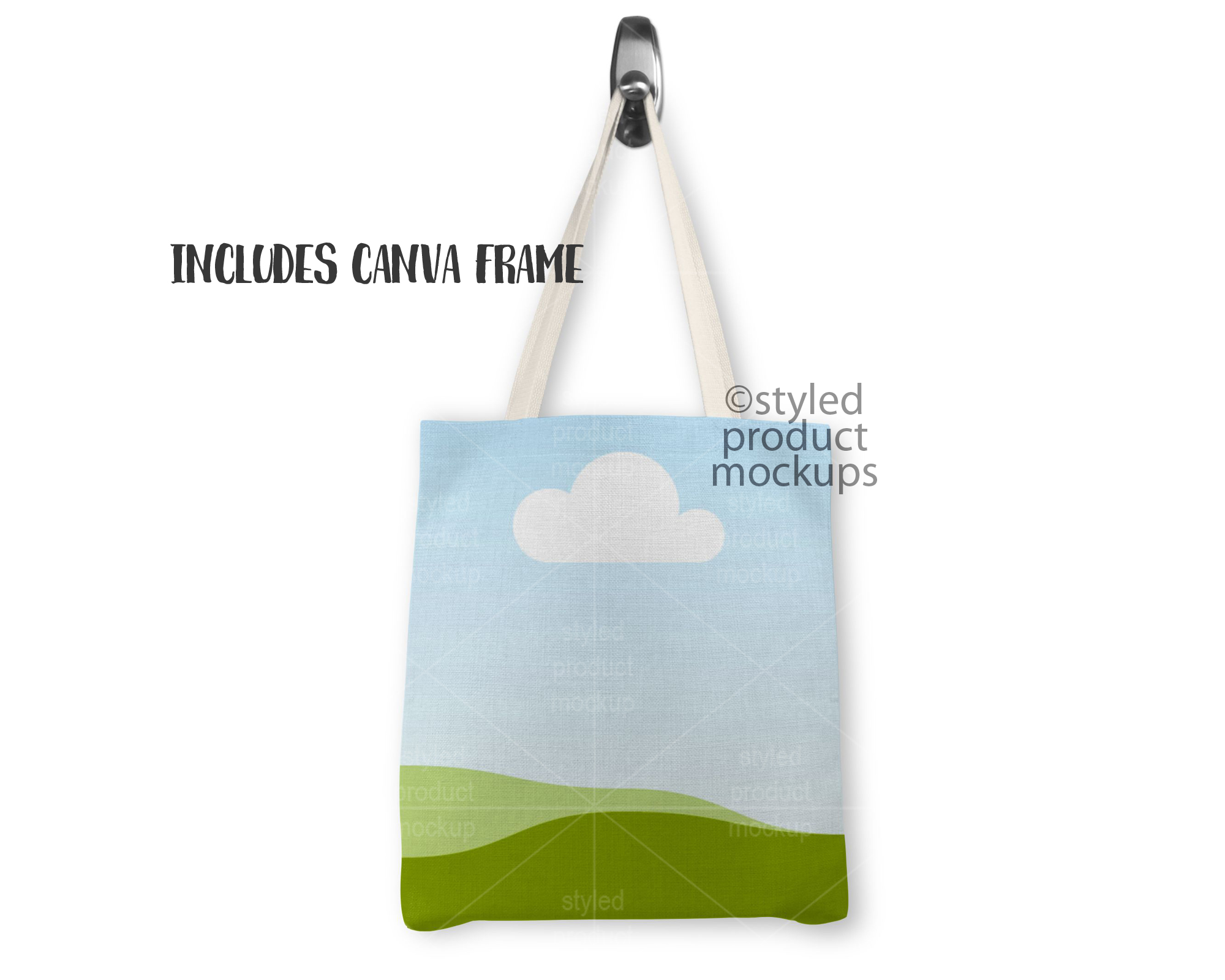 This listing is a mock-up that features a dye sublimation linen tote bag measuring 14.5 x 16 inches shown hanging from a silver knob. Give a professional touch to your linen bag designs without the hassle of photographing each one. Our template is ready to use, simply add in your own art files and background.