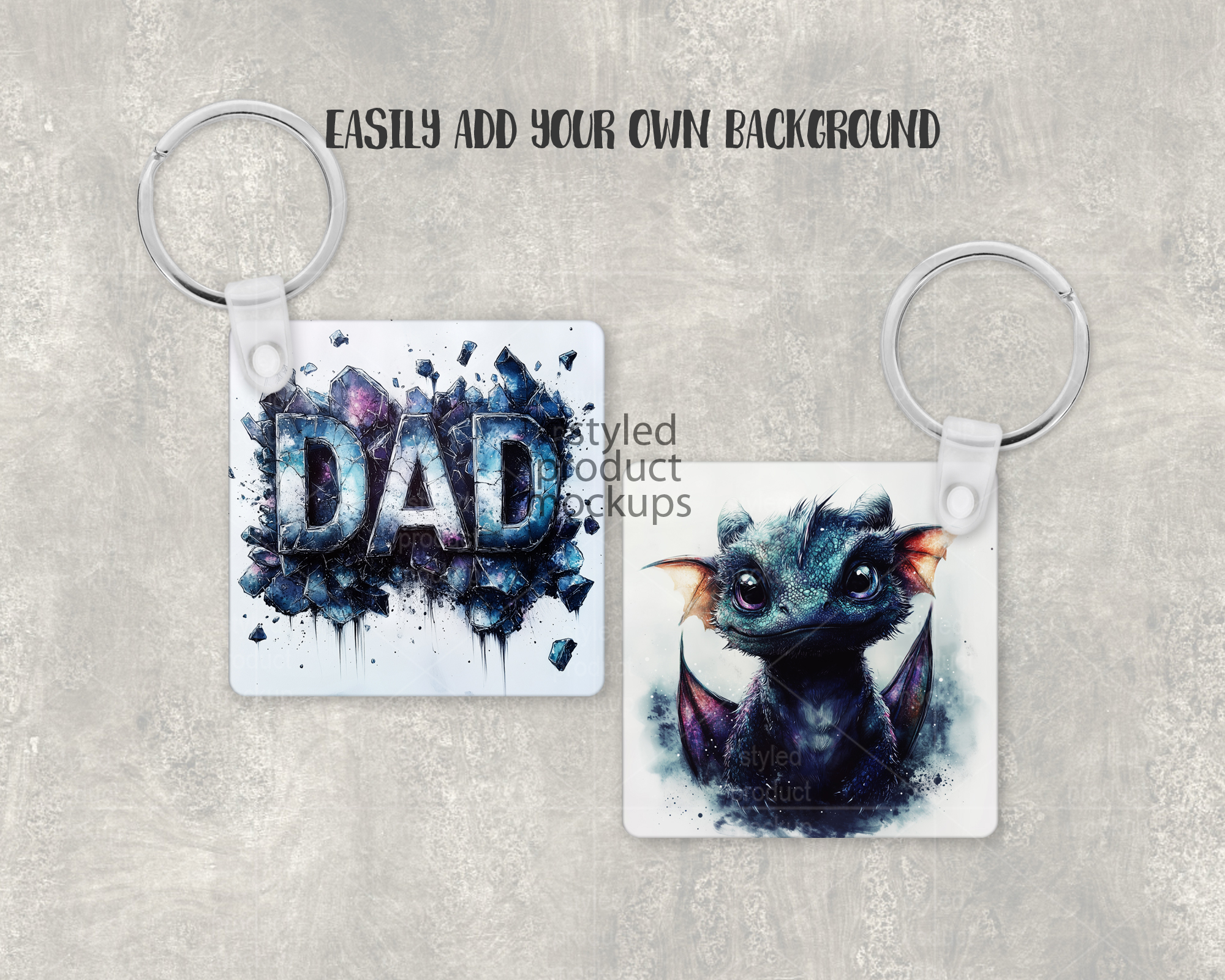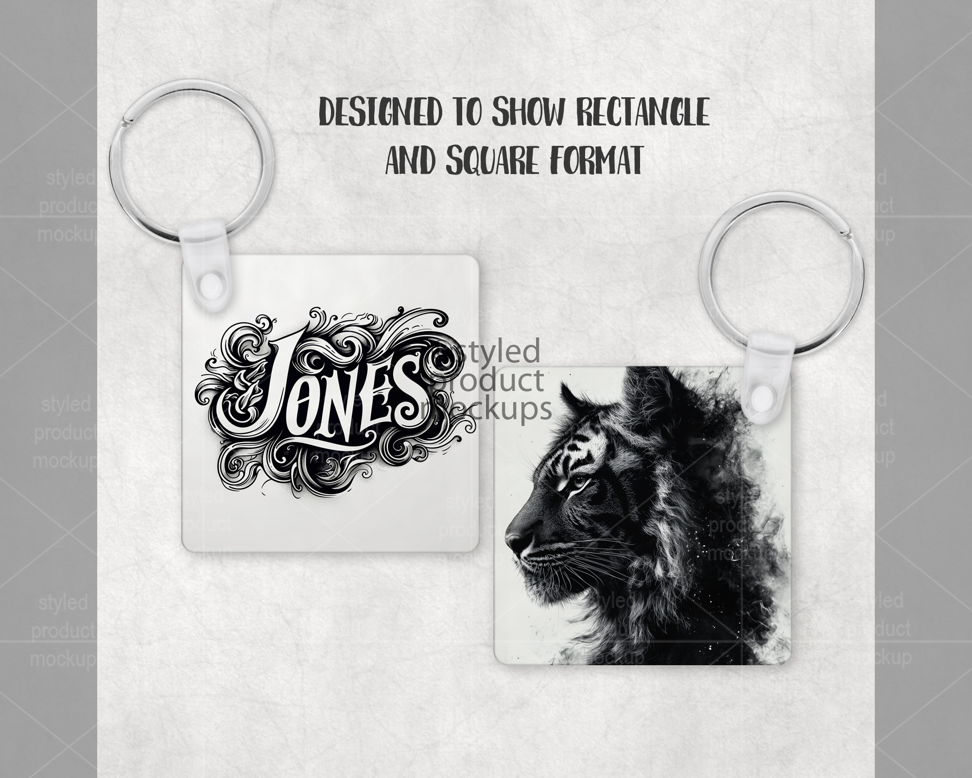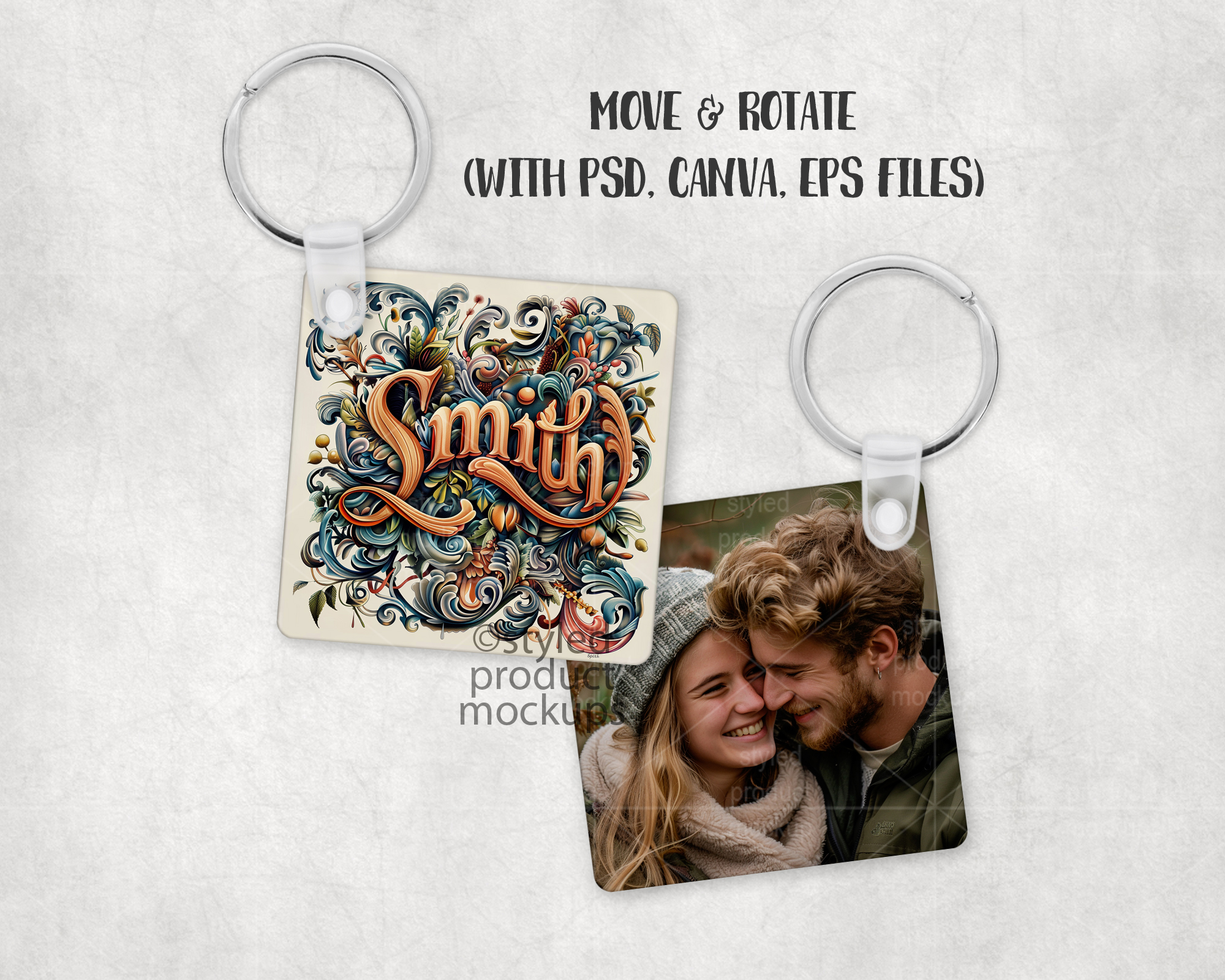This listing is a mock-up that features the front and back of a dye sublimation MDF square keychain with a corner hole. Give a professional touch to your keychain designs without the hassle of photographing each one. This styled product mockups template is ready to use, simply add in your own art files and background.