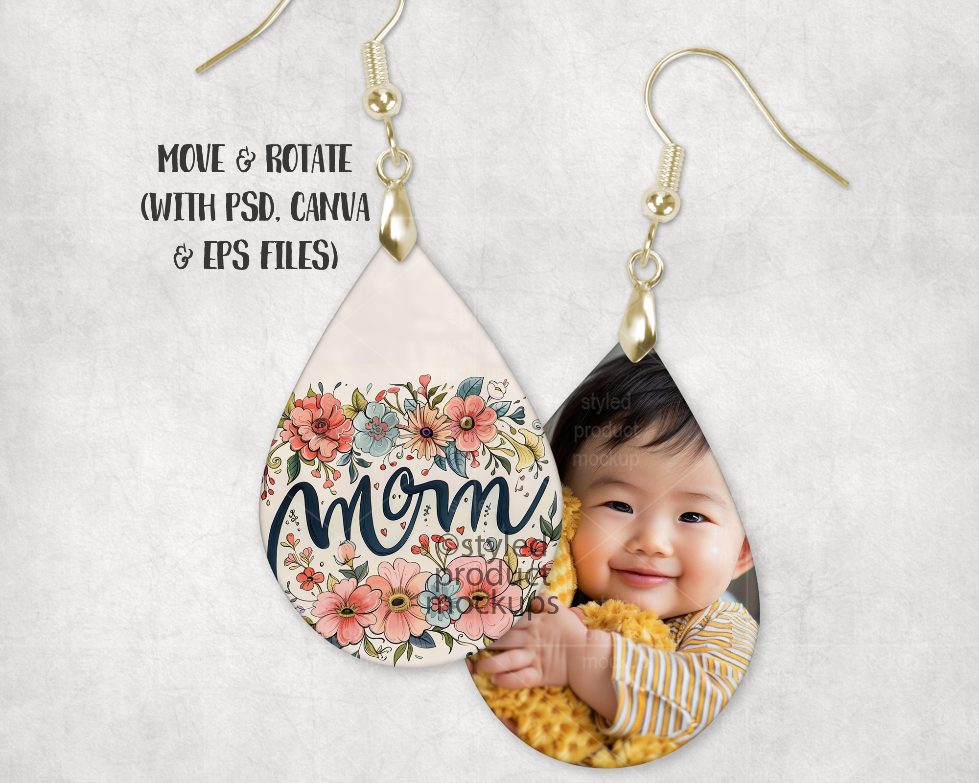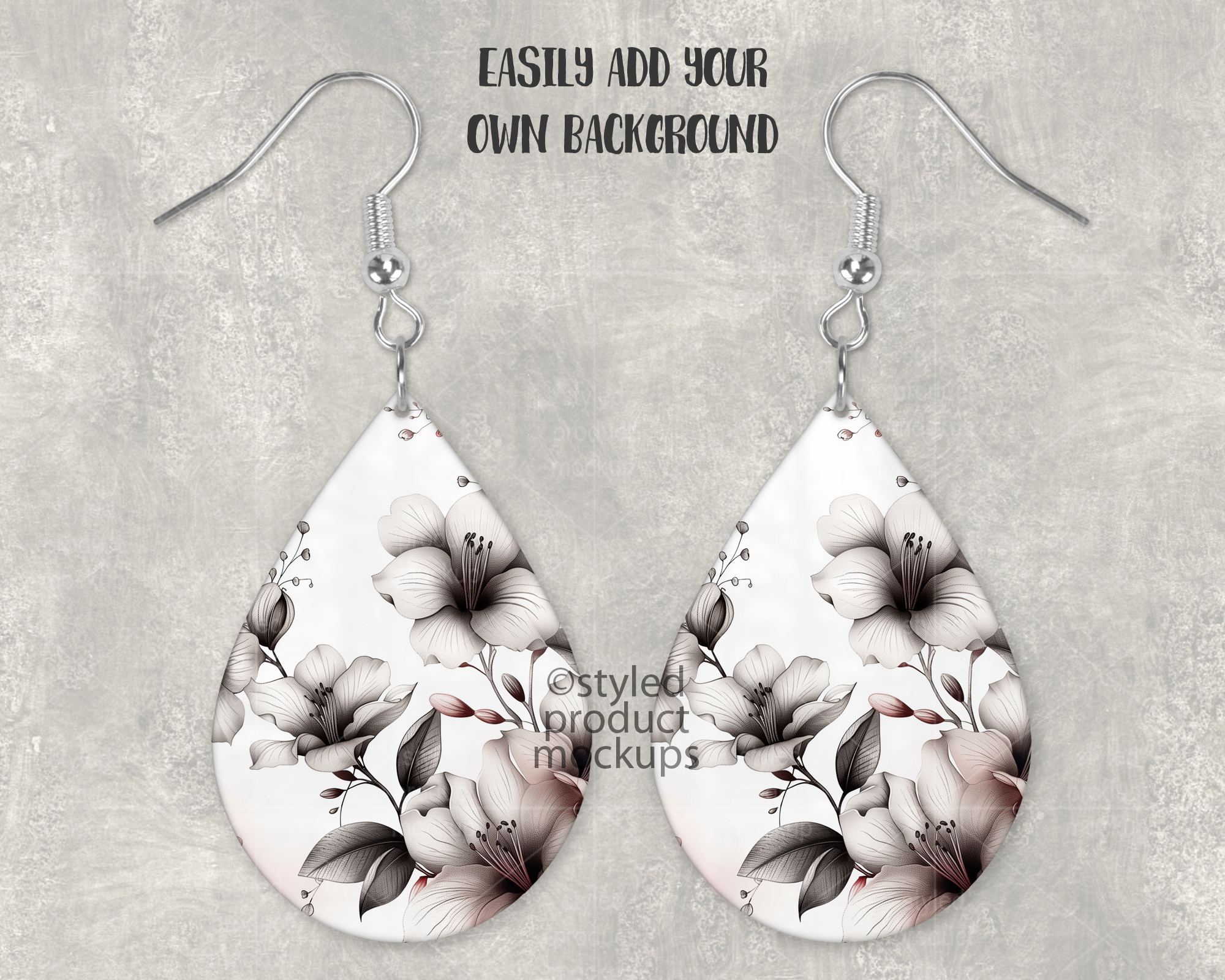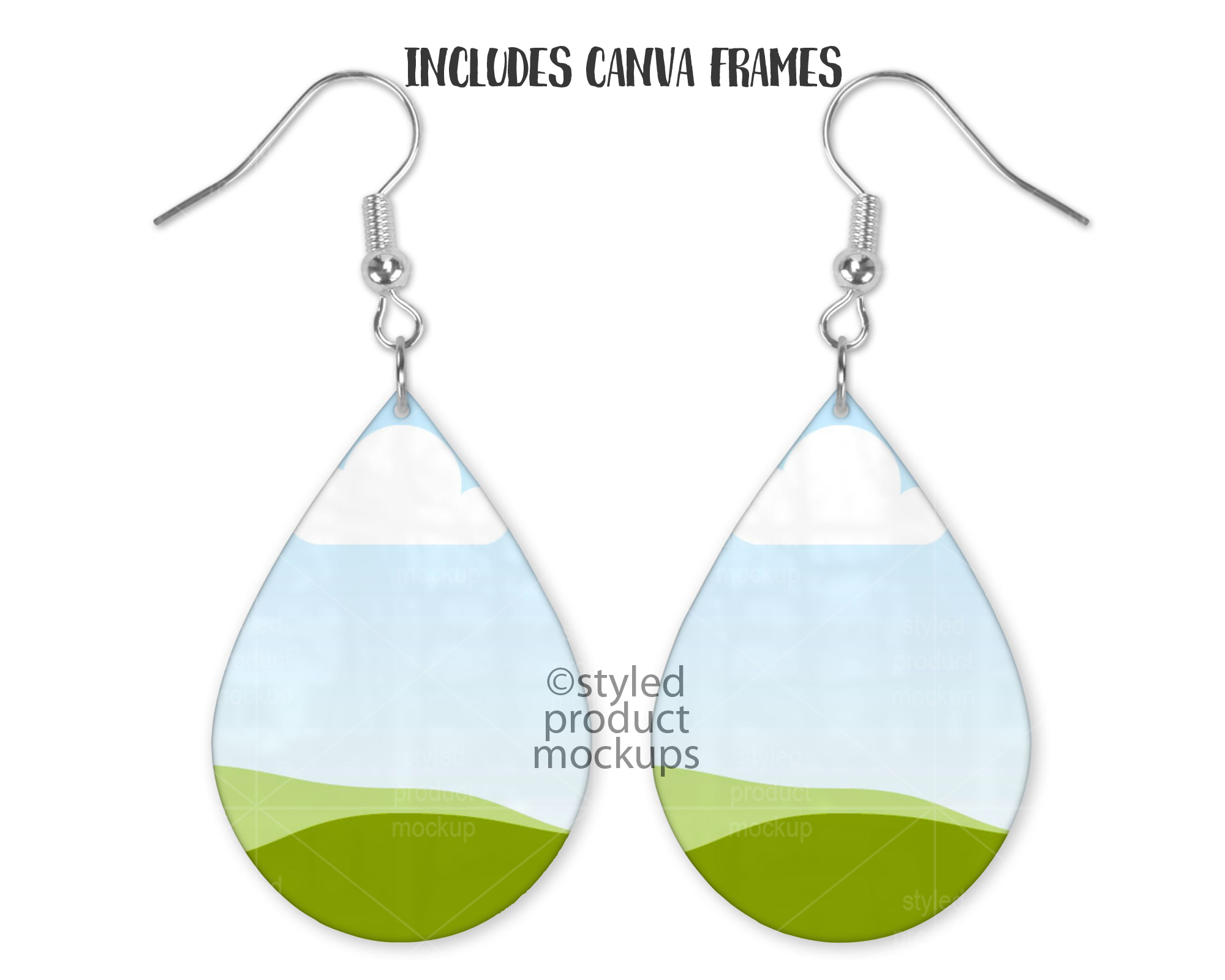 This listing is a mock-up that features a set of dye sublimation teardrop shaped earrings. Give a professional touch to your earring designs without the hassle of photographing each one. Our template is ready to use, simply add in your own art files and background.