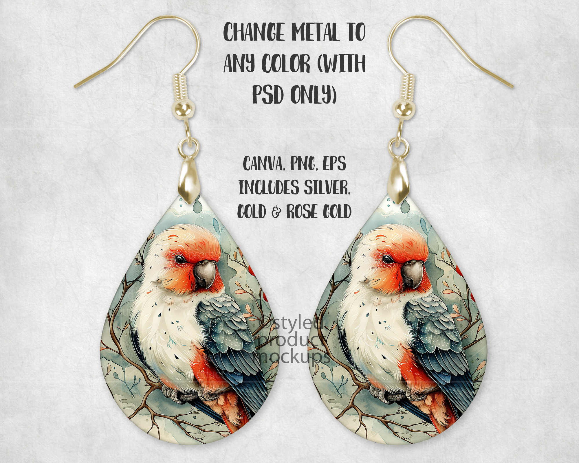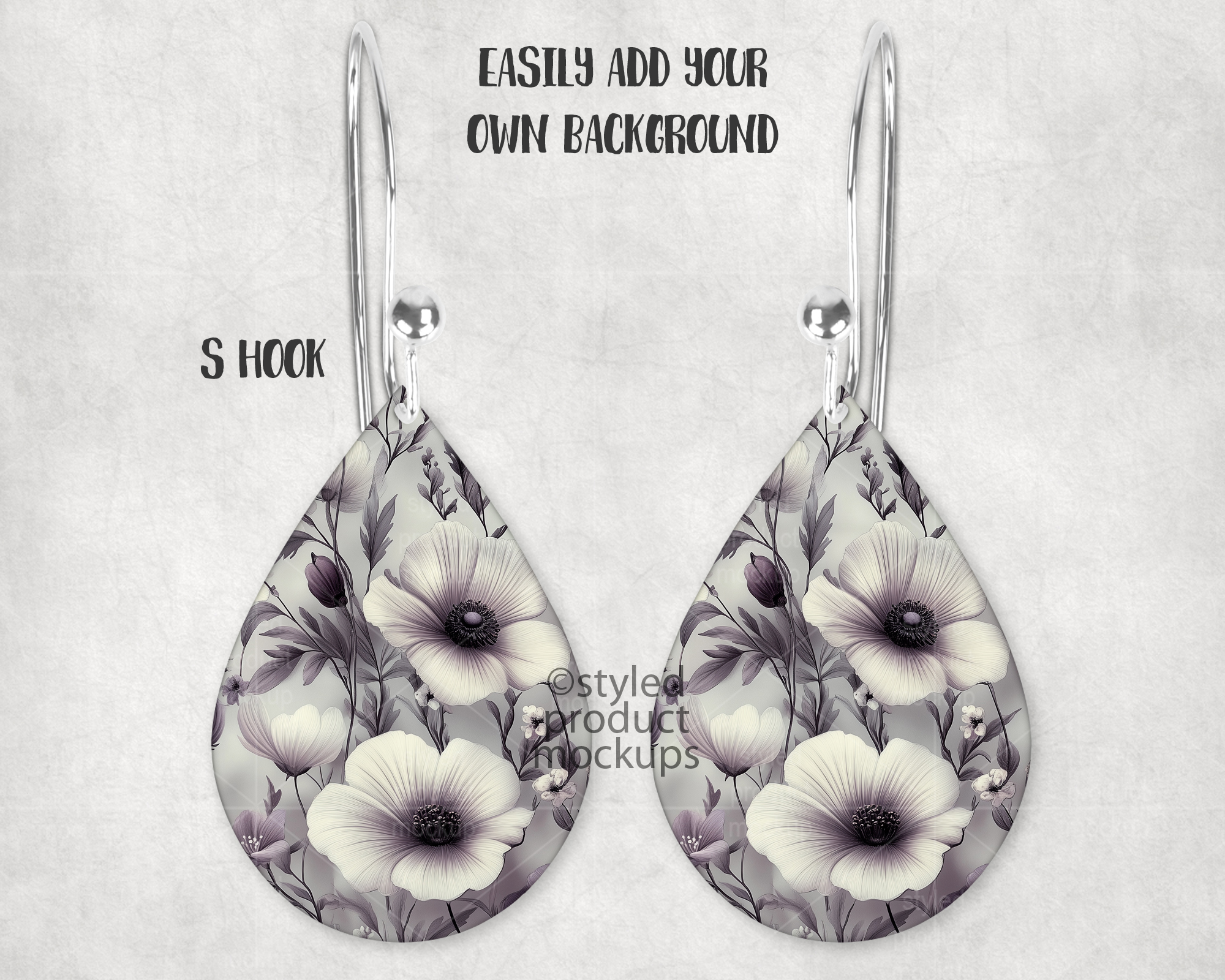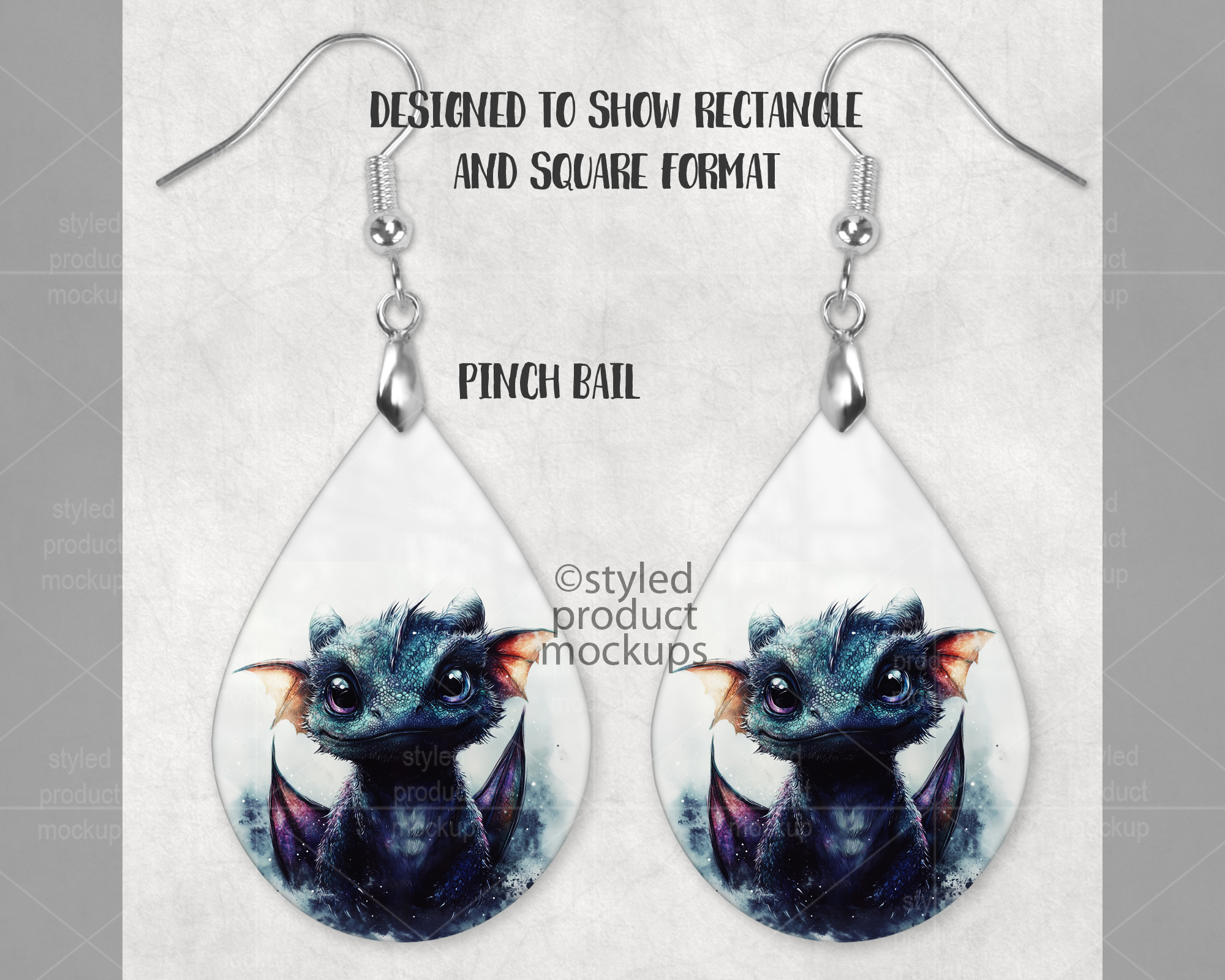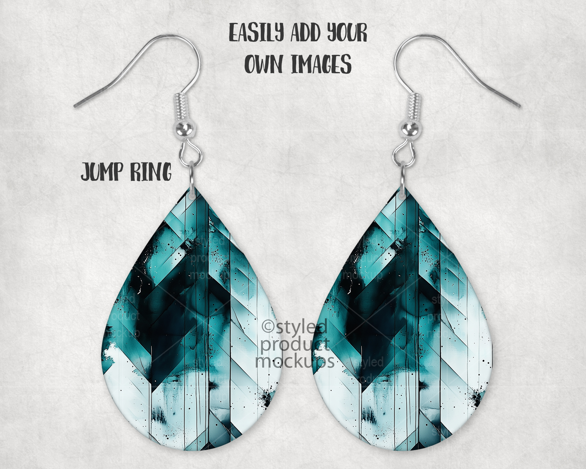 This listing is a mock-up that features a set of dye sublimation teardrop shaped earrings. Give a professional touch to your earring designs without the hassle of photographing each one. Our template is ready to use, simply add in your own art files and background.