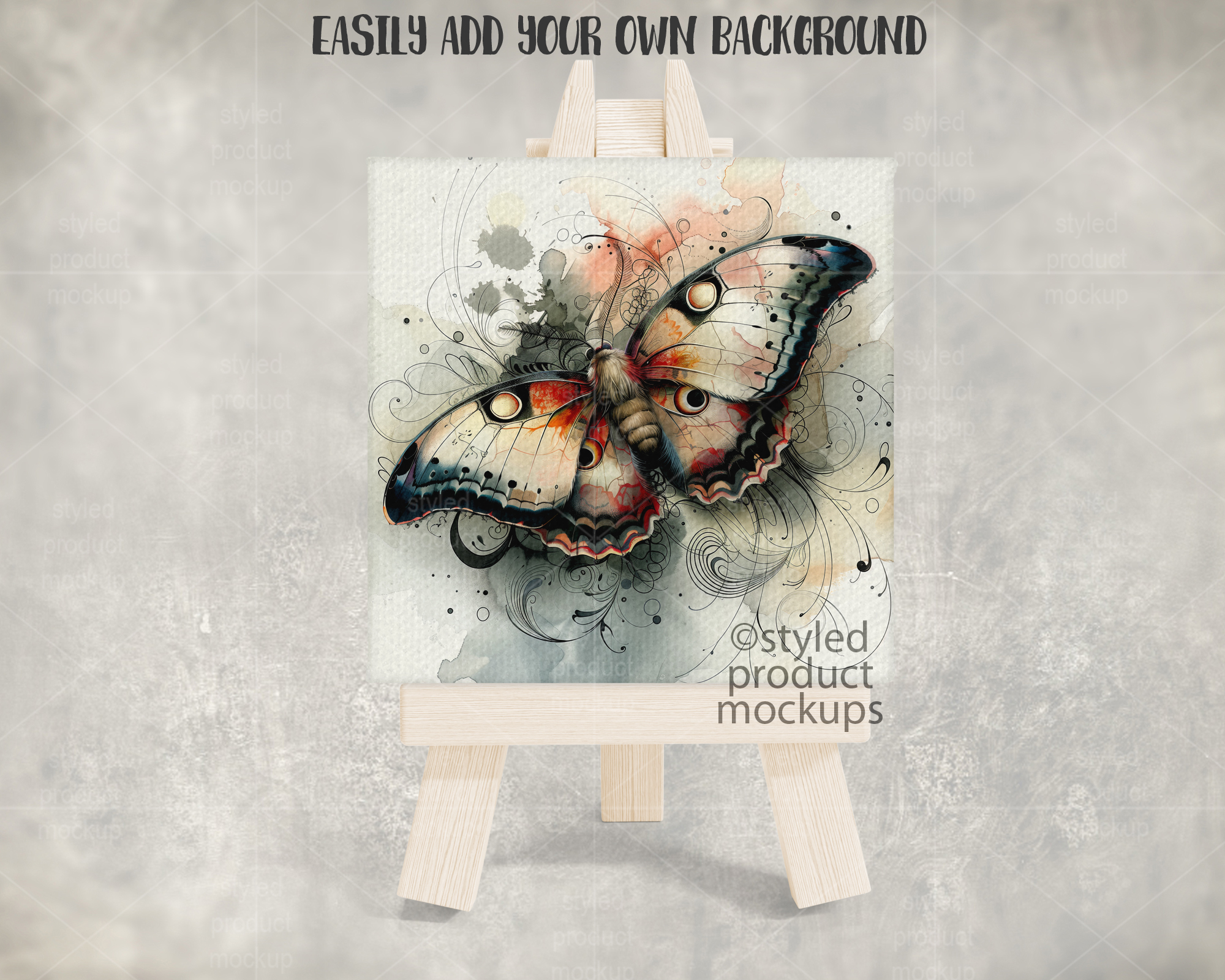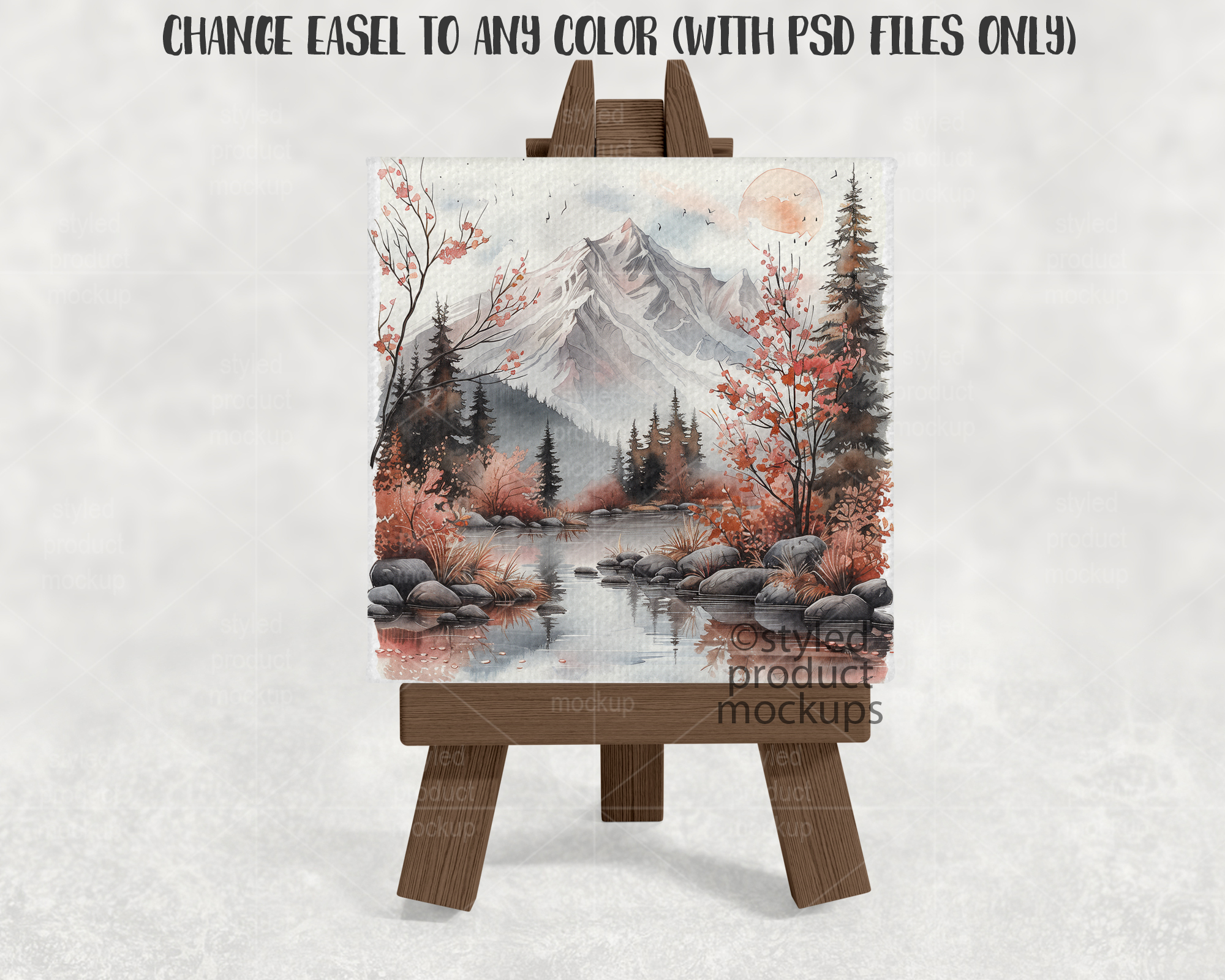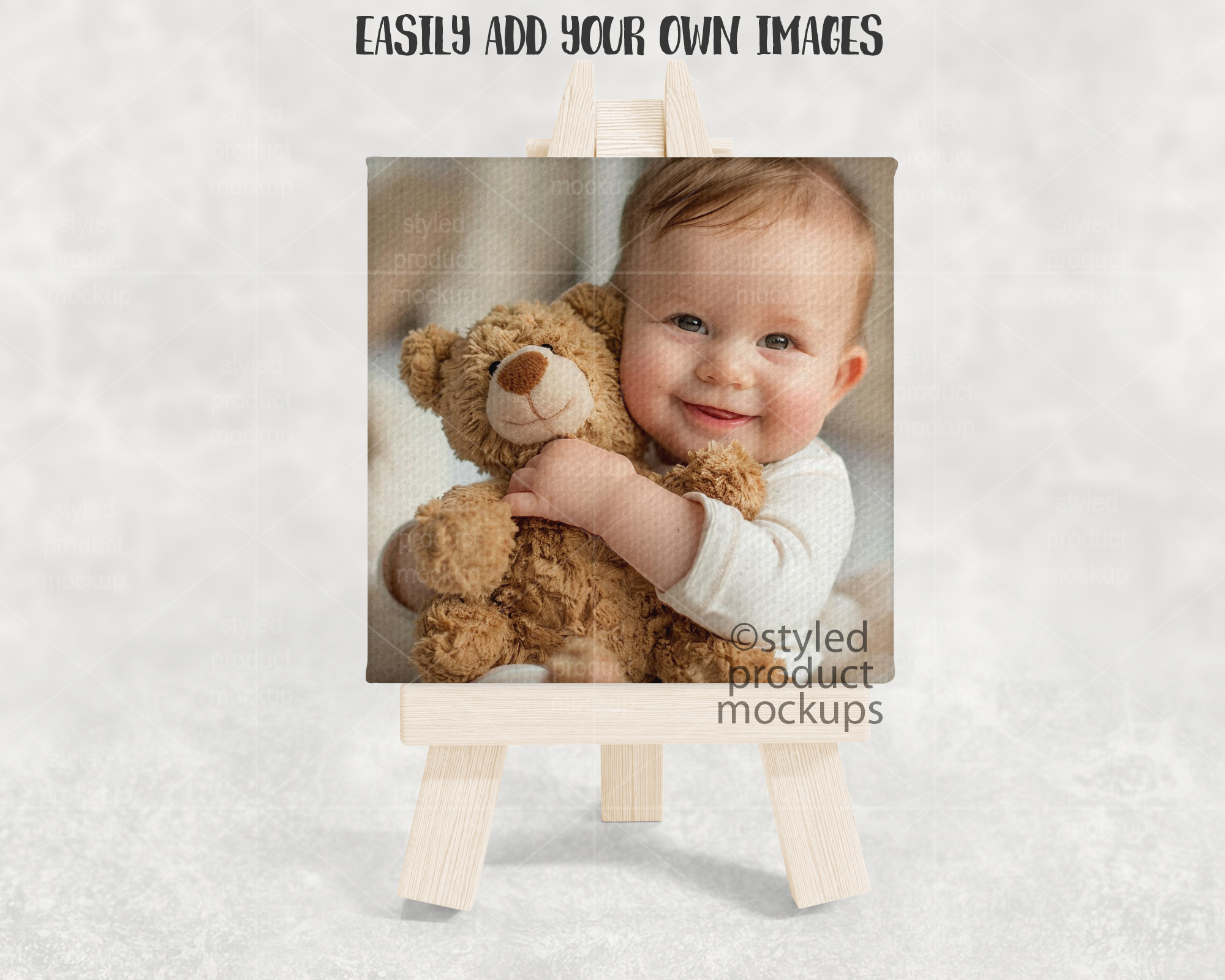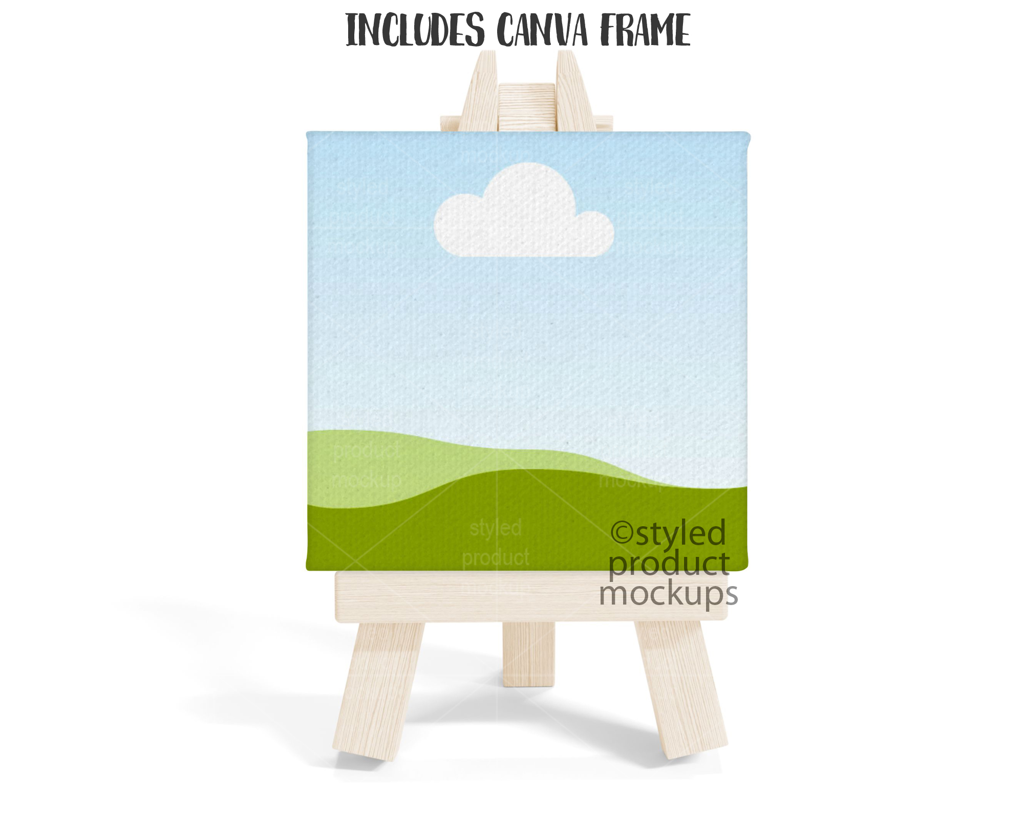 This listing is a mock-up that features a mini canvas print shown on a wood easel. Give a professional touch to your canvas picture designs without the hassle of photographing each one. This styled product mockups template is ready to use, simply add in your own art files and background.