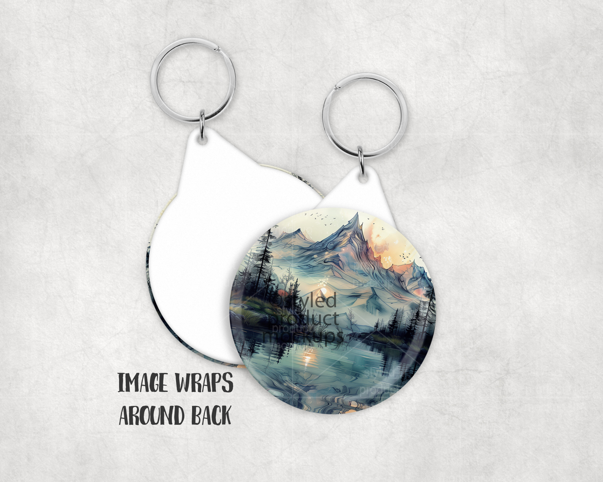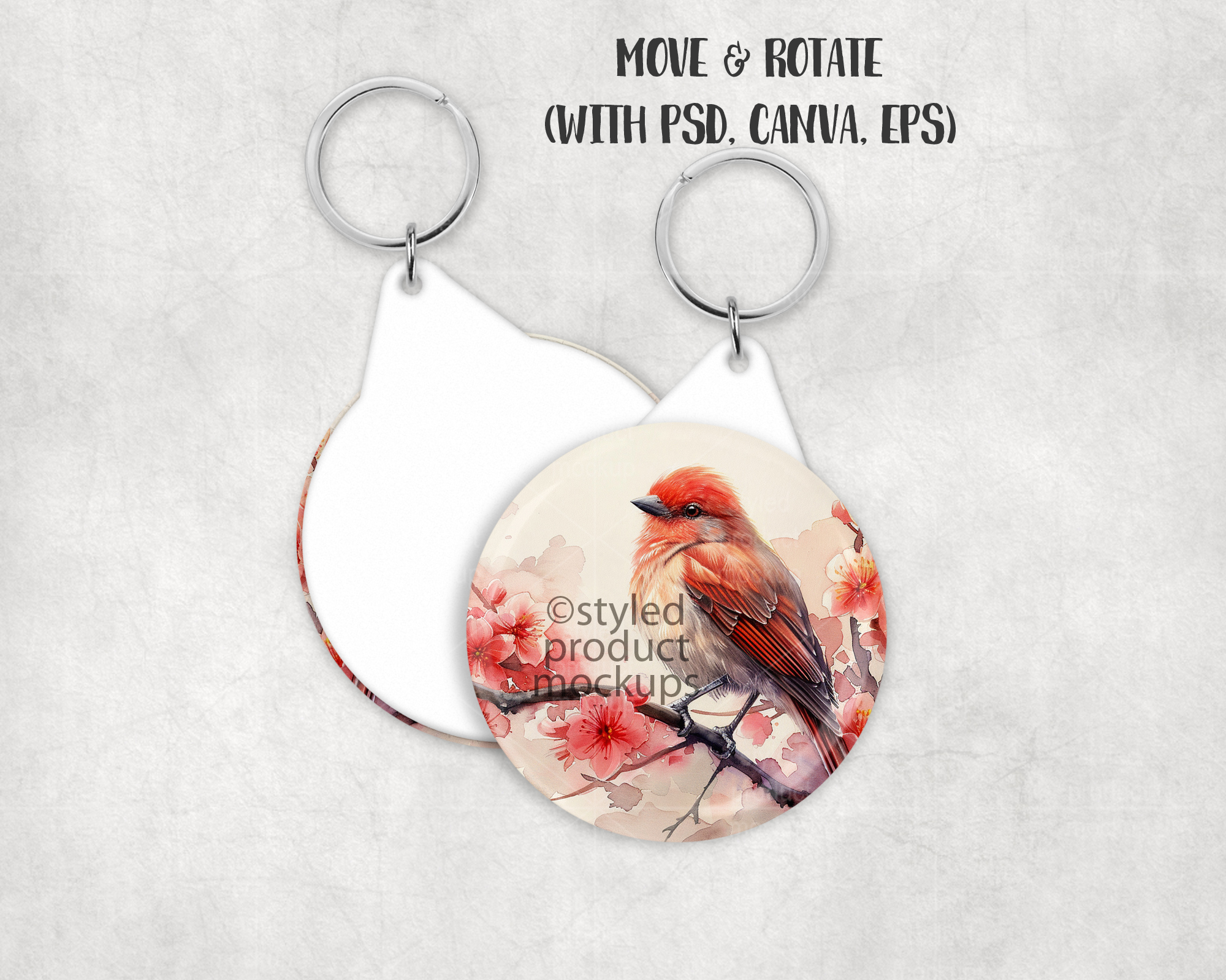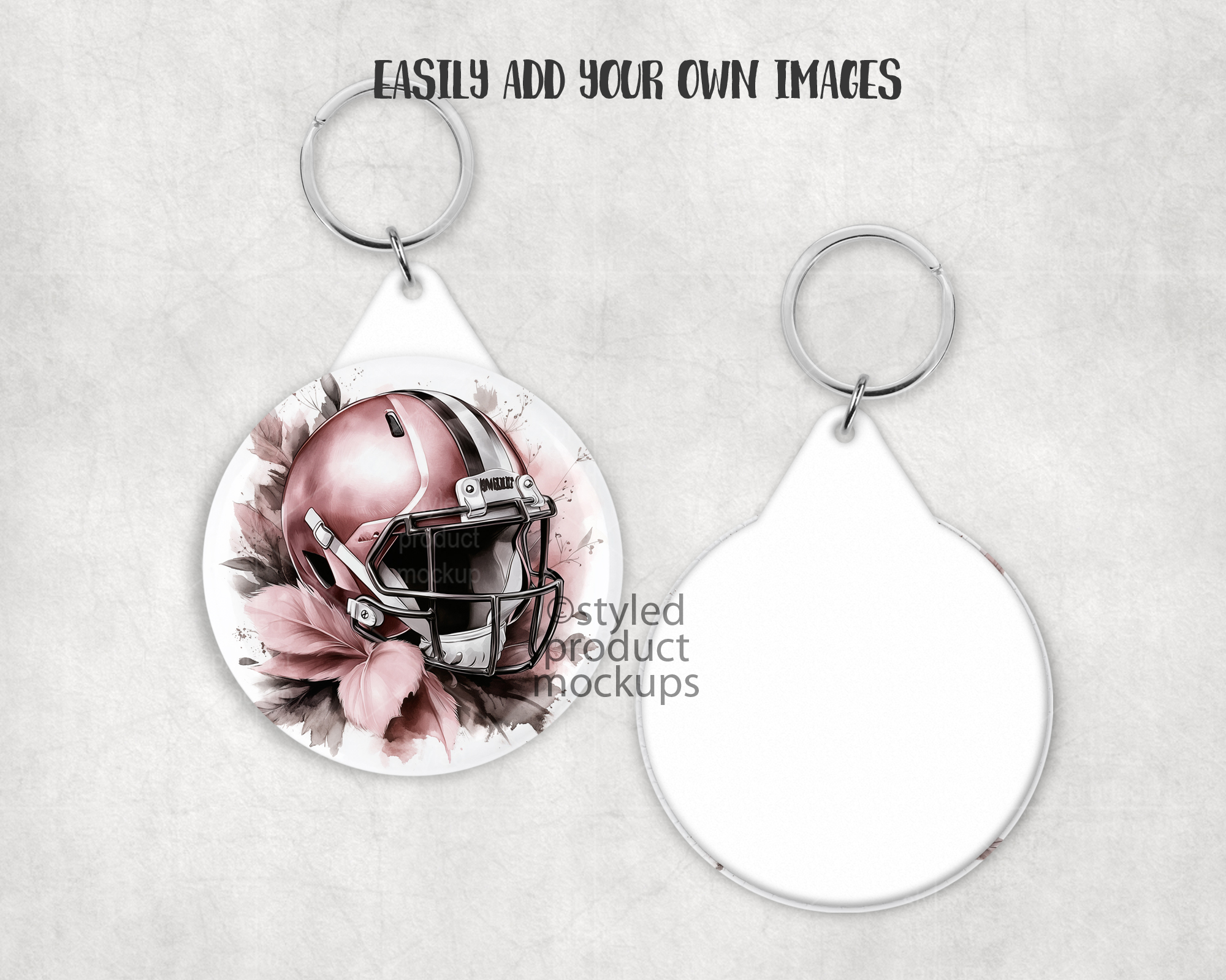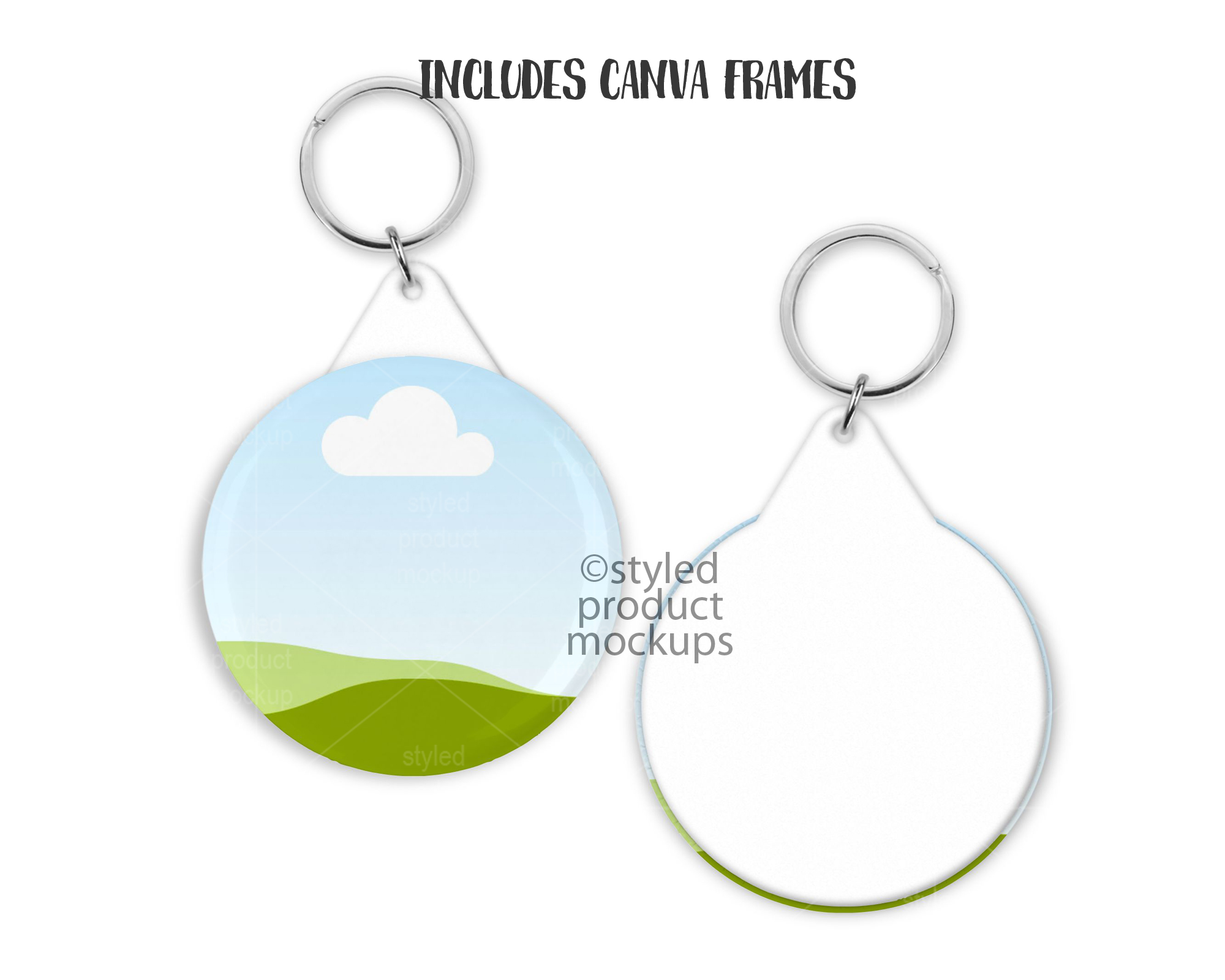 This listing is a mock-up that features the front and back of a plastic back button key ring. Give a professional touch to your button keychain designs without the hassle of photographing each one. Our template is ready to use, simply add in your own art files and background.